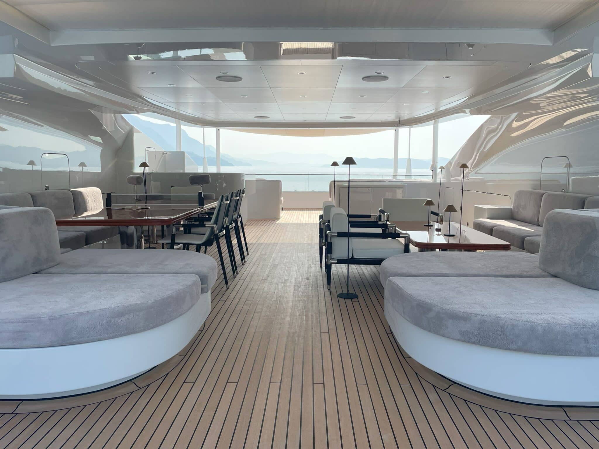 Furthermore, Immersive’s outdoor spaces offer an unparalleled lifestyle on the open waters. The main deck aft, upper deck aft, and sun deck provide various settings. Additionally, the sun deck, in particular, with its jacuzzi, shaded dining area, and eye-catching 13m Ocean 43 Goldfish chase boat, exemplifies the yacht’s commitment to offering a diverse range of experiences.