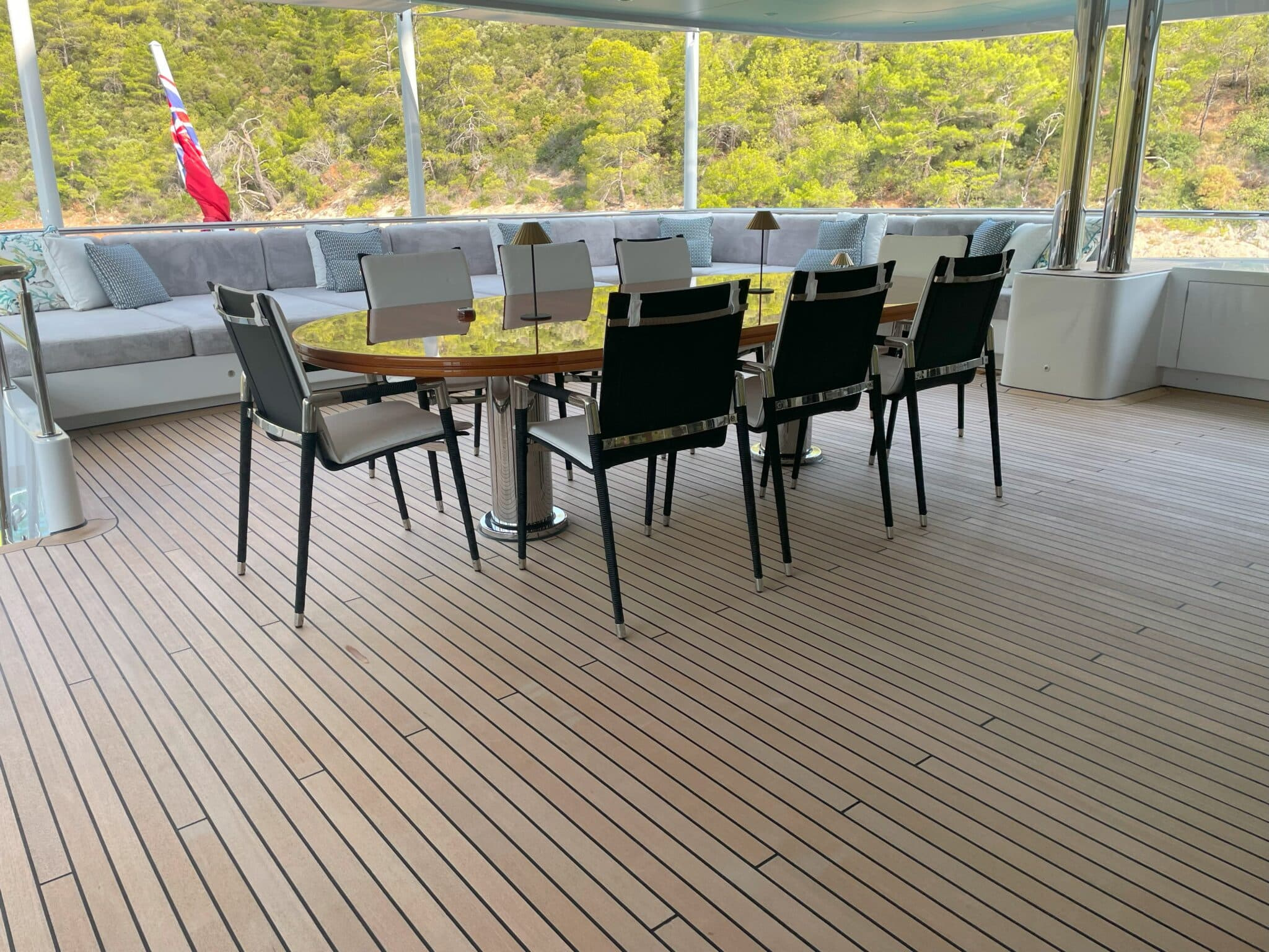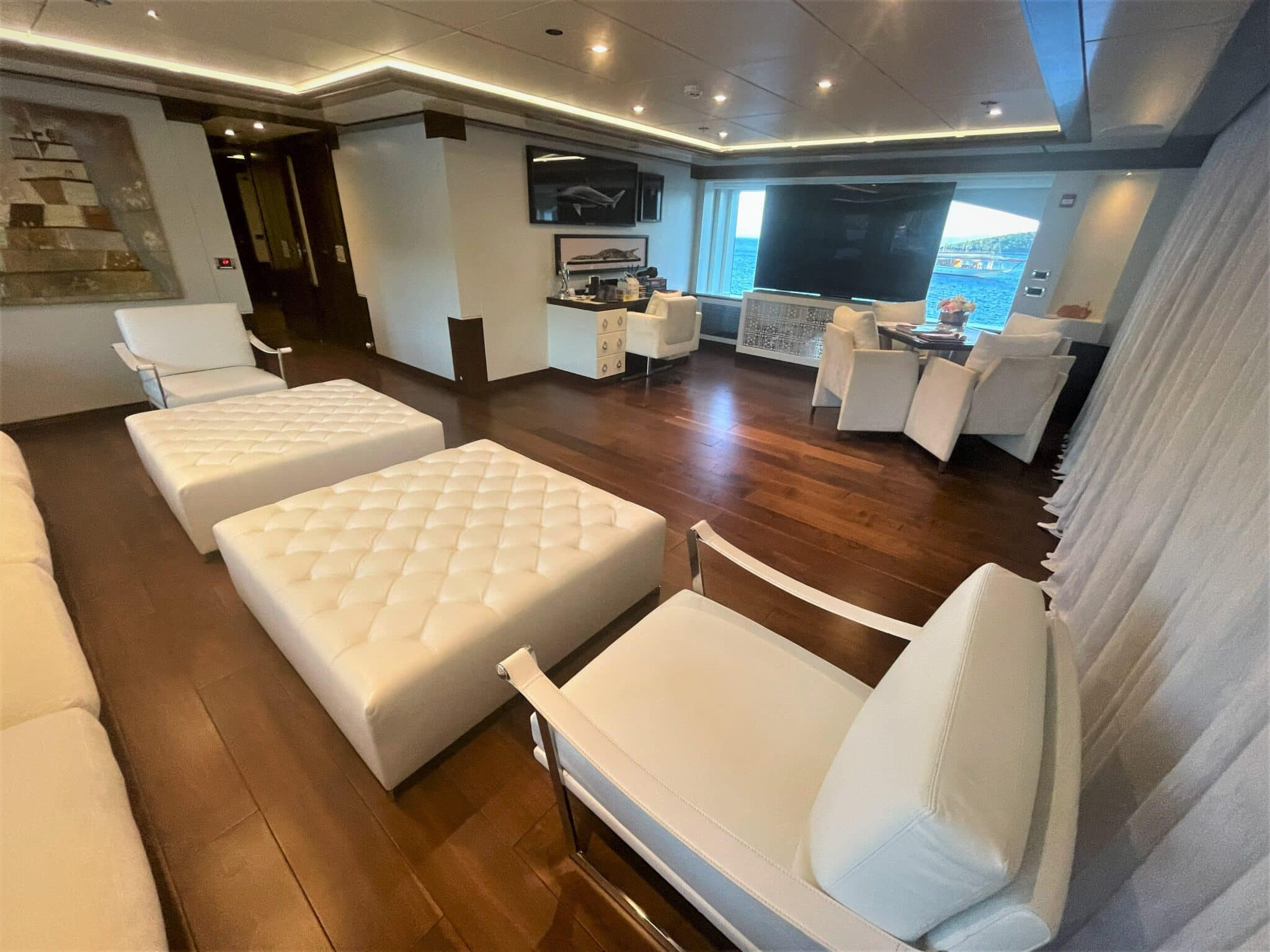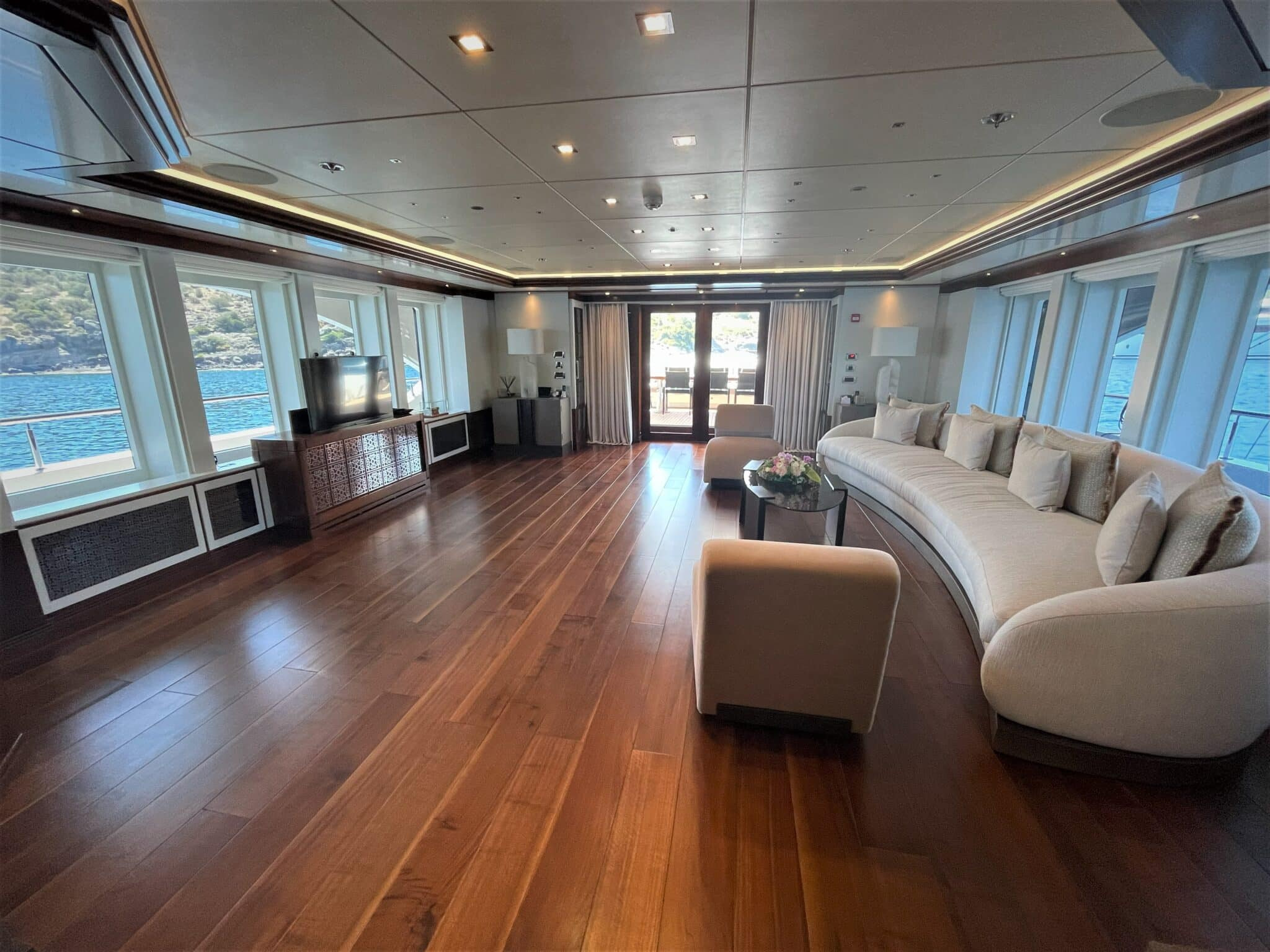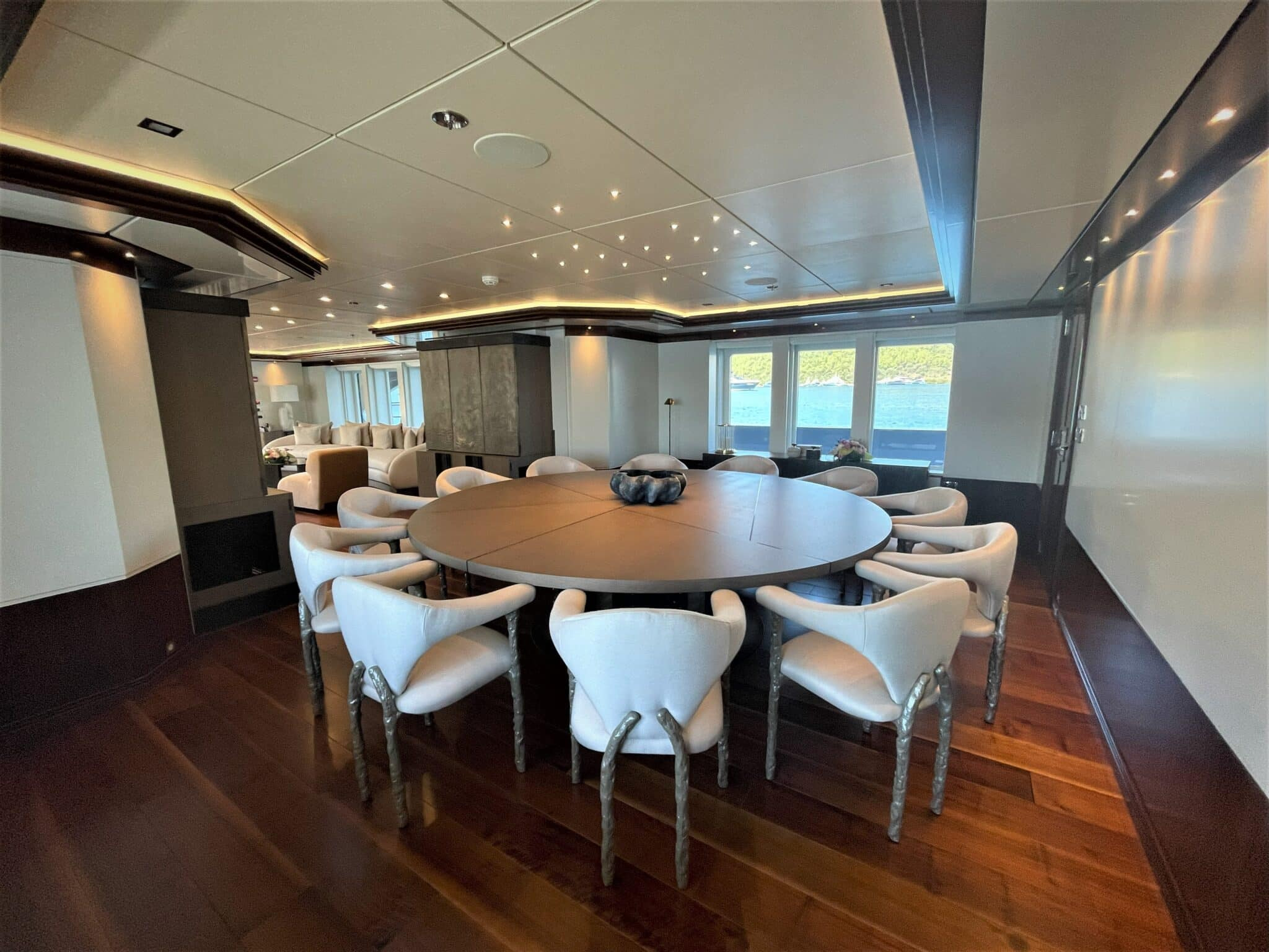 Jean-Guy Verges’ contemporary interior design infuses warmth and sophistication into Immersive’s living spaces. The open-concept layout, contrasting woods, and off-white lacquer pay homage to the yacht’s prestigious Turkish heritage. The large full-beam salon on the main deck offers a comfortable lounge space and a formal dining area with a round table for fourteen, creating a perfect backdrop for the ever-changing ocean views through oversized windows.