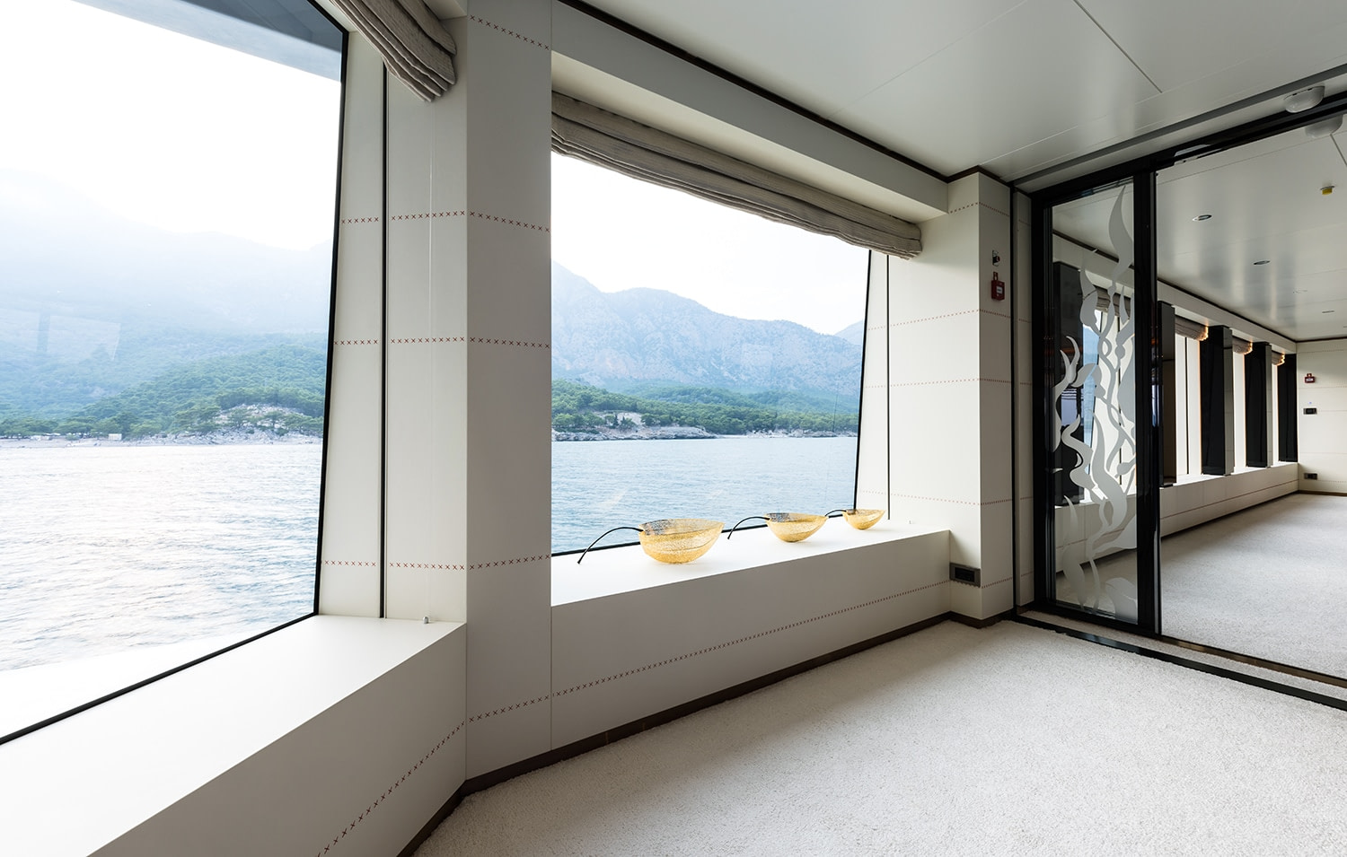 Six cabins in total sleep 12 guests. The full-beam master suite offers luxury and comfort, with oversized windows for maximum light, a finely finished office, a private lounge, his and hers dressing rooms and immaculate bathroom complete with rain shower and free-standing bath. For more space, benefit from a clever design feature with a second main-deck cabin joining with the master at your command to create a vast suite for the principal charterer. This feature is also found below deck with two of the four additional guest cabins combing to create another large private suite. All cabins boast tastefully finished ensuite bathrooms and are decorated with high-grade marble and wood. The Noske-Kaeser Climate Control ensures optimum guest comfort, as does the vessels impressive stability at anchor and underway.