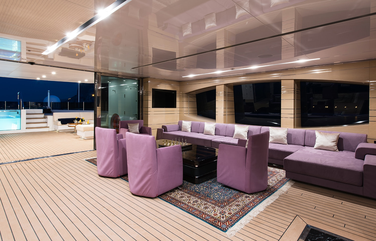 The sun-deck is truly best-in-class. The layout is appealing and social with designer lounge chairs and cabanas for sunbathing or relaxing with a chilled drink in-hand. To the bow you will find the large spa pool and further sun pads, while the middle of the deck is occupied by the open lounge and bar. Climb further up the impressive superstructure to the flybridge for 360 degree views and incredible photos / videos of you luxury charter experience.