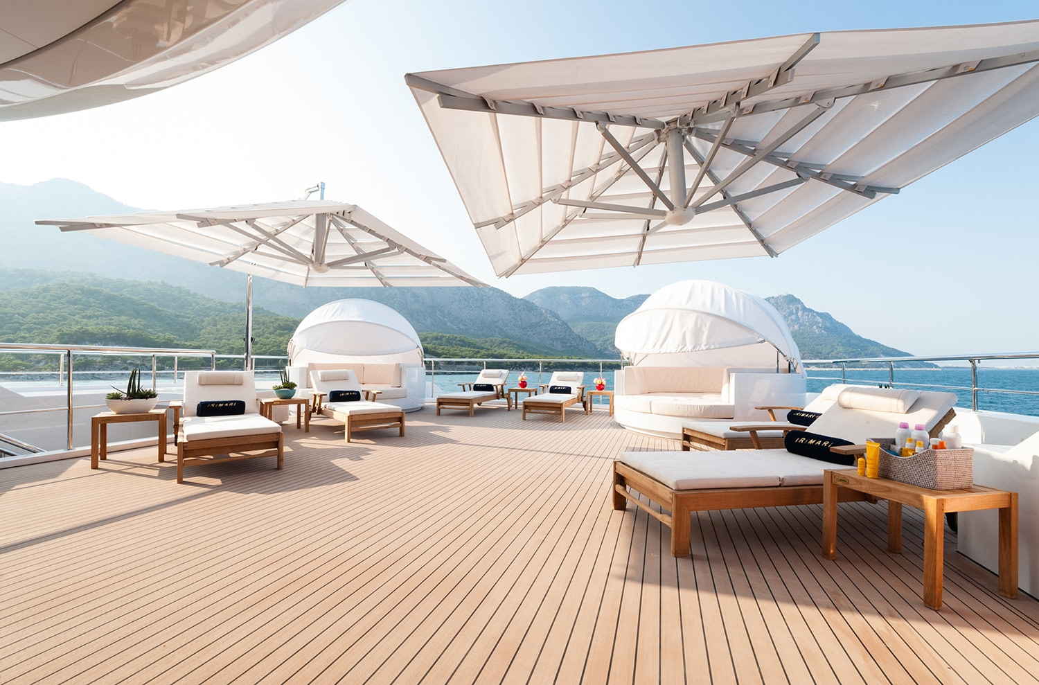 With approximately 685 square metres of deck space spread across three decks, 2015 delivered 63-metre Sunrise Custom Irimari offers everything you can need in a charter yacht. Comfortably accommodating 12 guests across 6 gorgeous suites and with a highly reputable charter crew of 17, Irimari is perfect for all yacht charter groups.