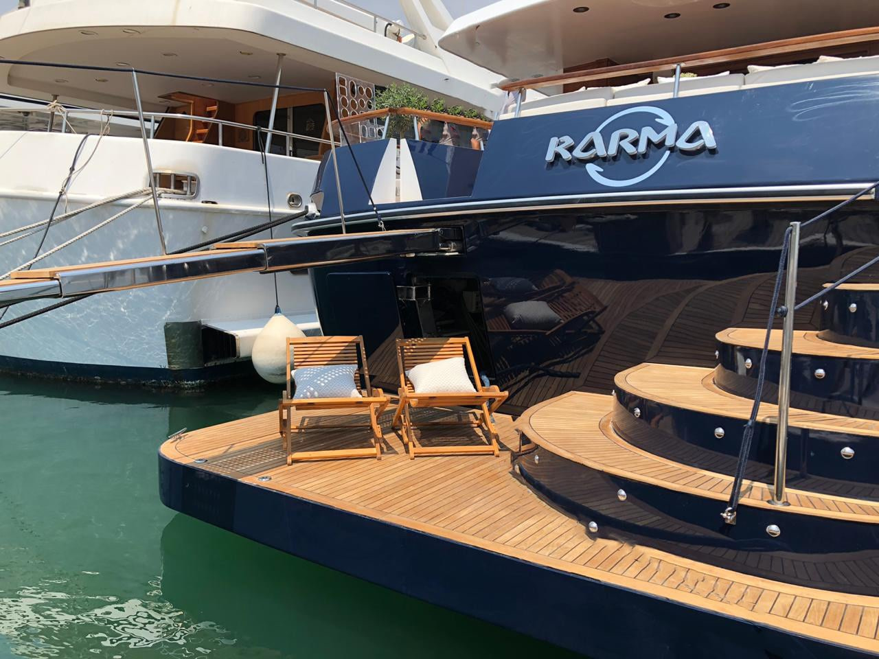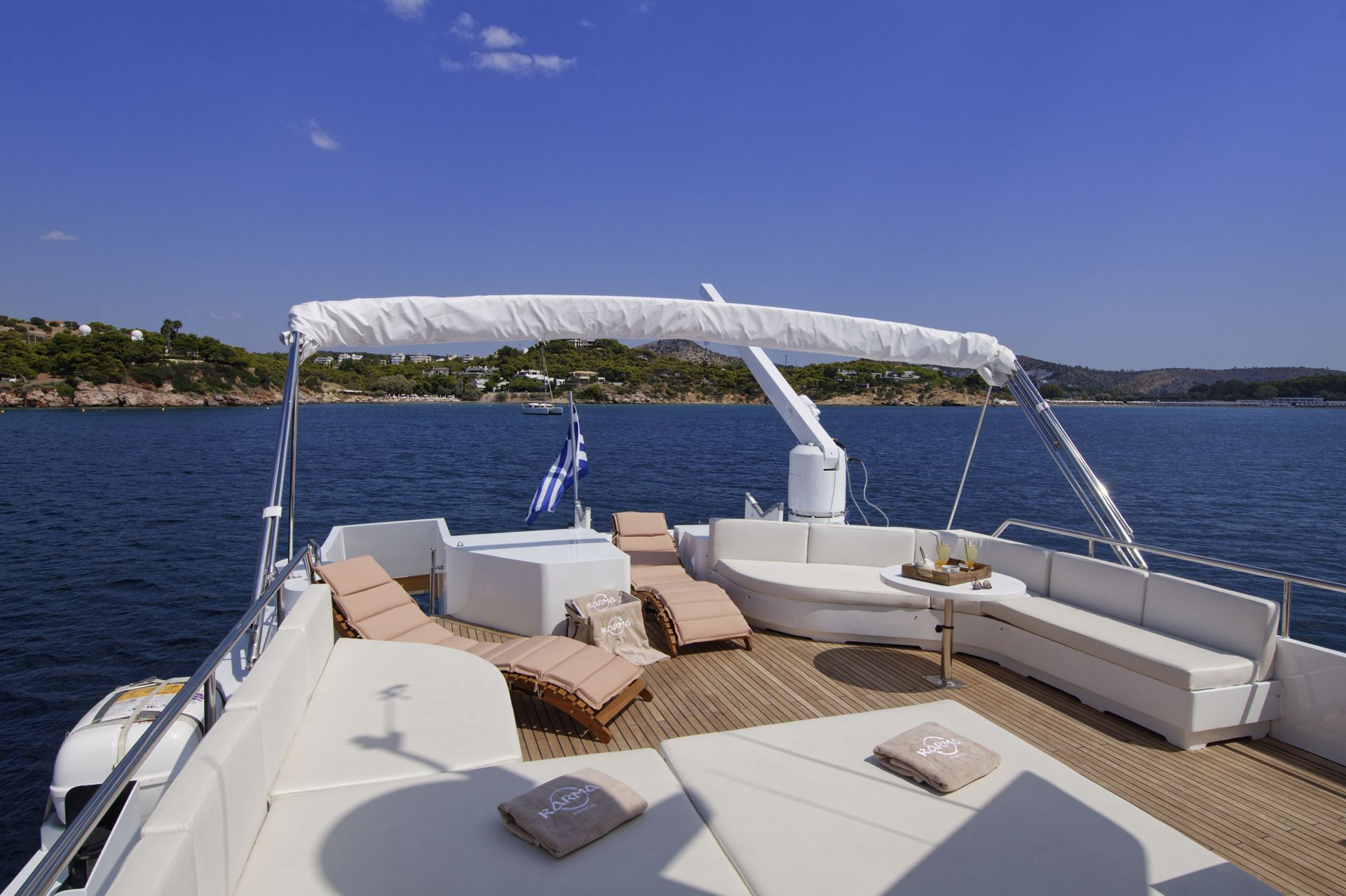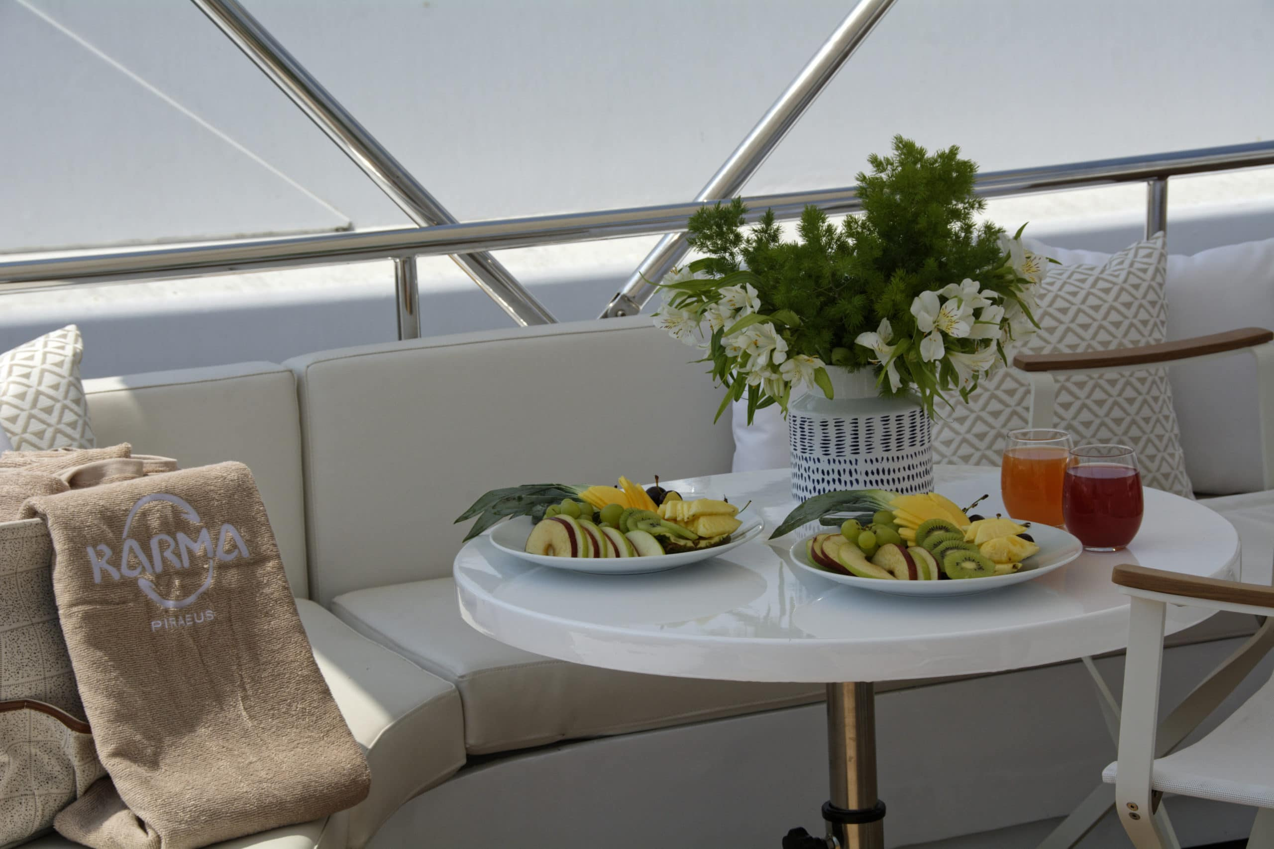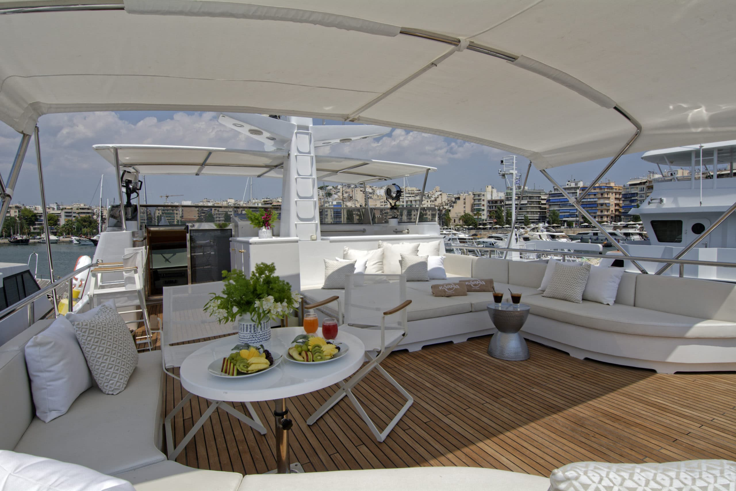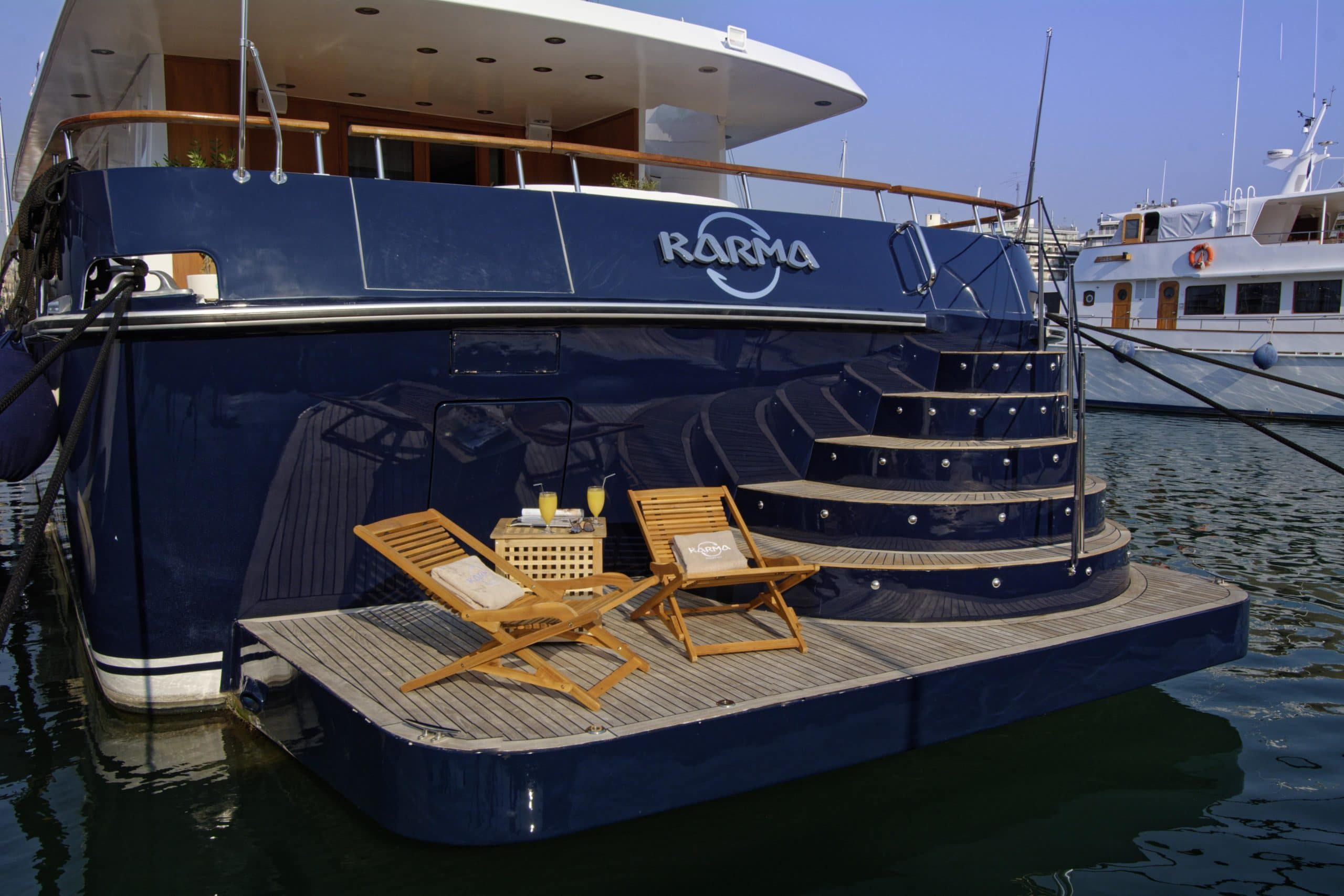 Finally, as if there were not enough outside space, this Karma motor yacht Greece boasts a stunning swim platform with space and seating for guests to enjoy a nice book whilst dipping their feet in the beautifully refreshing sea.