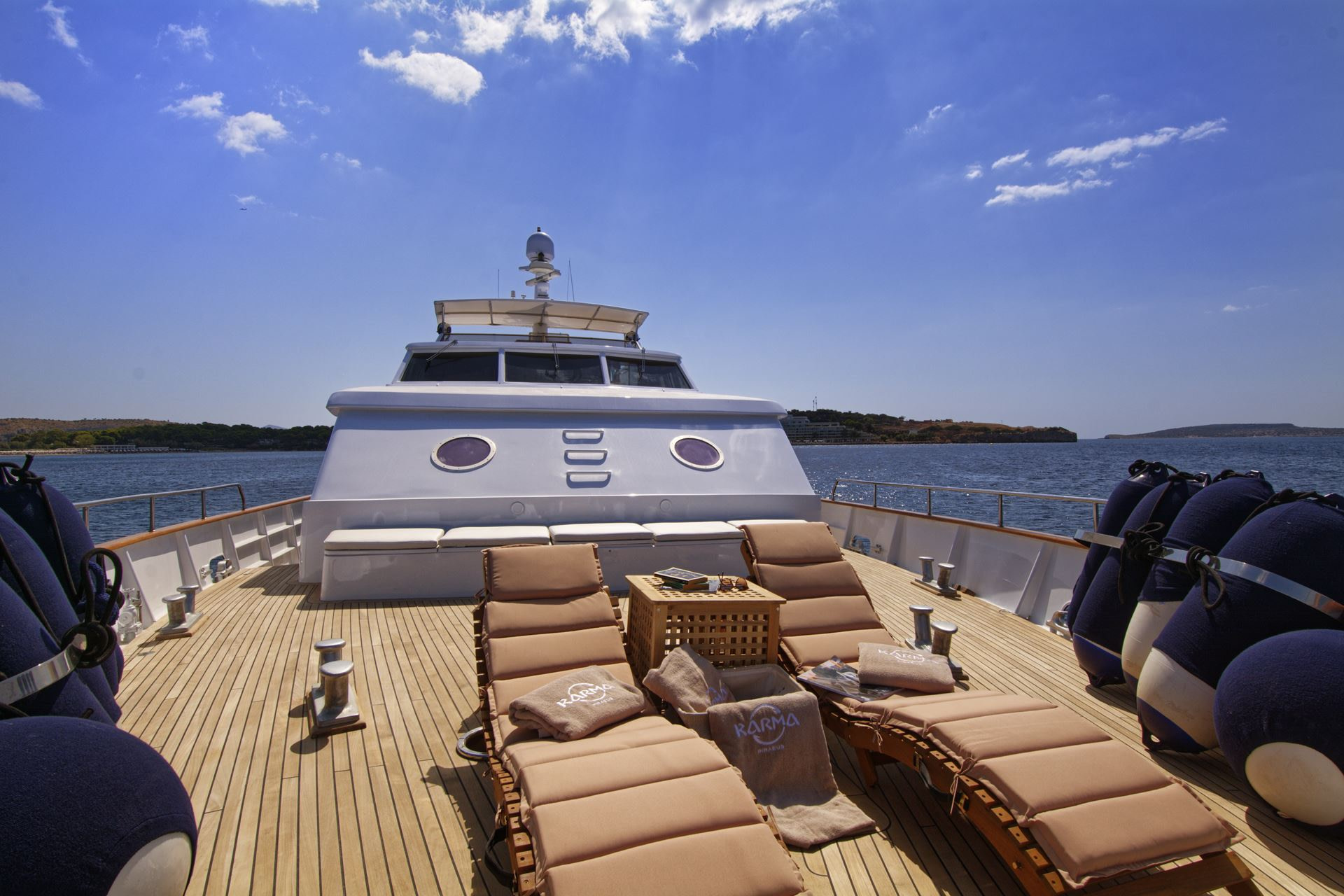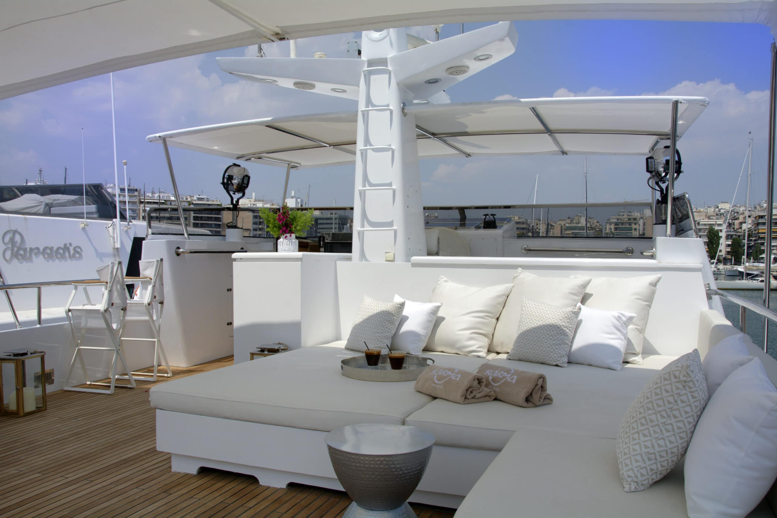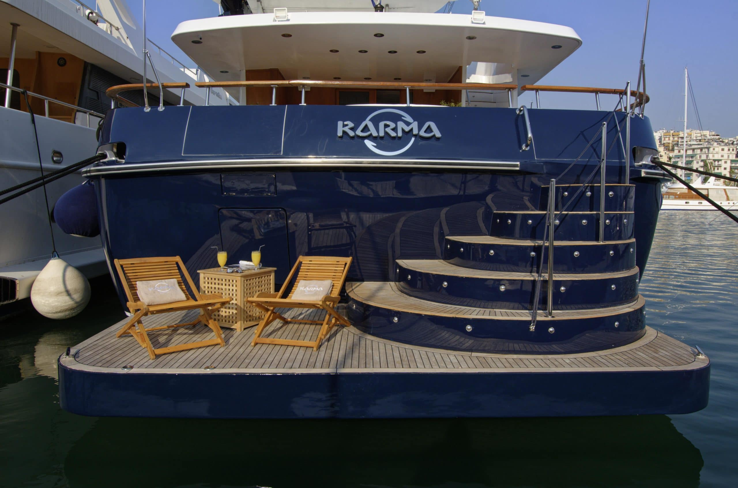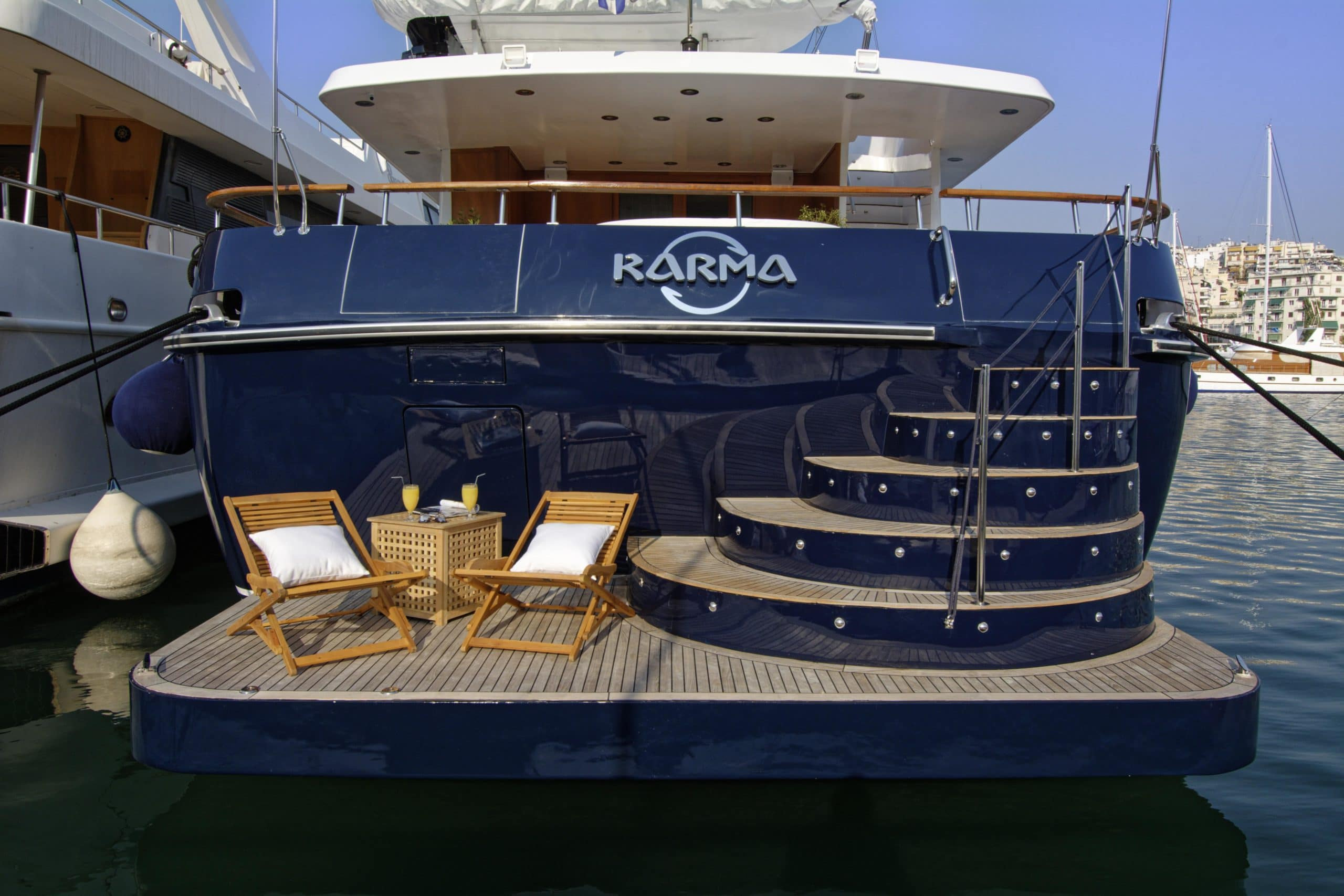 Finally, as if there were not enough outside space, this Karma motor yacht Greece boasts a stunning swim platform with space and seating for guests to enjoy a nice book whilst dipping their feet in the beautifully refreshing sea.