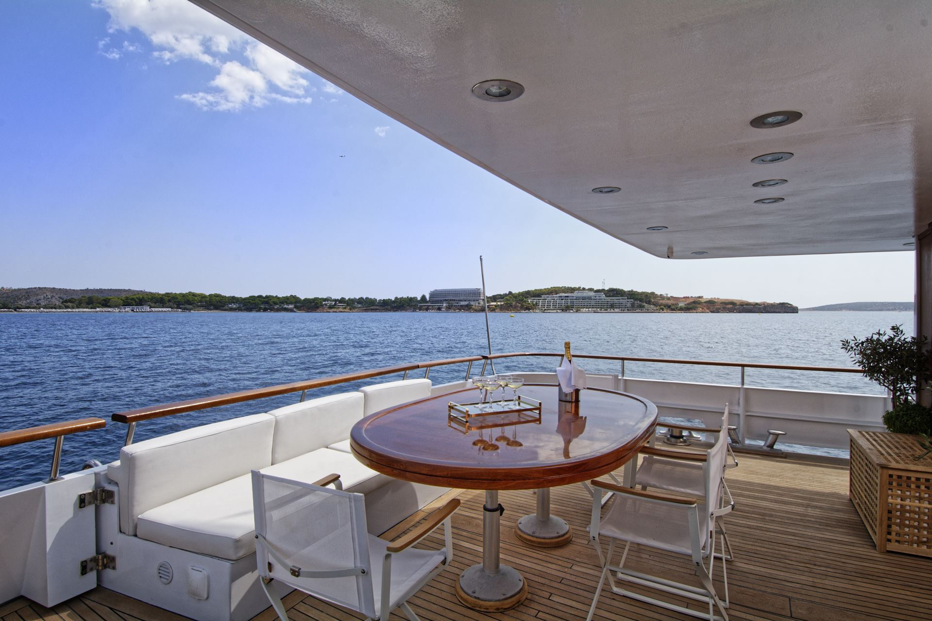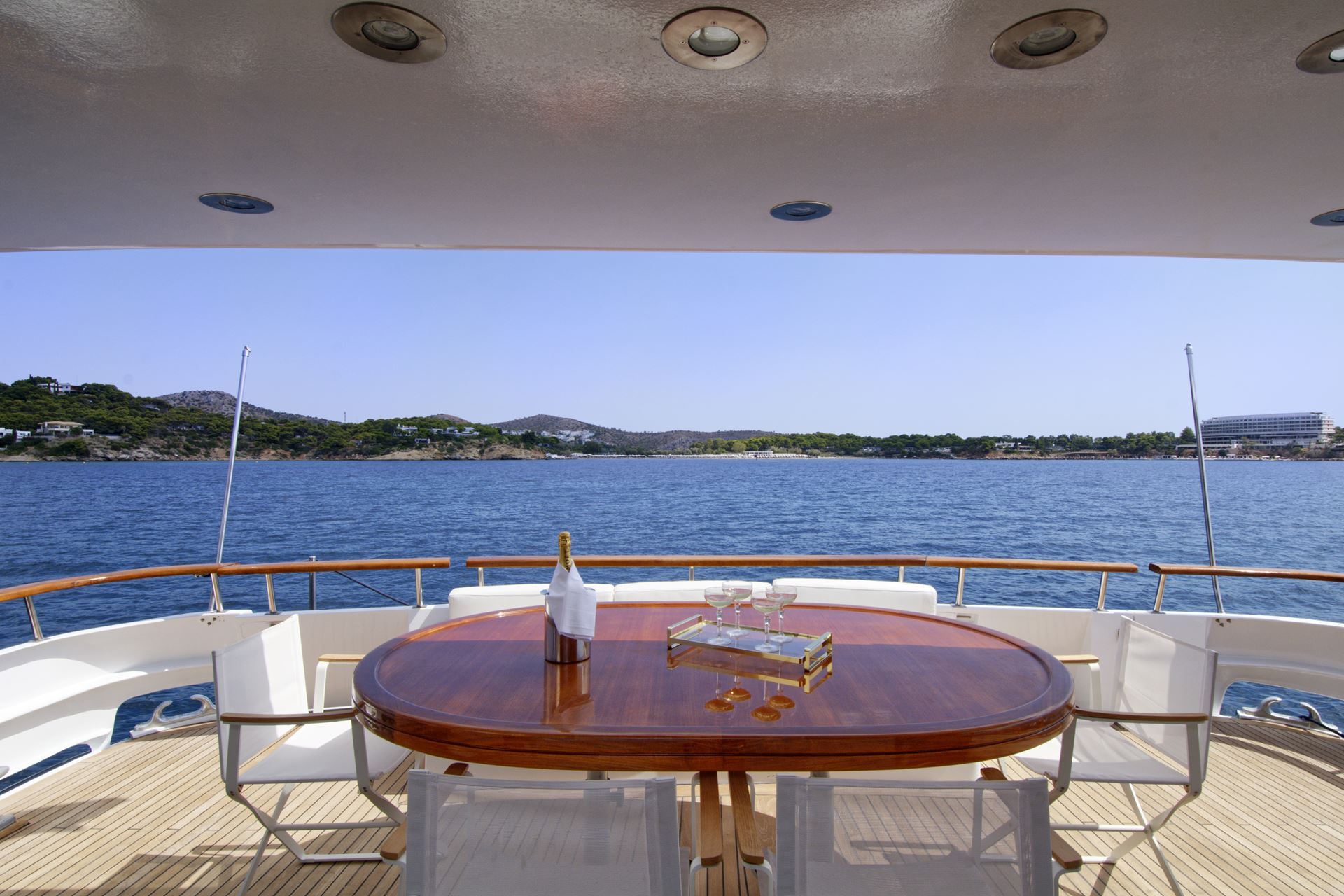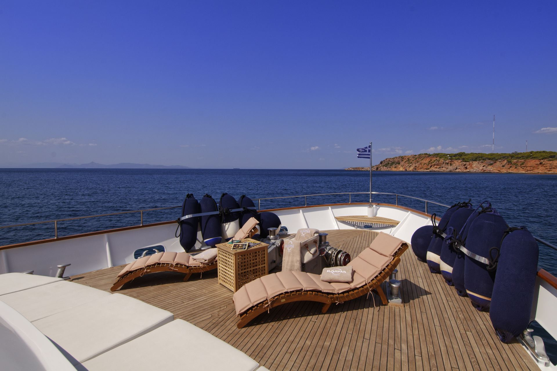 On the bow of this yacht are more sunbeds for guests to relax upon. While surrounded on all sides by the beautiful Greek waters and views that are second to none. The beautiful teak flooring and removable sunbeds here mean that the bow can easily be converted into space for guests to use for yoga or other activities.
