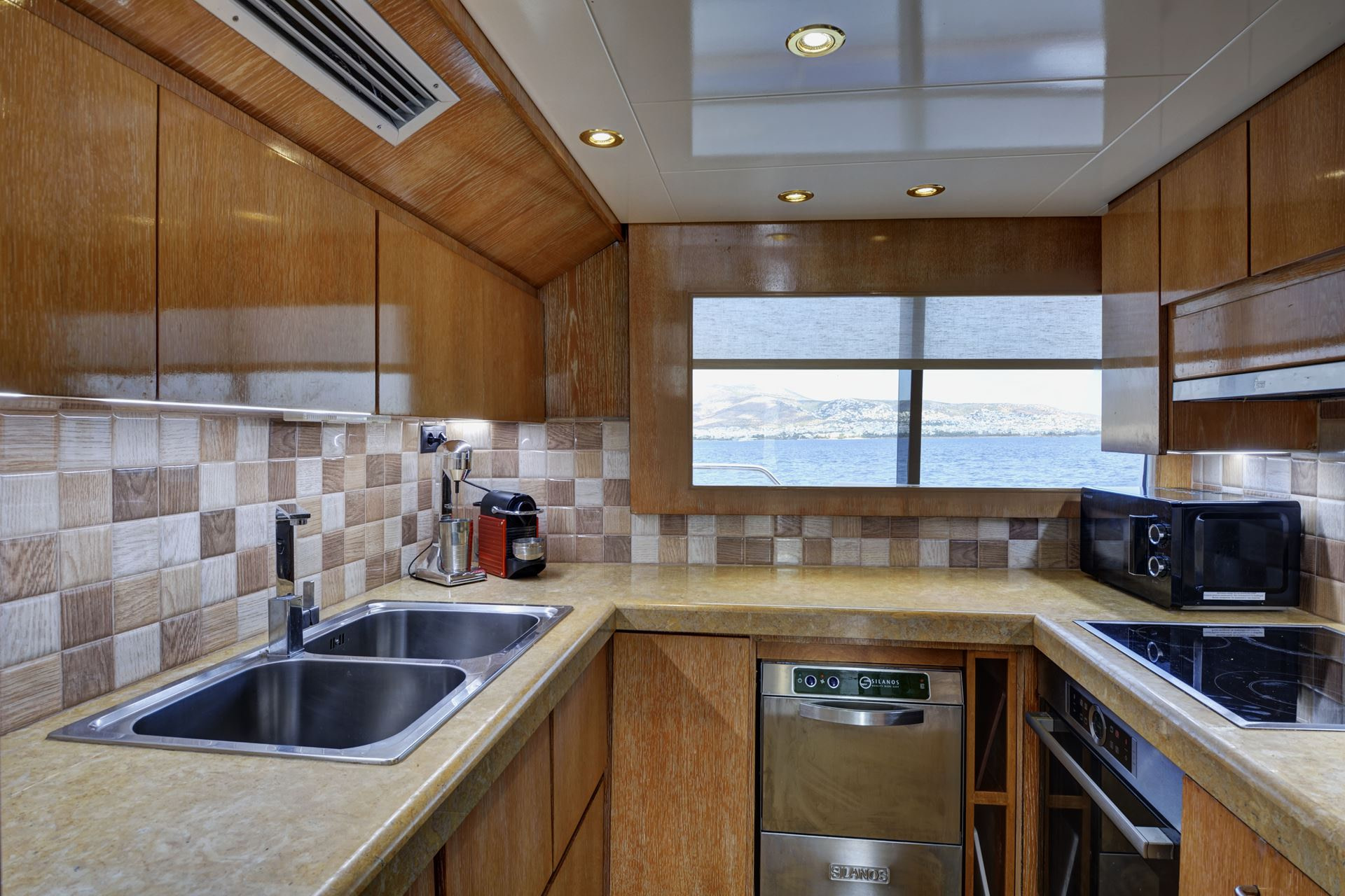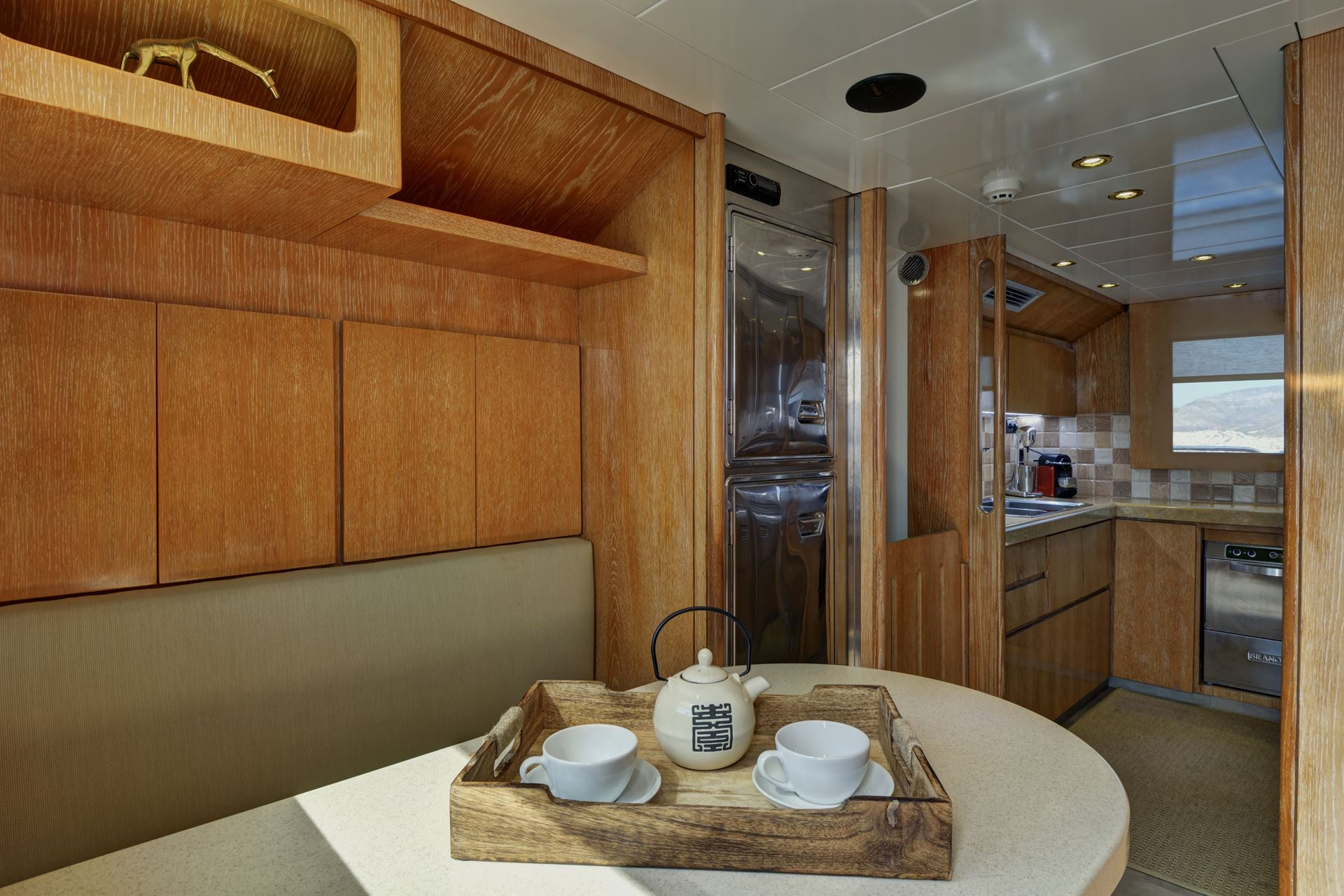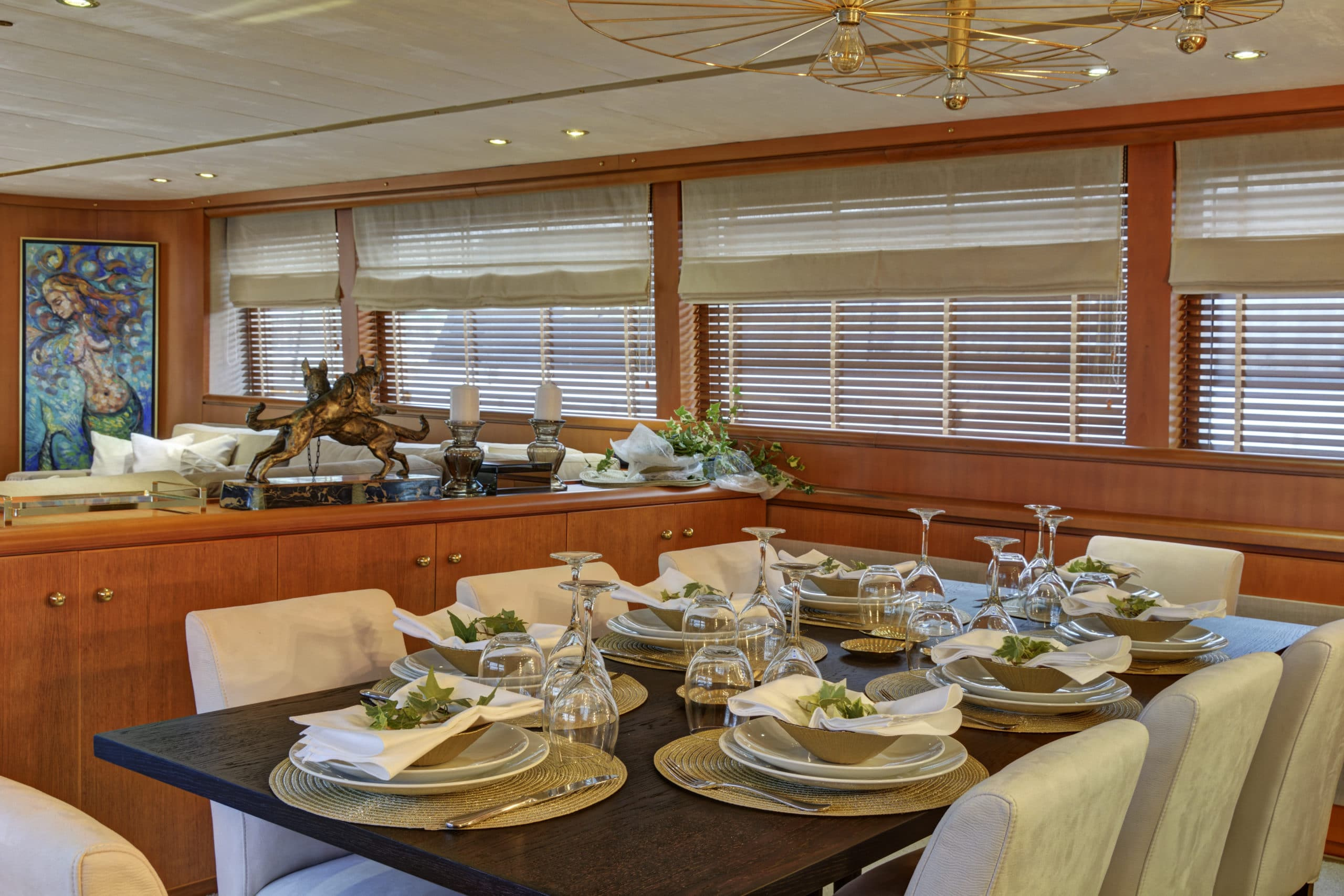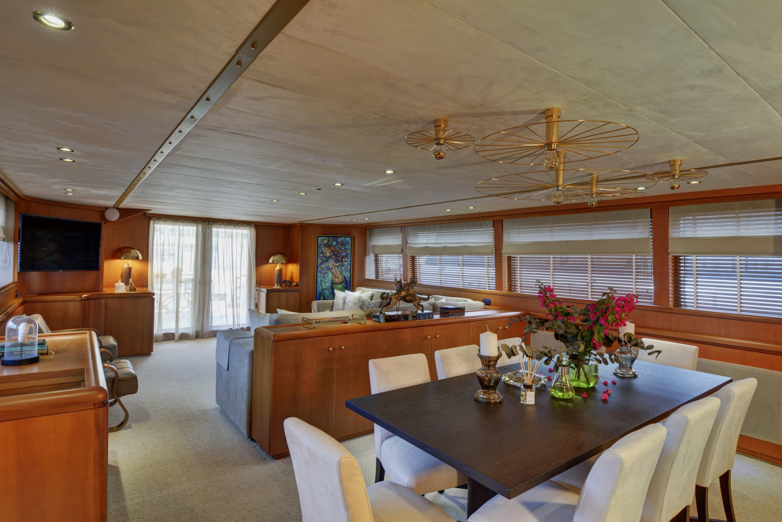On the bow of this yacht are more sunbeds for guests to relax upon. While surrounded on all sides by the beautiful Greek waters and views that are second to none. The beautiful teak flooring and removable sunbeds here mean that the bow can easily be converted into space for guests to use for yoga or other activities.