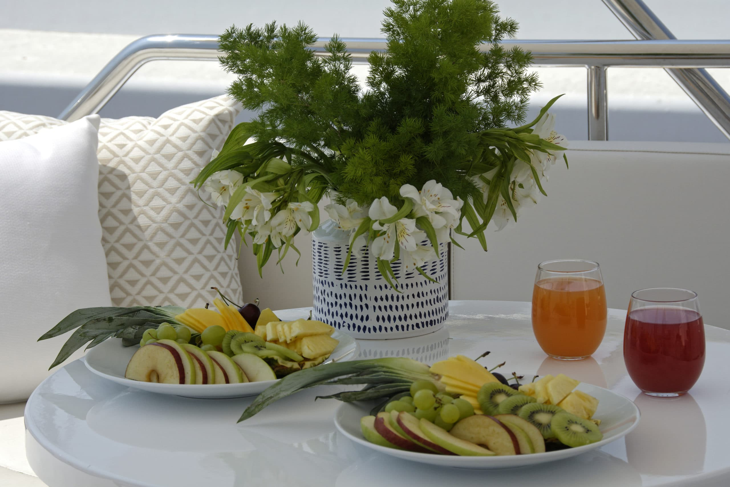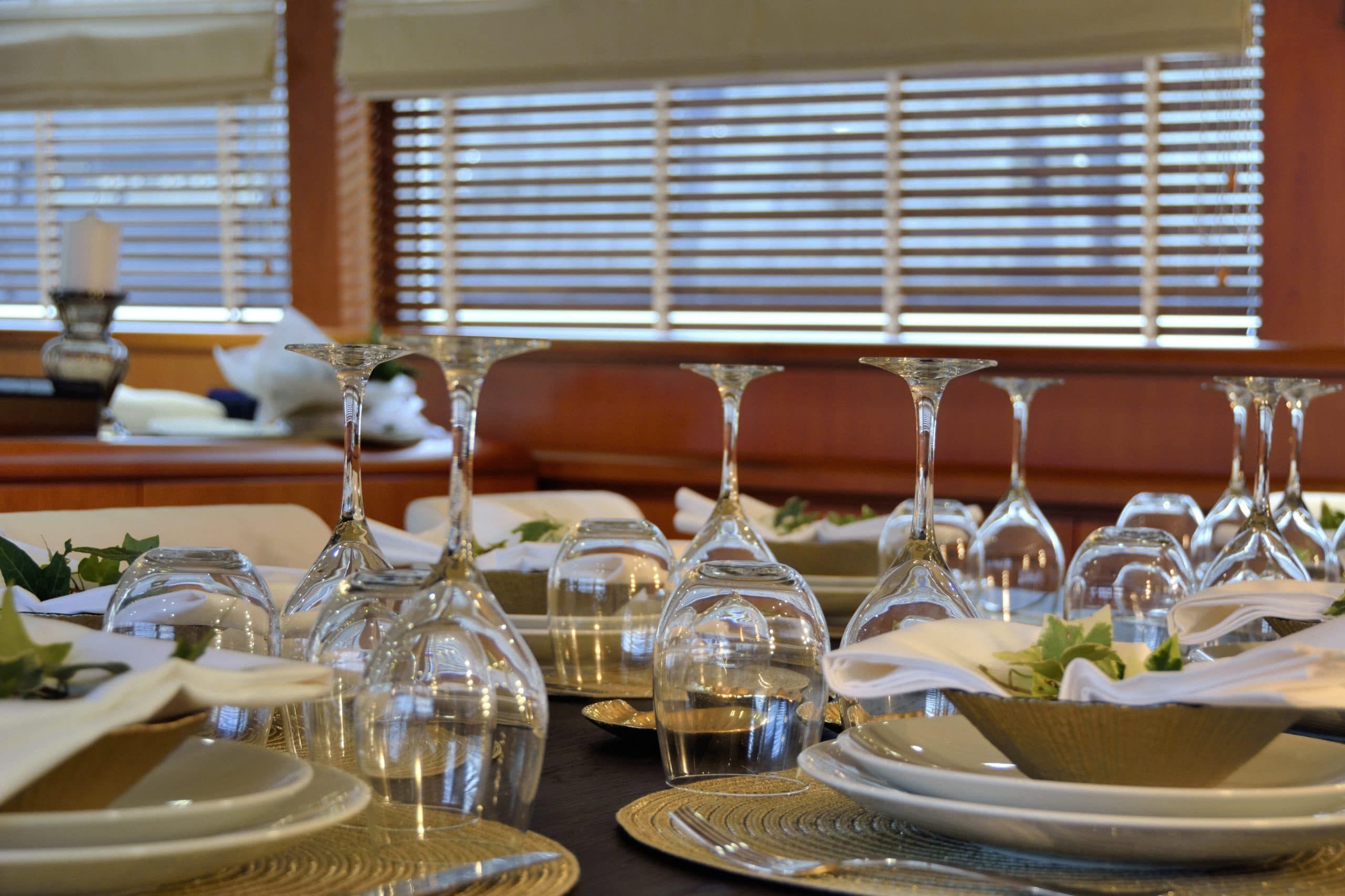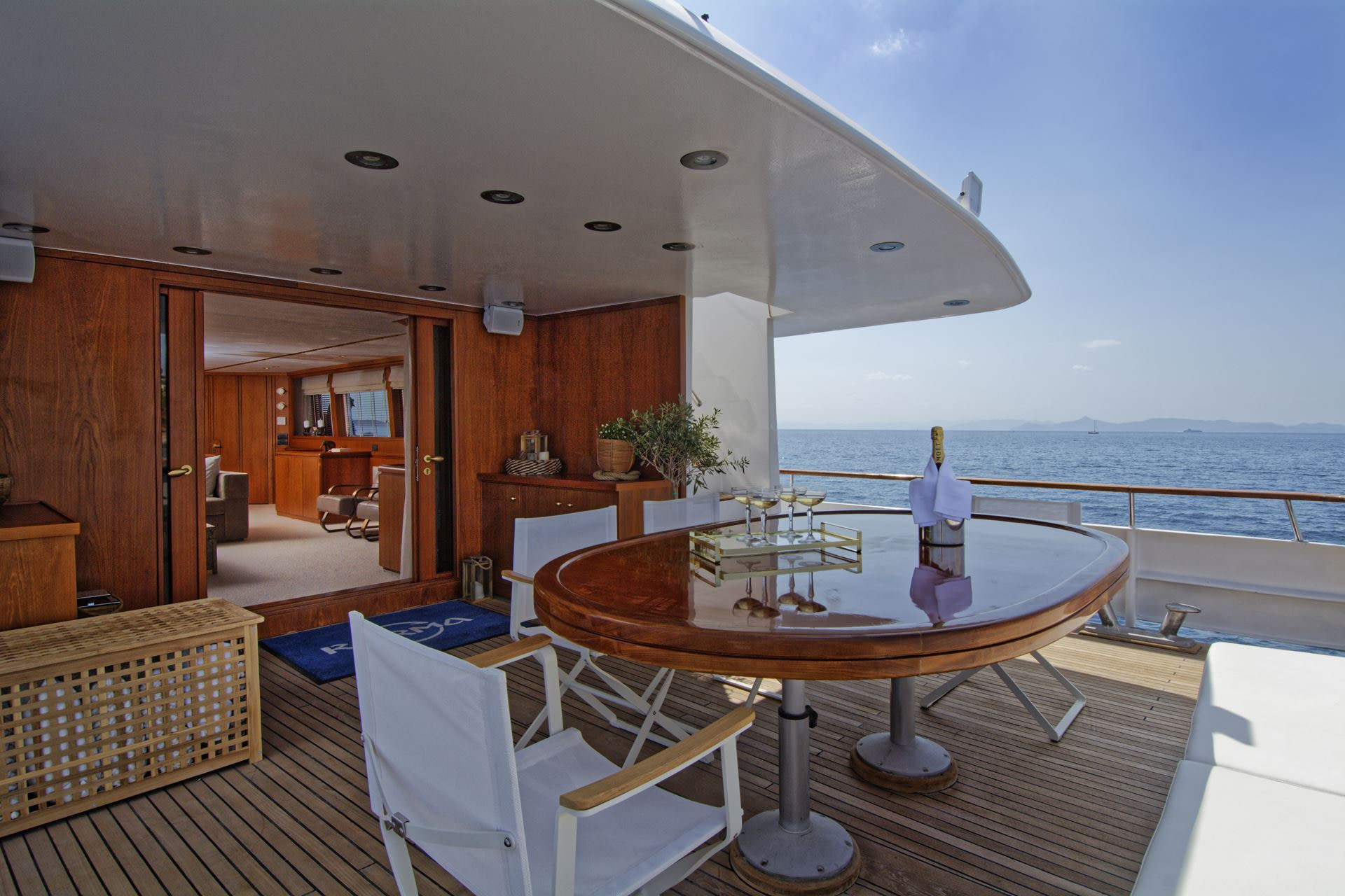 Downstairs from the upper deck is a gorgeous aft deck dining set up. This is the dream set up to enjoy one of many delightful dinners that the chef on Karma is able to cook up for you, All while taking in the beautiful Greek sunset – a sight that never gets old. The chef is one of five crew members on board Karma motor yacht Greece. All of whom will work tirelessly to ensure your experience on board is one to remember!