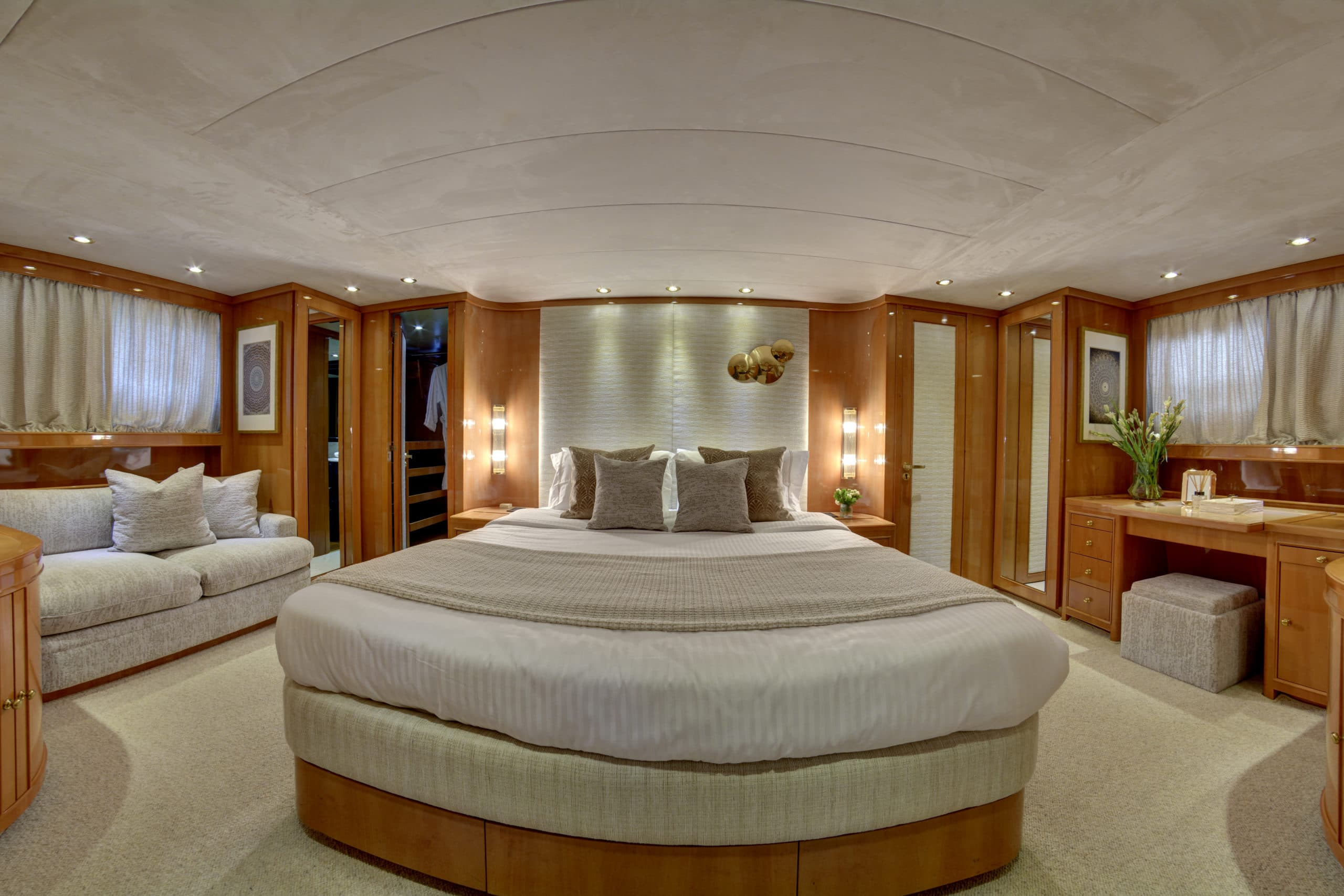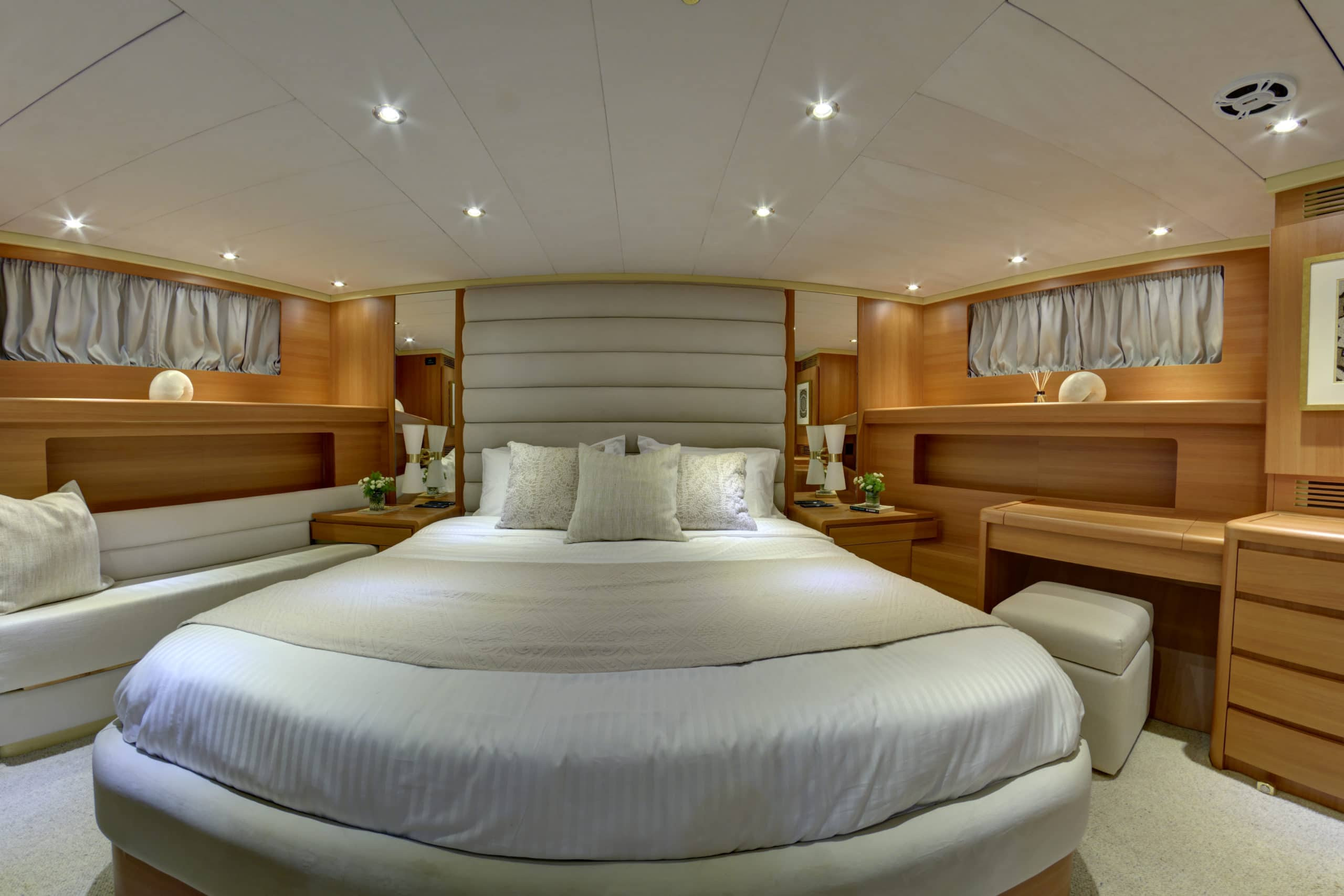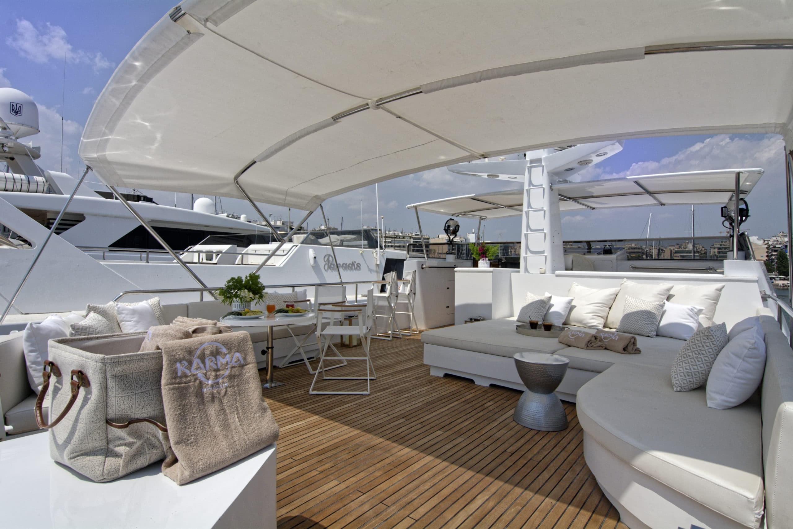 The upper deck on Karma is one of her most impressive features. Unlike many other yachts, the upper deck has a very open layout. With a much more spacious feel as a result. On this deck, stylish crème sofas give way for some luxurious sun beds. The amount of lounging options on this yacht makes Karma ideal for any and all sun lovers! This upper deck can also accommodate a table for guests to enjoy a light lunch on. It also has two Biminis, providing the option for shade should guests need it.
