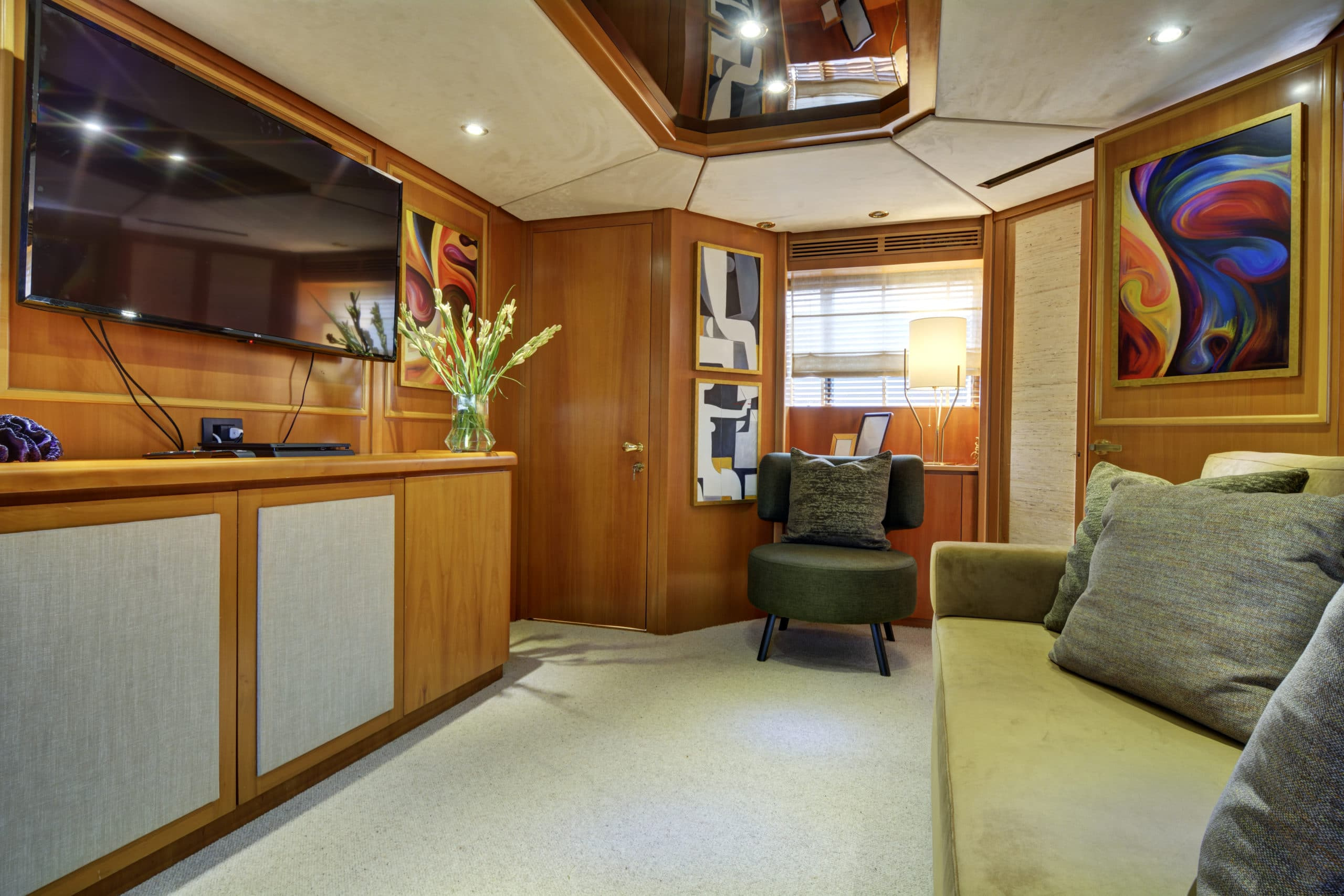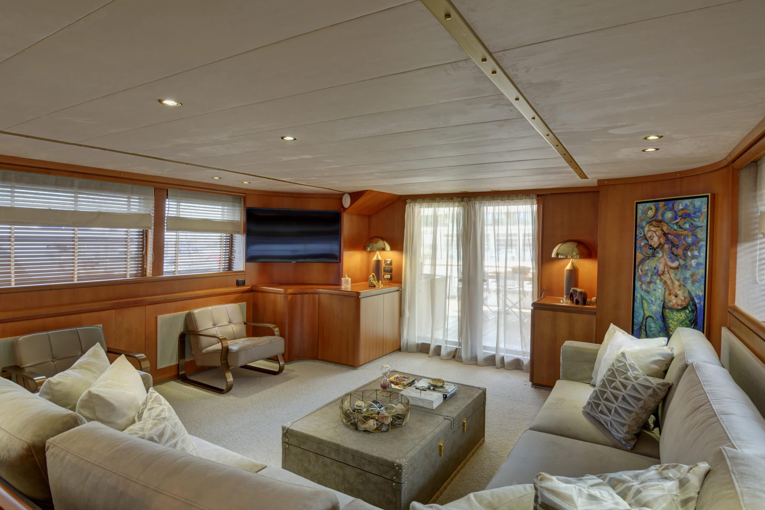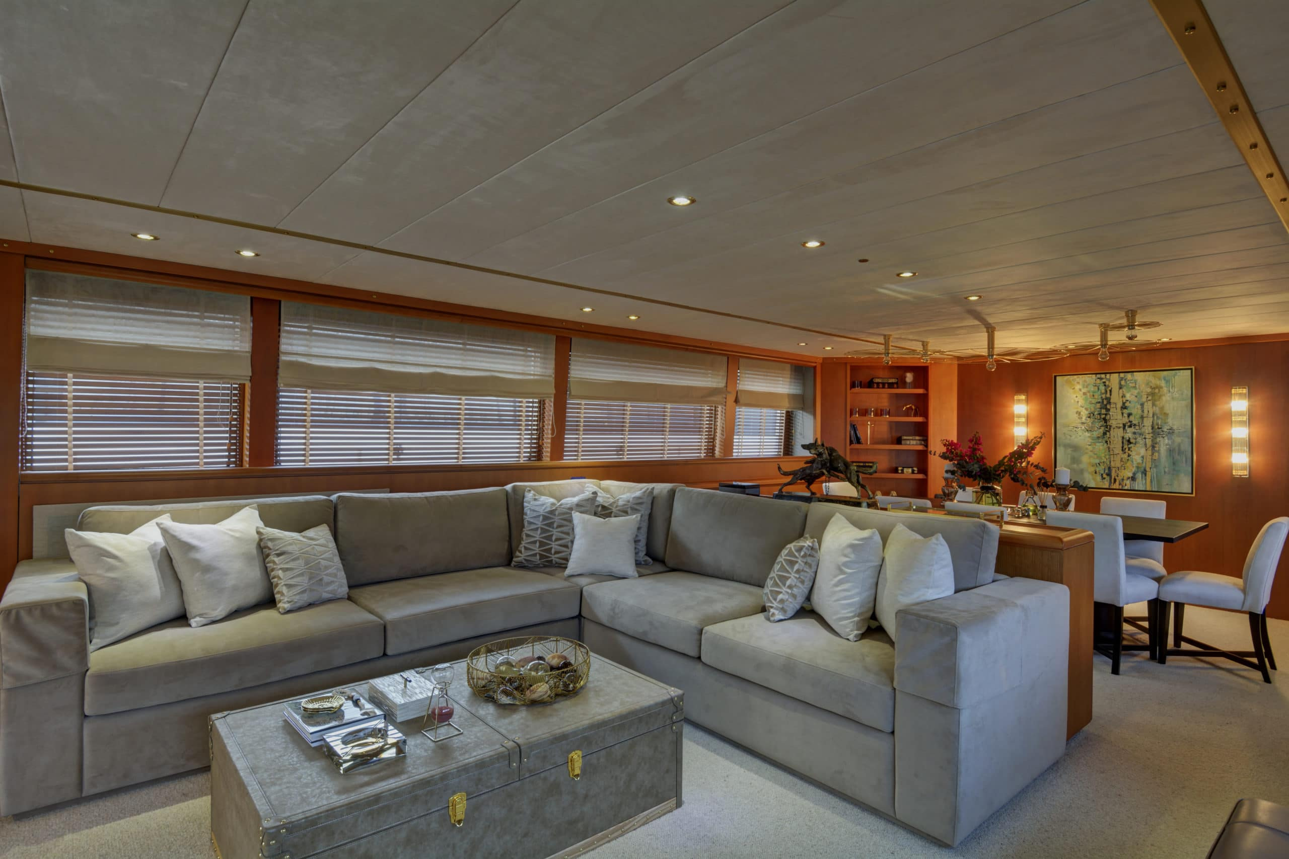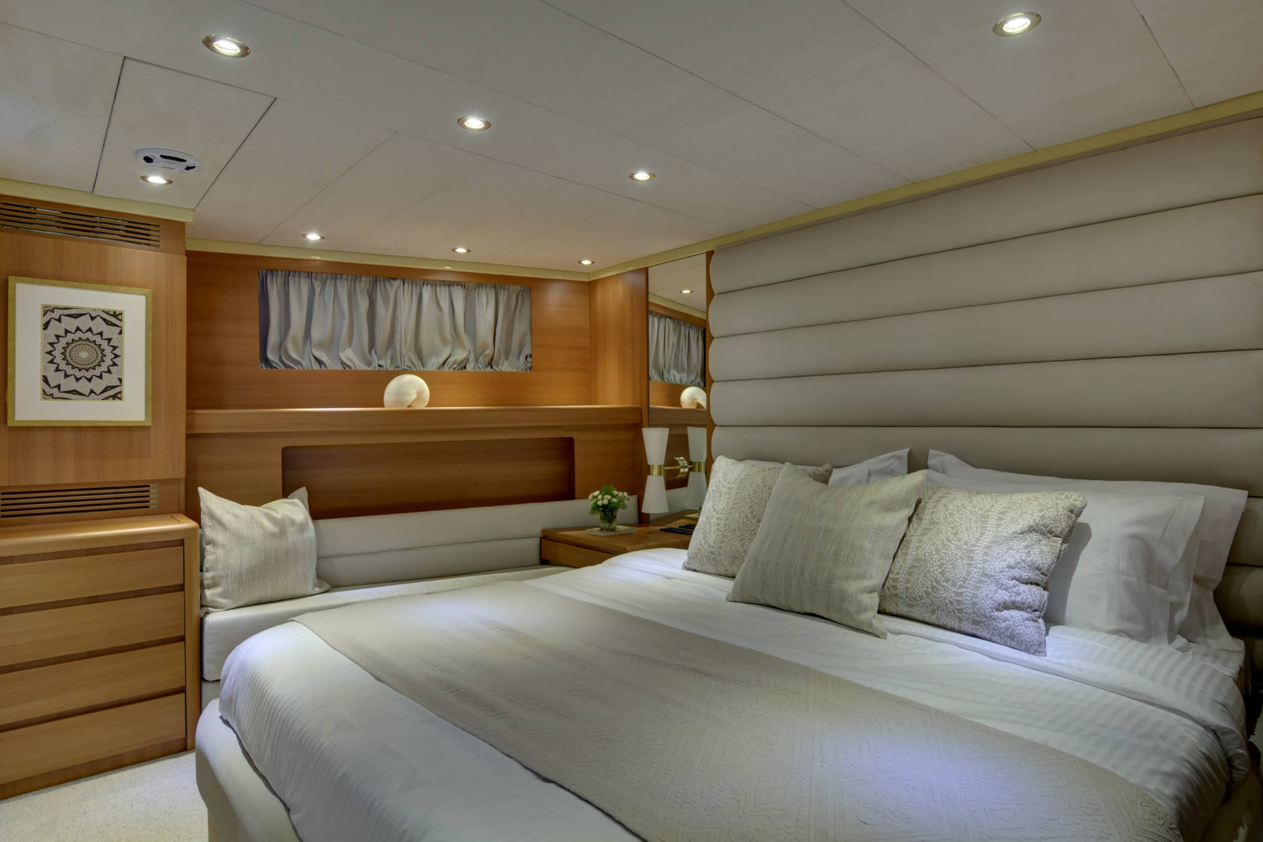 The upper deck on Karma is one of her most impressive features. Unlike many other yachts, the upper deck has a very open layout. With a much more spacious feel as a result. On this deck, stylish crème sofas give way for some luxurious sun beds. The amount of lounging options on this yacht makes Karma ideal for any and all sun lovers! This upper deck can also accommodate a table for guests to enjoy a light lunch on. It also has two Biminis, providing the option for shade should guests need it.