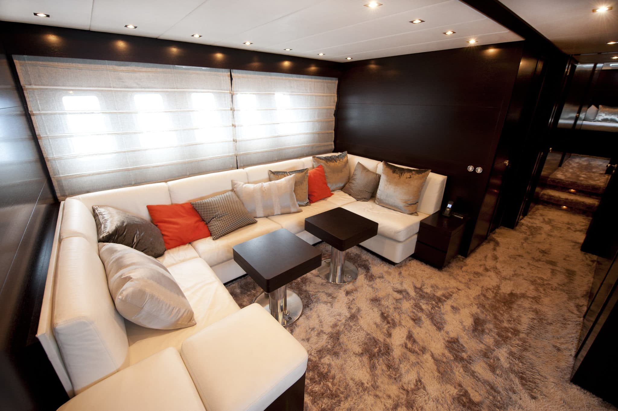 The main deck of this Leopard superyacht uses the available space to optimum effect, with chic furnishings, intelligent layout and elegant lighting. The colors utilised on the main deck create an ambiance of contemporary style, and provide some tasteful contrasts. Ample seating and a large dining table to the aft make for an idyllic entertaining space.