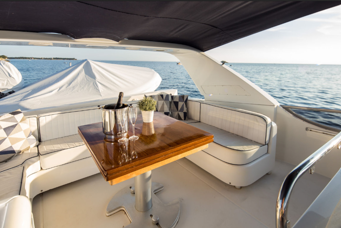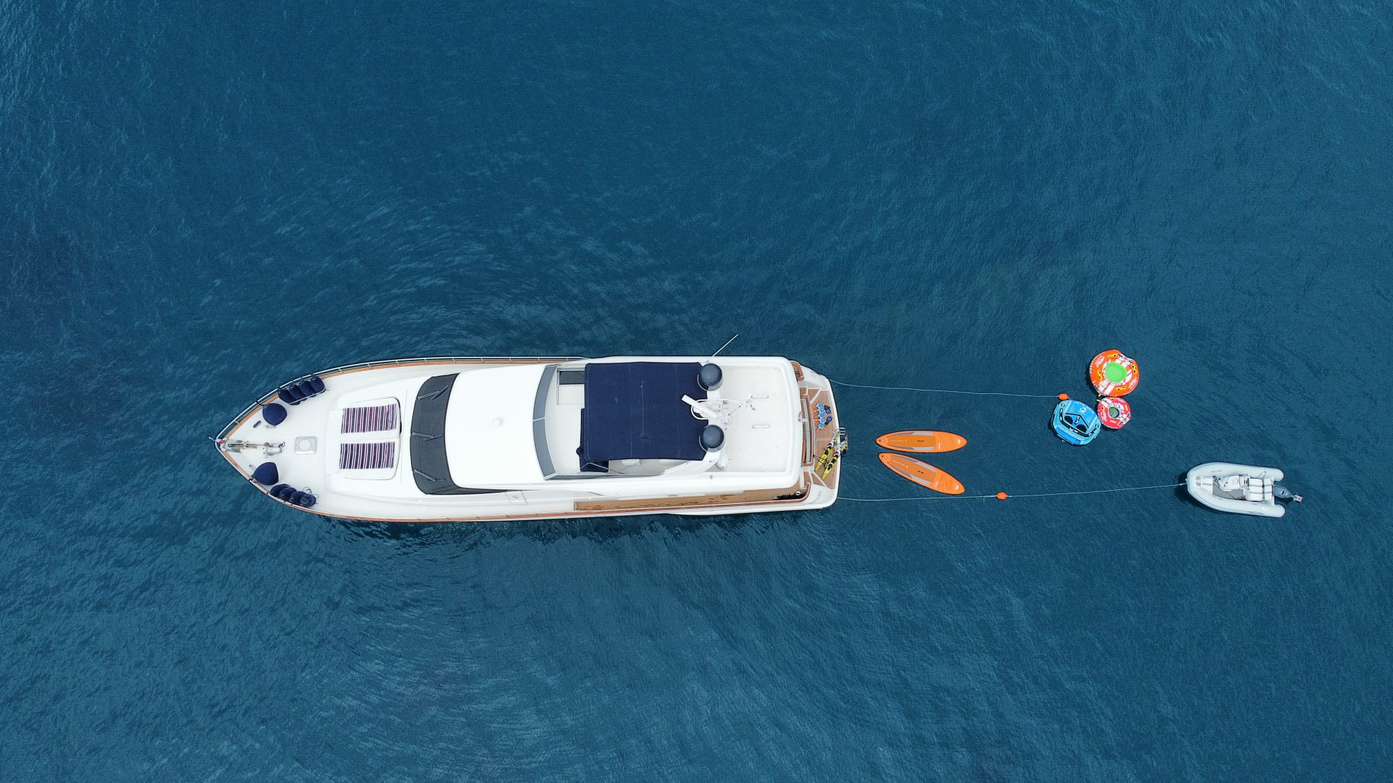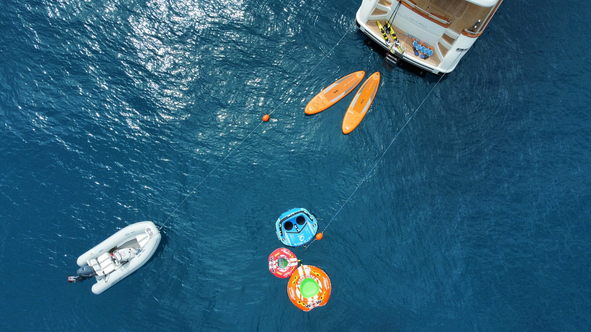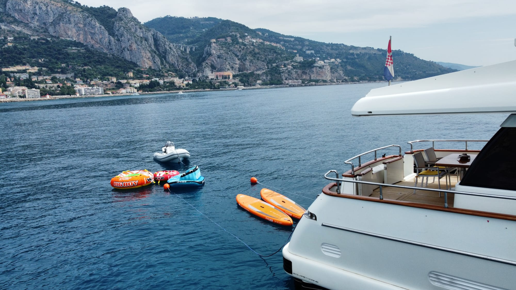 The exterior of the yacht offers ample space for relaxation and entertainment. The flybridge includes a broad row of cushioned sun pads, a forward helm station, and an open aft deck that doubles as tender storage when underway. The main deck aft features a dining area ideal for hosting al fresco meals, with steps leading down to a swim platform for direct water access. The crew is always available to assist with water toys and ensure every moment on the water is enjoyable. The foredeck includes an additional row of sun pads, providing the perfect spot for sunbathing with stunning views over the bow.