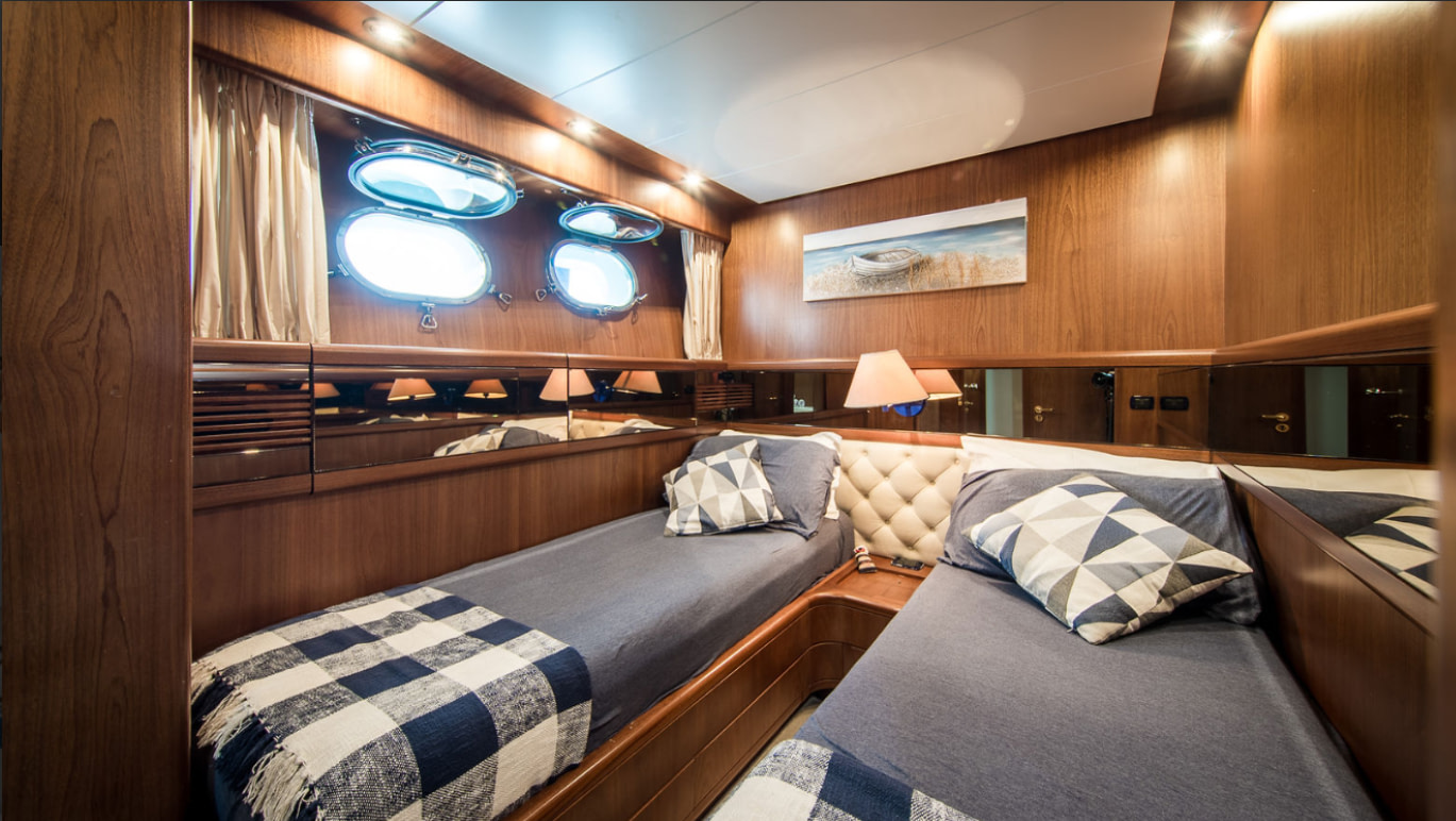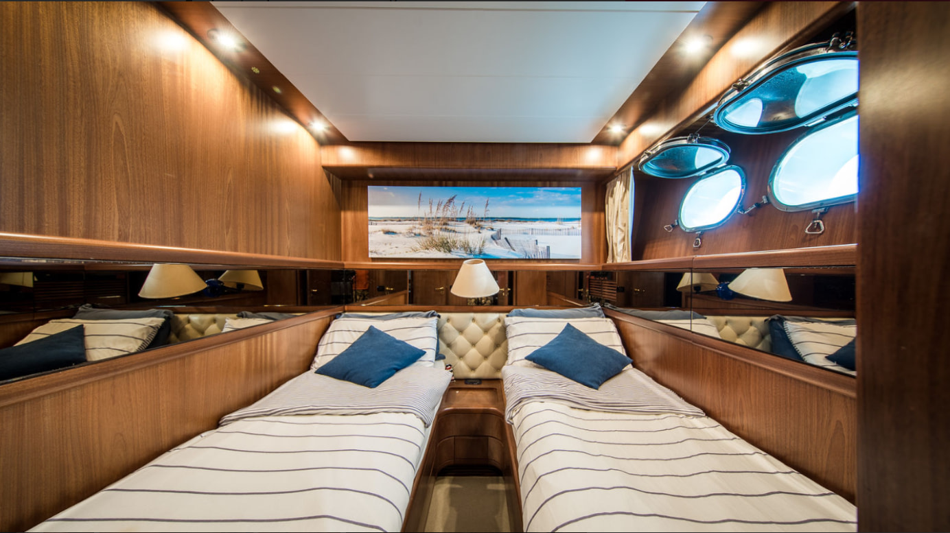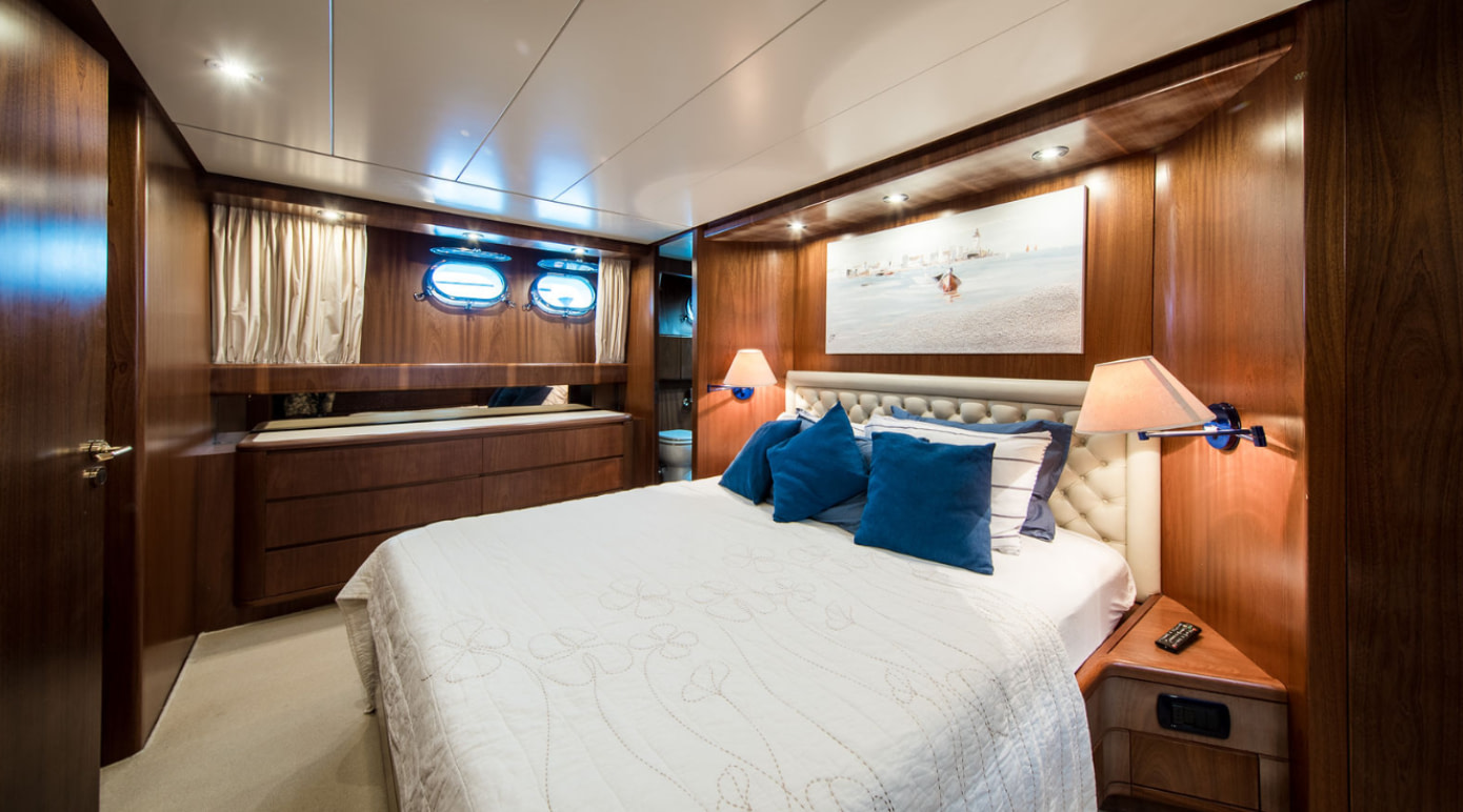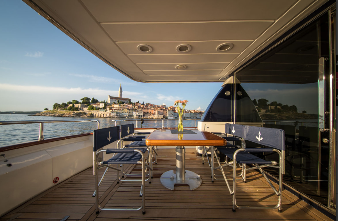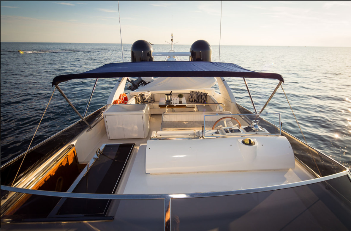The exterior of the yacht offers ample space for relaxation and entertainment. The flybridge includes a broad row of cushioned sun pads, a forward helm station, and an open aft deck that doubles as tender storage when underway. The main deck aft features a dining area ideal for hosting al fresco meals, with steps leading down to a swim platform for direct water access. The crew is always available to assist with water toys and ensure every moment on the water is enjoyable. The foredeck includes an additional row of sun pads, providing the perfect spot for sunbathing with stunning views over the bow.