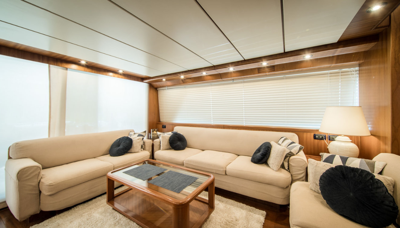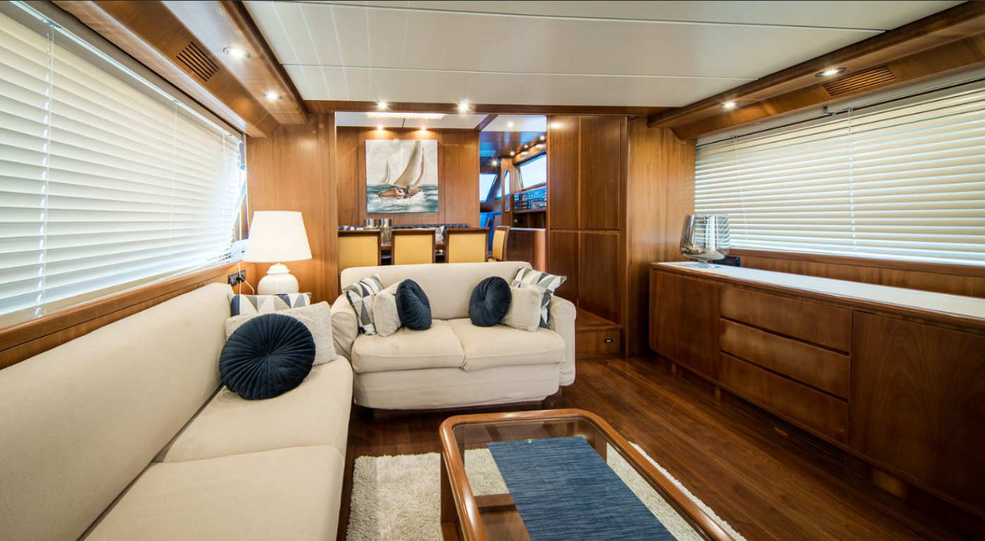 The interior of Lizard Yacht Charter is designed with timeless elegance. Neutral furnishings complement the warm wood paneling, creating a spacious and inviting atmosphere ideal for unwinding after a day of adventure.