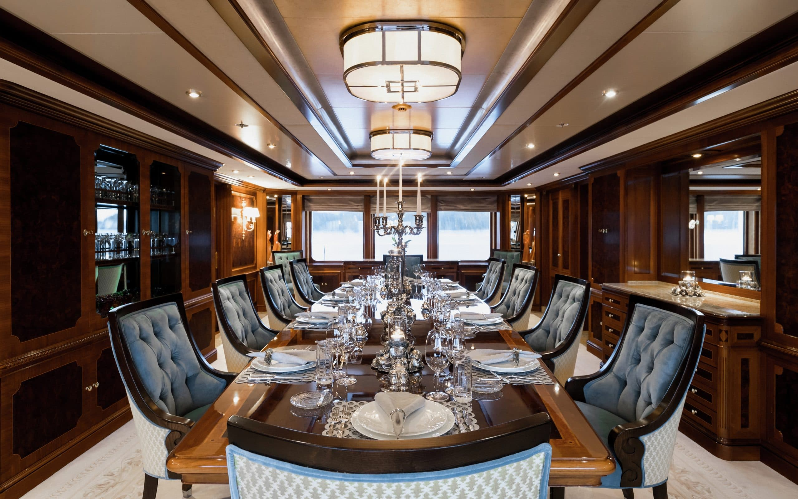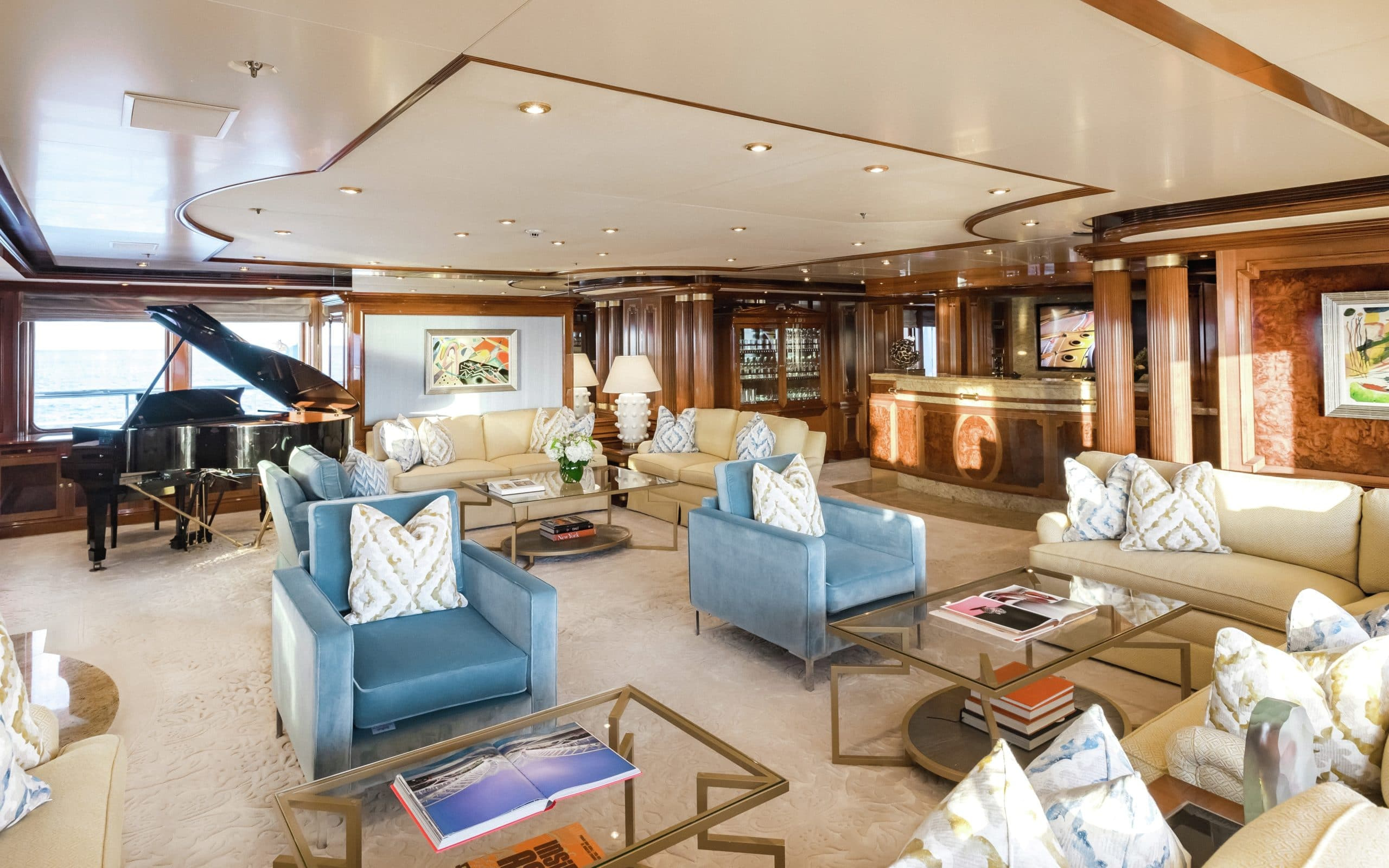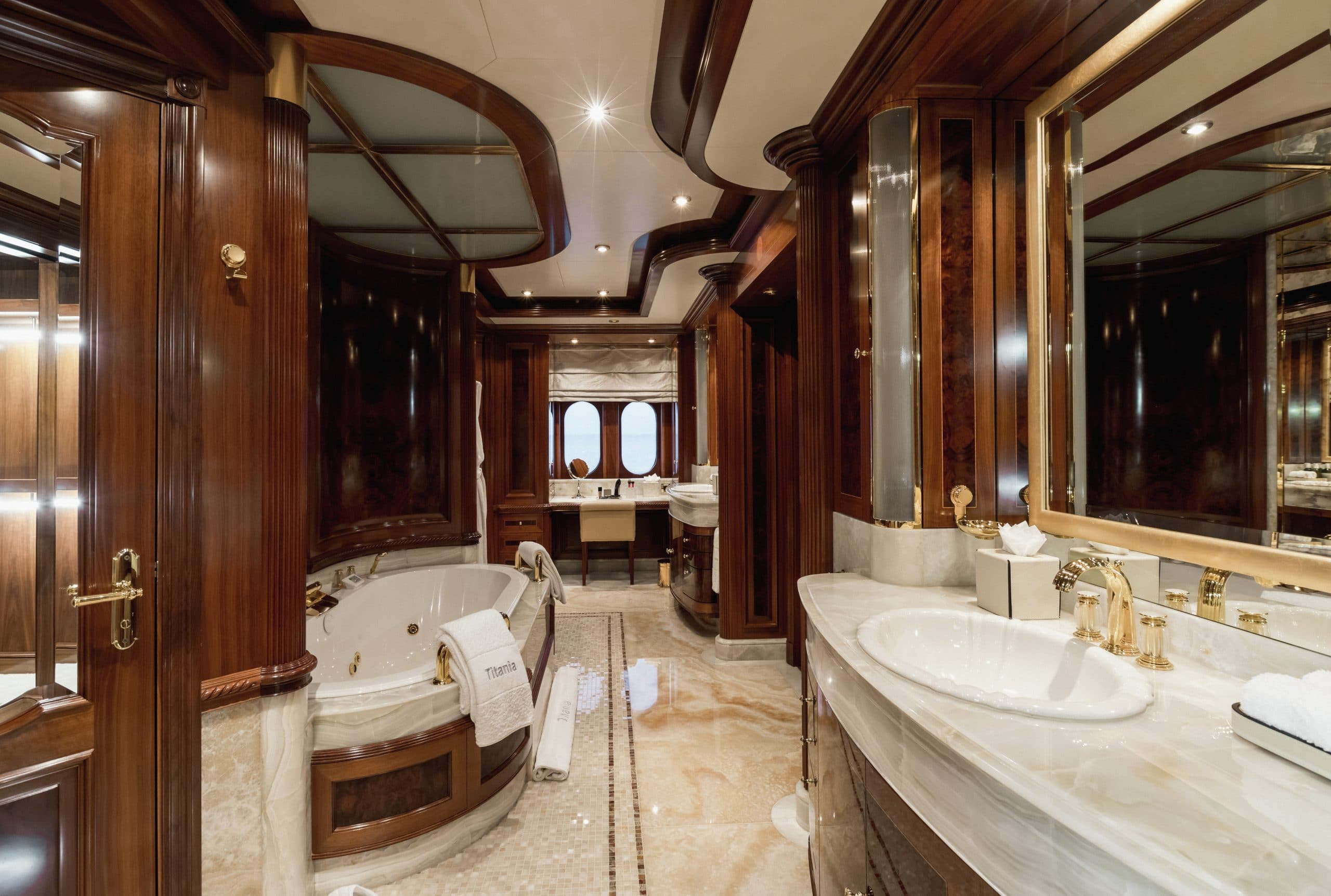 The stunning interior of Titania is the work of interior designer Zuretti. Every last detail has been carefully considered and as a result the overall atmosphere is one of luxury and indulgence. The main saloon is beautifully laid out and boasts a grand piano, making it a perfect place for entertaining guests in the evening. On board there are also two interior dining areas, both elegantly decorated and a sky lounge with breath taking views.