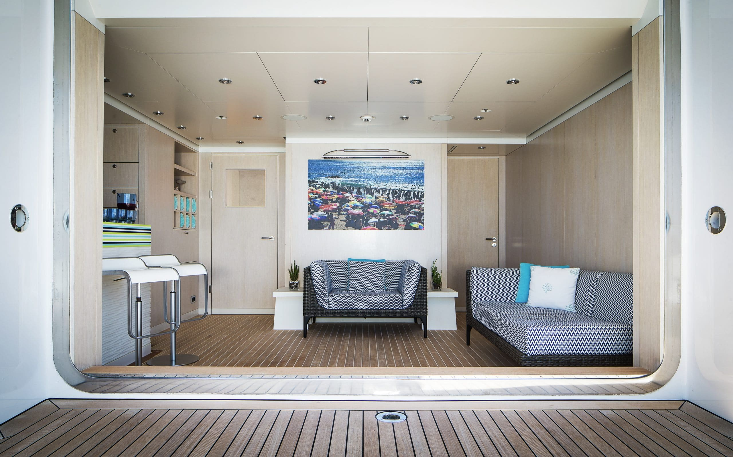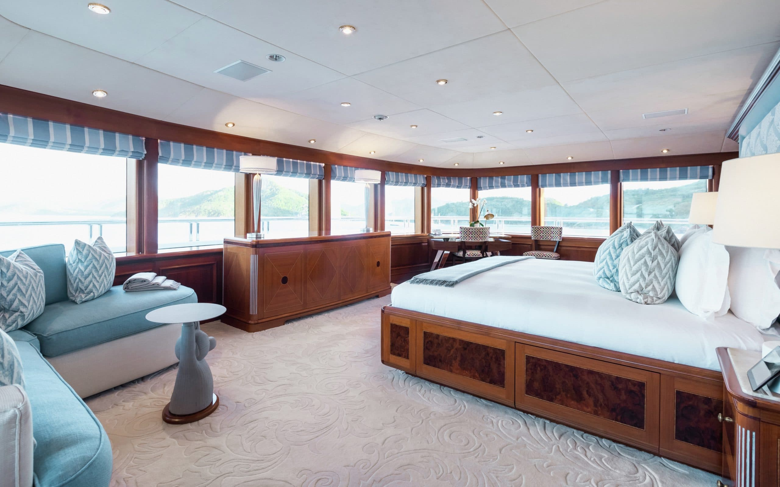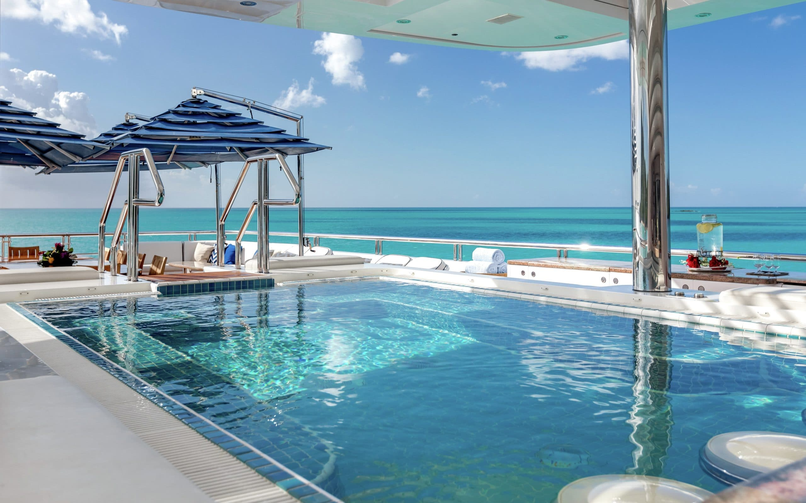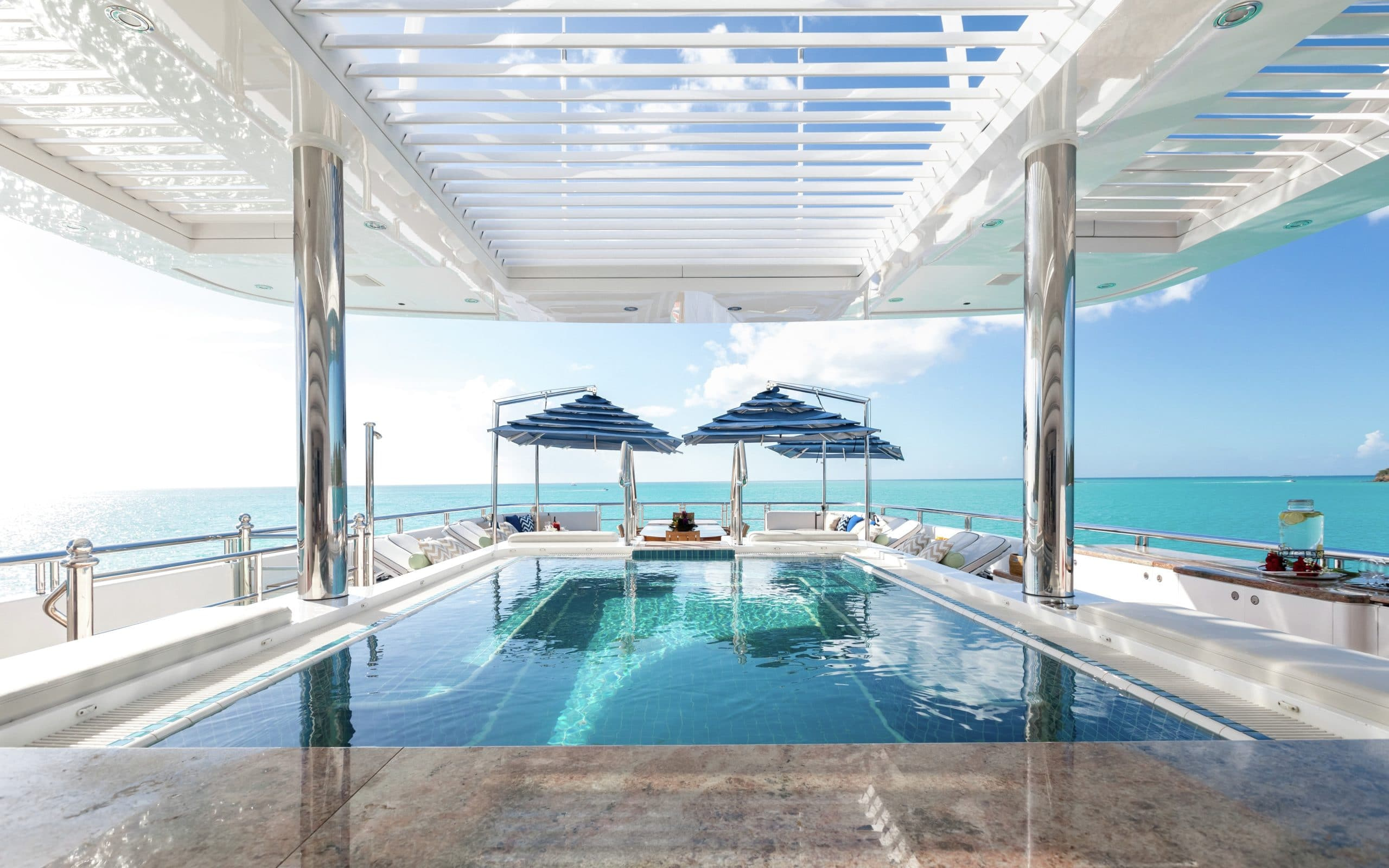 With 5 different levels to choose from there are ample exterior spaces for you and your guests to enjoy. The main deck and bridge deck both offer exterior dining areas that are shaded. Here you can appreciate the magnificent meals that will be prepared by your chef on board while escaping from the midday heat. Moving up to the next level is one of the most impressive areas on board, the pool deck. It will definitely be a favourite with all your guests due to its large pool, swim up bar and large exterior tv where you can unwind on the comfortable couches. On the top level is the sundeck where guests can enjoy 360-degree views and a sports bar. Making it the ideal place to watch a Mediterranean sunset with a glass of wine in hand!