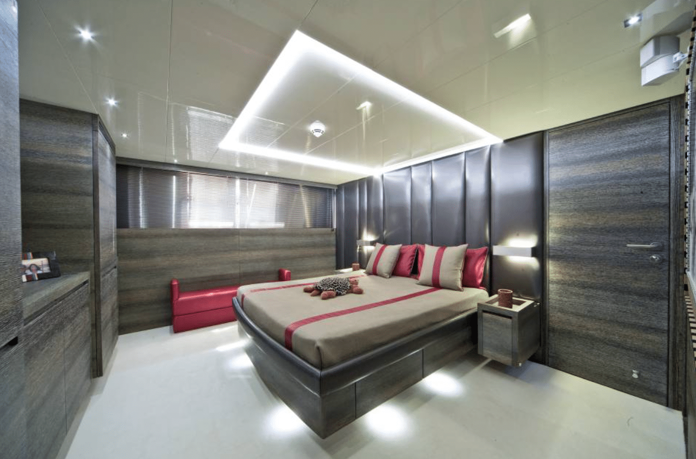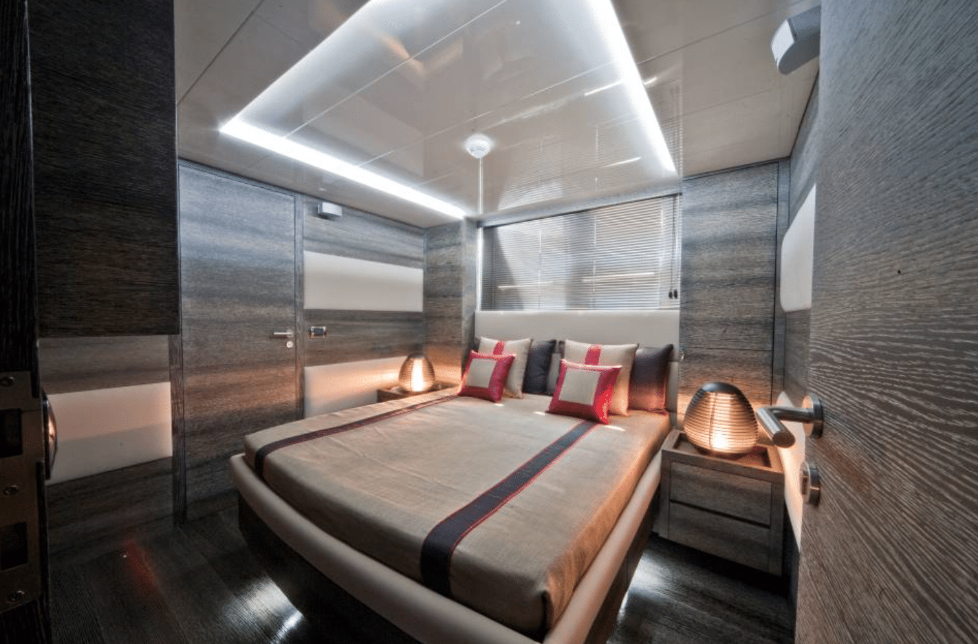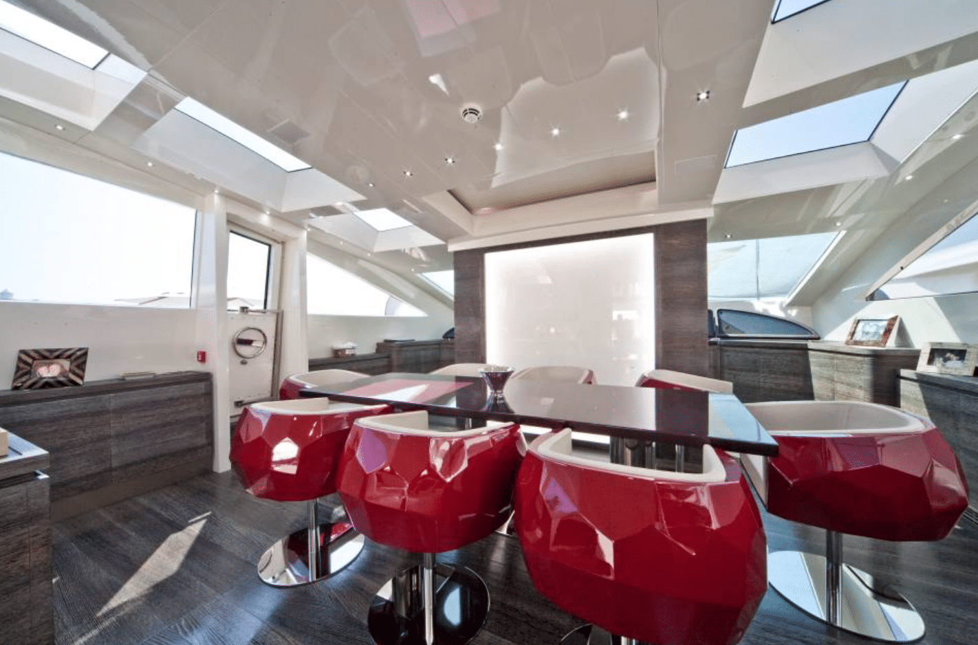 With ample living space, Toby really leaves an impression. The main deck is delightfully stylish. The salon is large and warm, thanks to the tasteful décor and divine seating. Relax in front of the large satellite TV, or sink into the 2 large sofas. The dining room is beautifully contemporary, with modern red Fendi Home seats creating a modern, chic feel. 8 guests can dine here. The skylights bless the room with natural light. The upper deck boasts a trendy bar and dining area, creating the ideal space to dazzle guests. A bbq, refrigerator and ice maker further lend this space to entertaining and having a great time. The seating space forward offers an idyllic space to entertain, with a spacious circular seating arrangement creating a social atmosphere. The bimini protects guests from the sun.