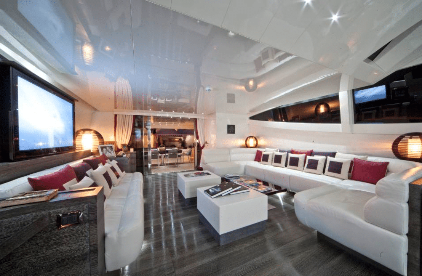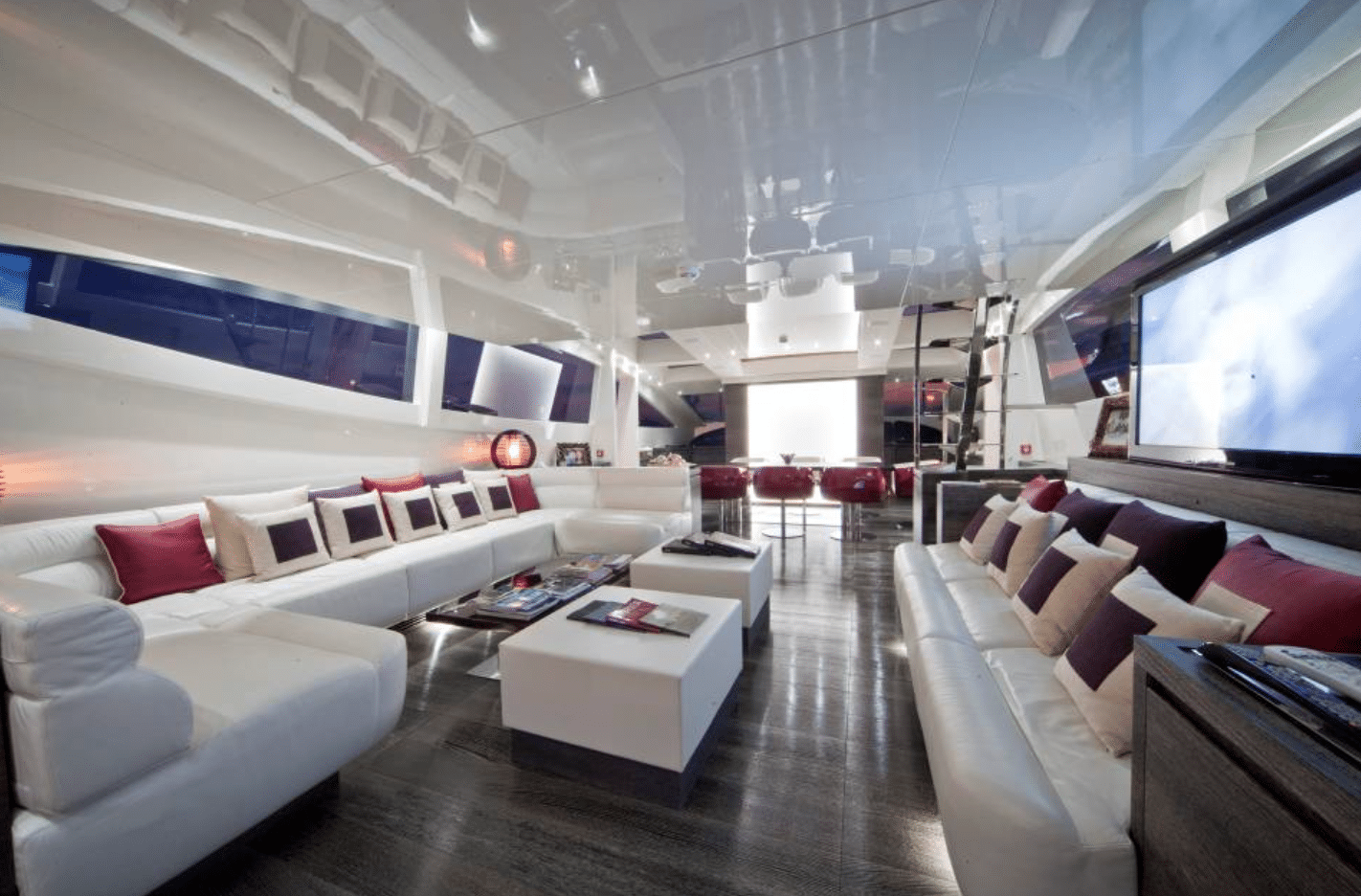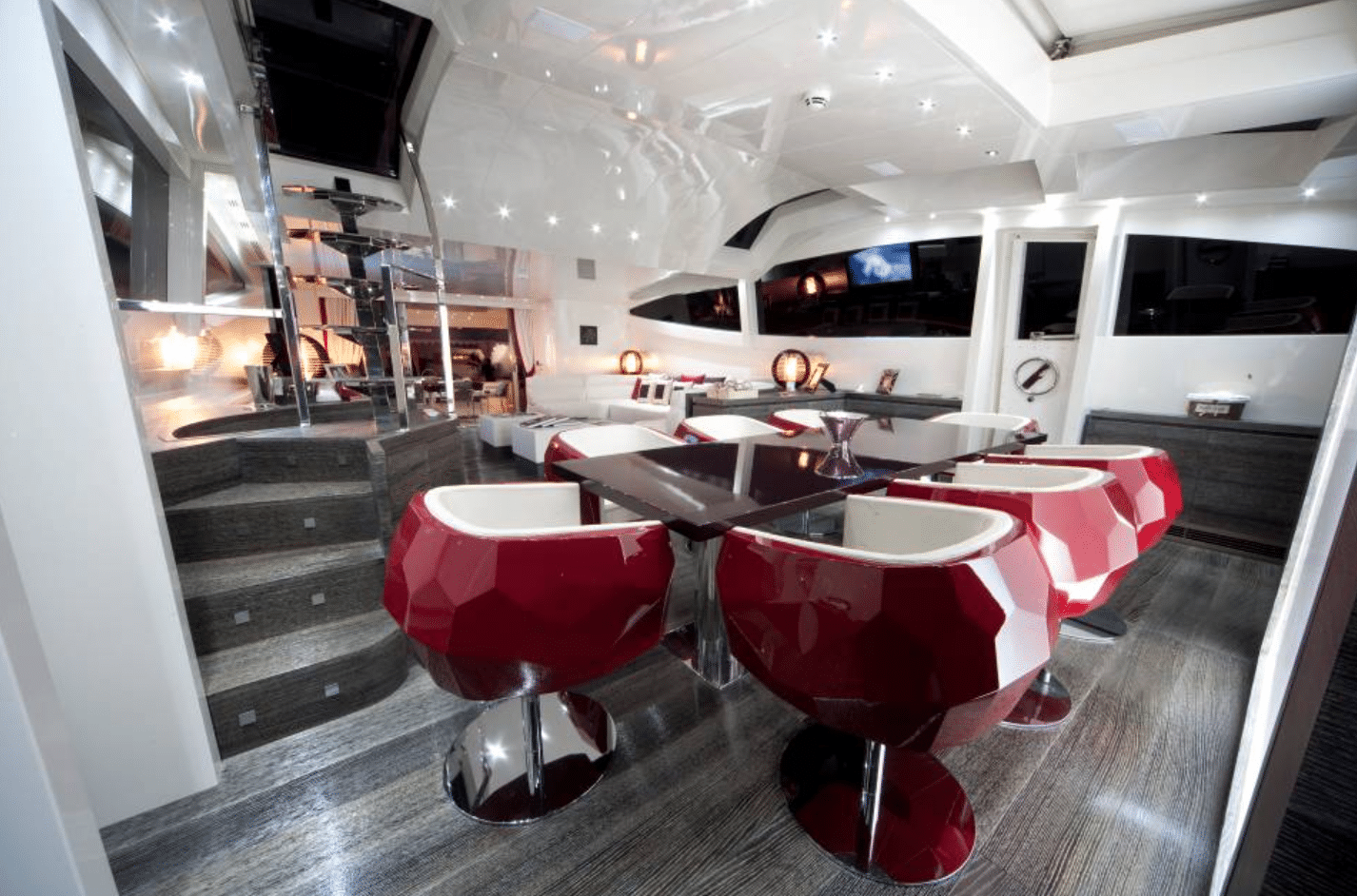 With ample living space, Toby really leaves an impression. The main deck is delightfully stylish. The salon is large and warm, thanks to the tasteful décor and divine seating. Relax in front of the large satellite TV, or sink into the 2 large sofas. The dining room is beautifully contemporary, with modern red Fendi Home seats creating a modern, chic feel. 8 guests can dine here. The skylights bless the room with natural light. The upper deck boasts a trendy bar and dining area, creating the ideal space to dazzle guests. A bbq, refrigerator and ice maker further lend this space to entertaining and having a great time. The seating space forward offers an idyllic space to entertain, with a spacious circular seating arrangement creating a social atmosphere. The bimini protects guests from the sun.