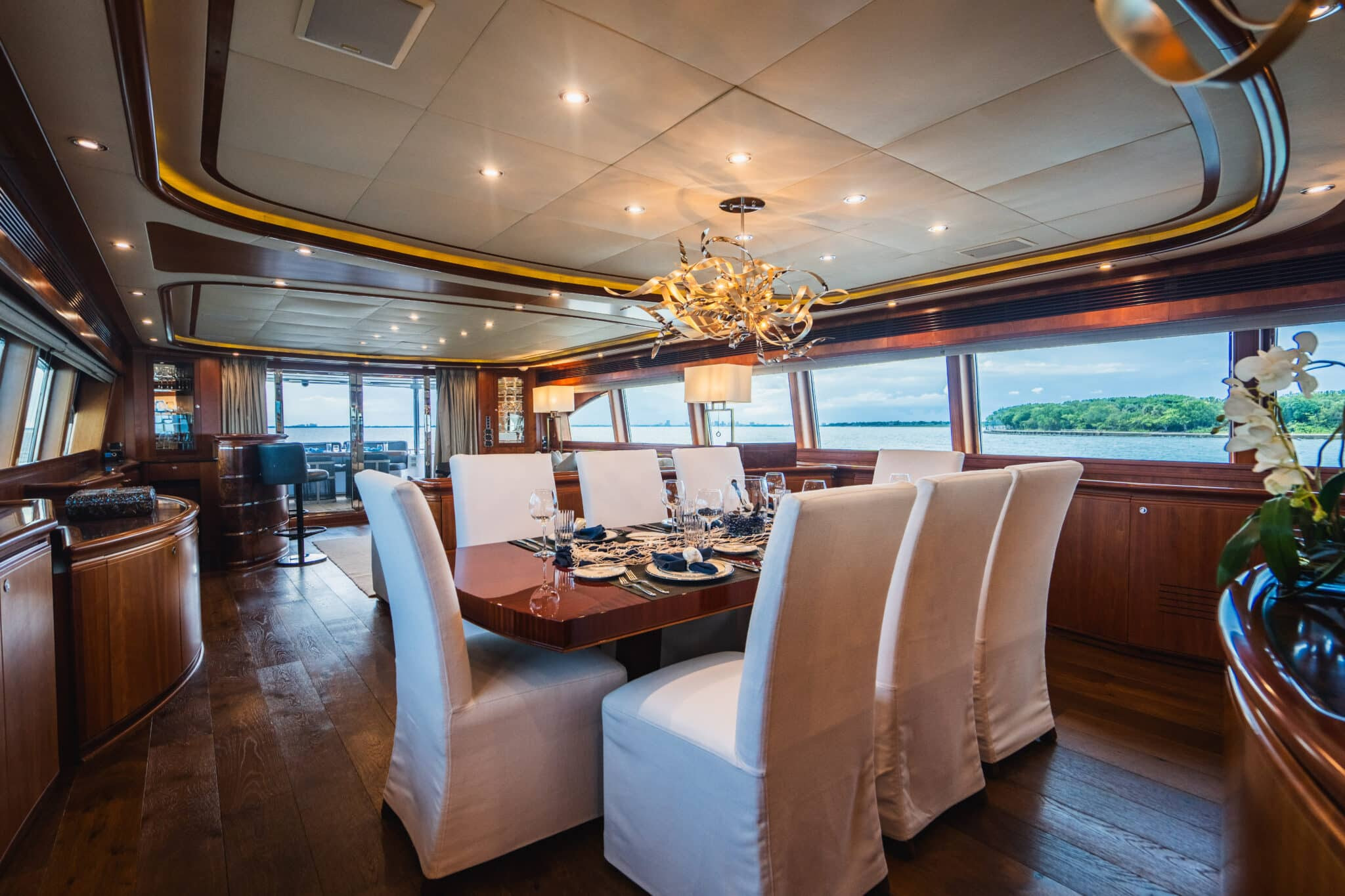 As well as the 4 gorgeous cabins available on board, Mambo’s interior includes her main salon and dining room. With a warm walnut-coloured wood finish, these areas possess a cozy, relaxing allure. The main salon is one of Mambo’s main hubs of activity. With a 42-inch LED TV, a luxurious seating area and a full bar, you’ll never be bored on your Mambo yacht charter Bahamas! Tantalize your taste buds, with a refined dining experience in the expansive dining room suitable for eight guests.