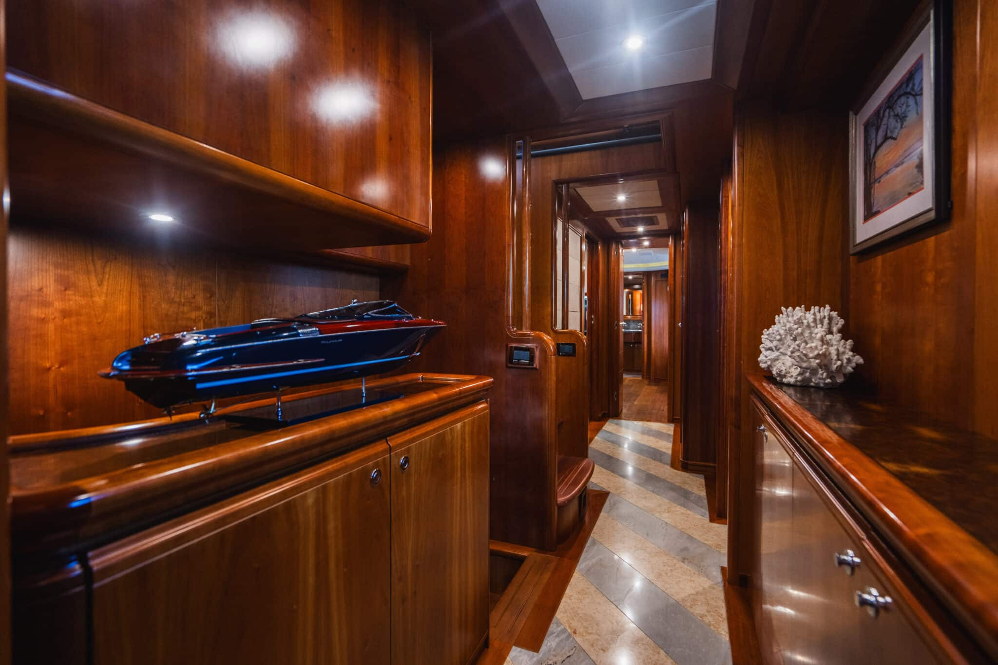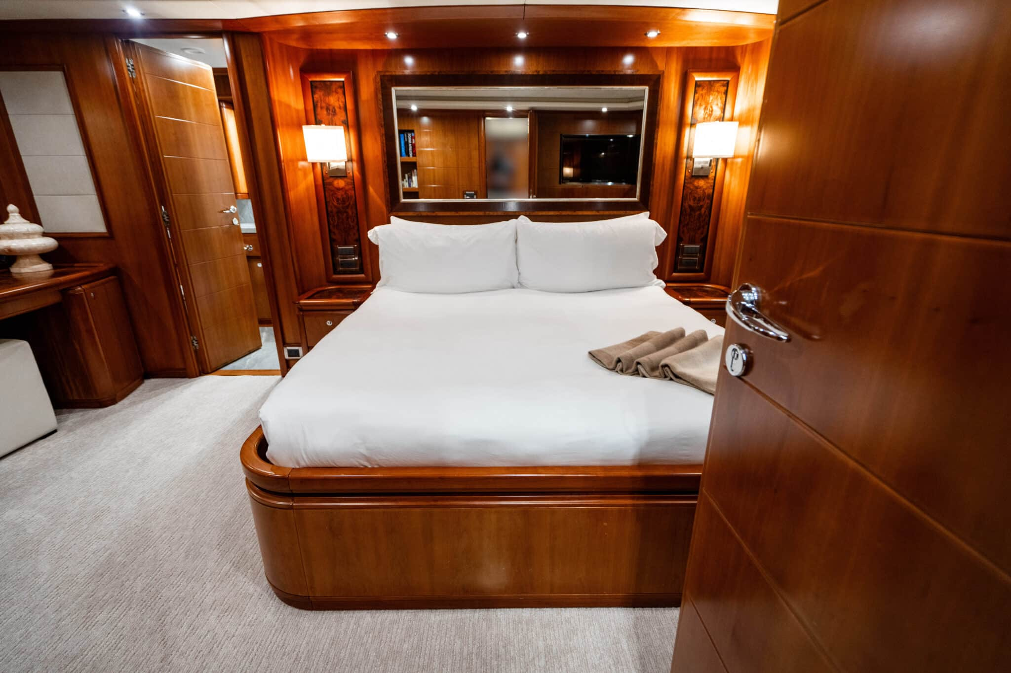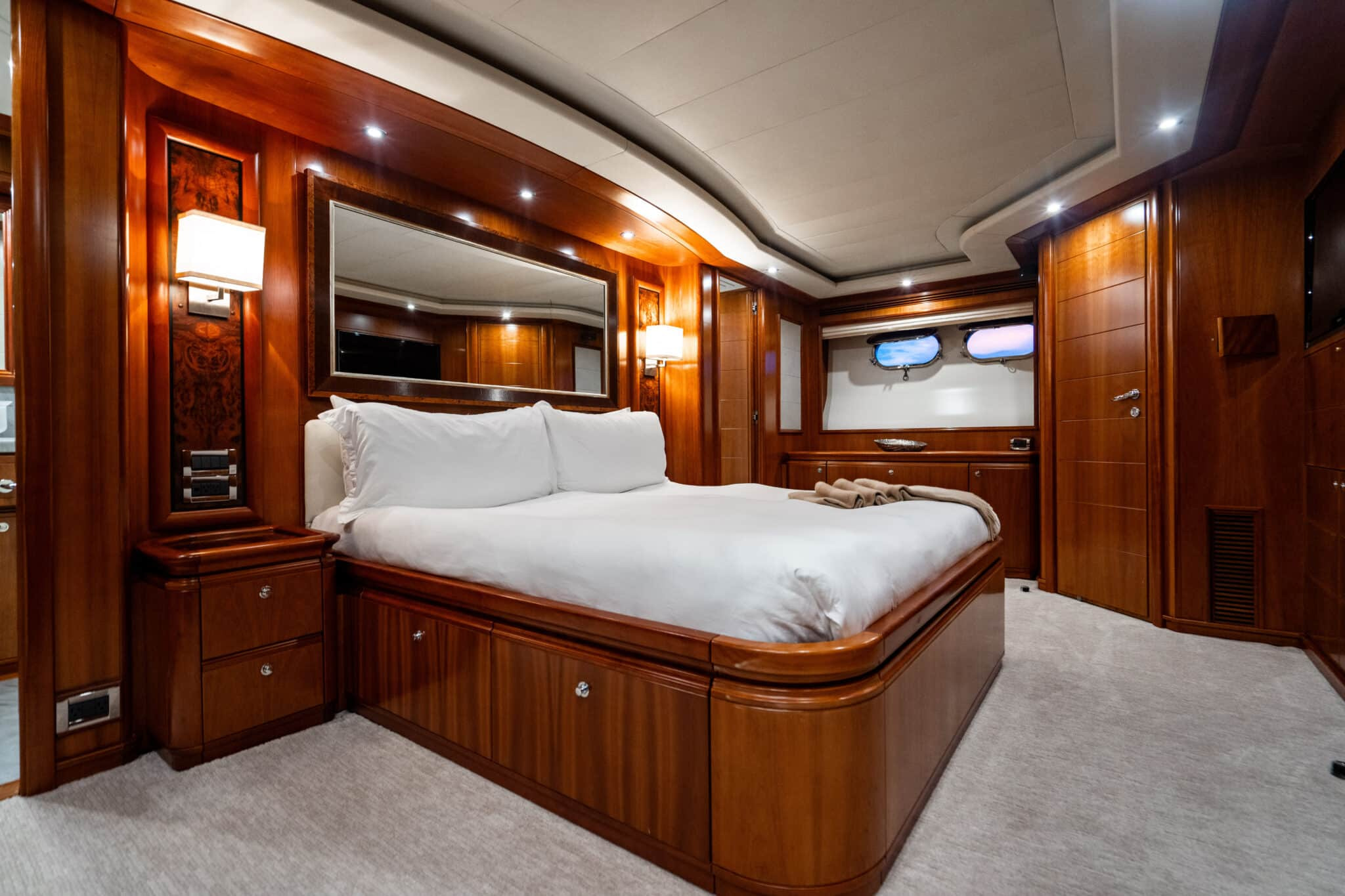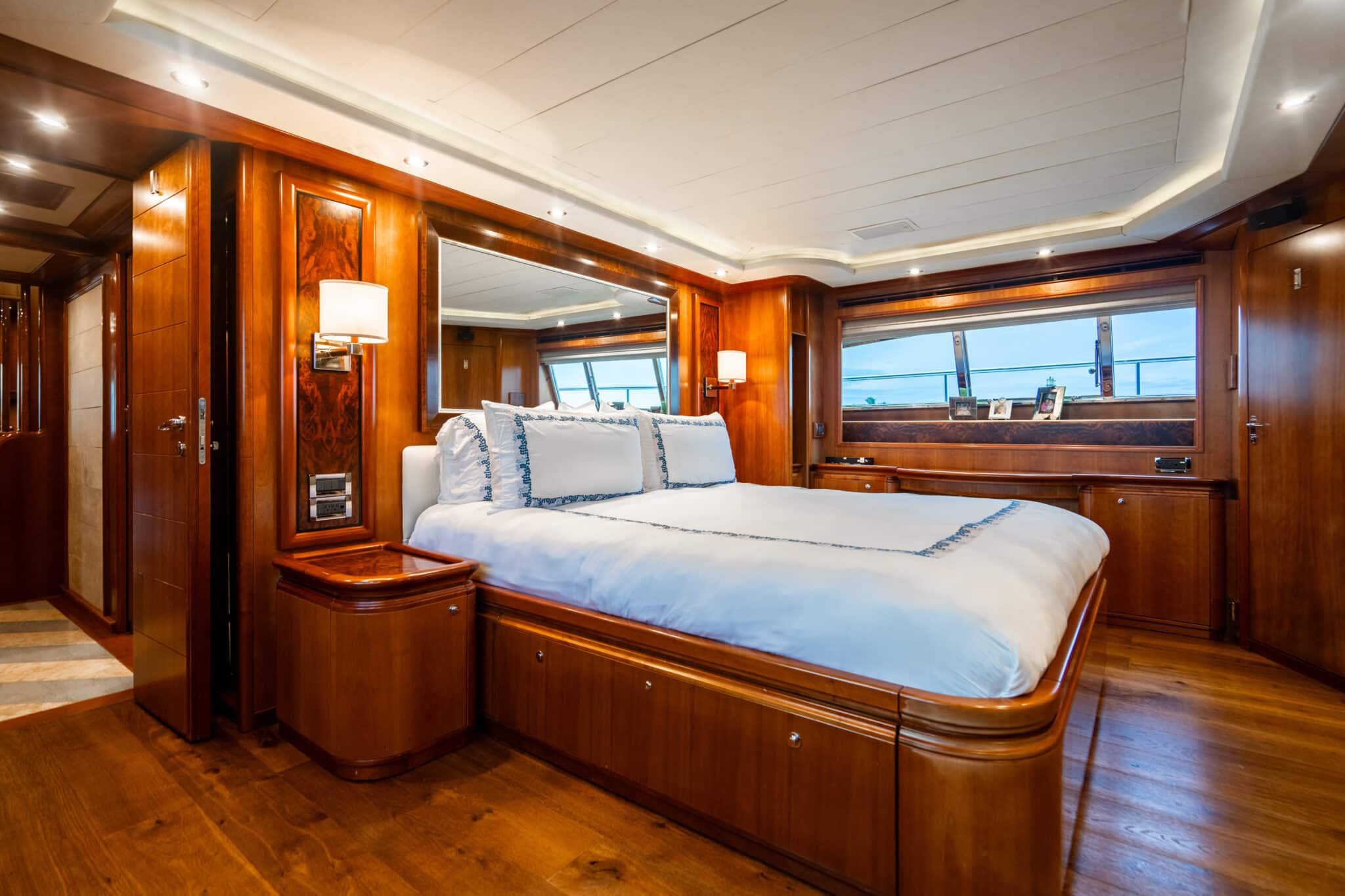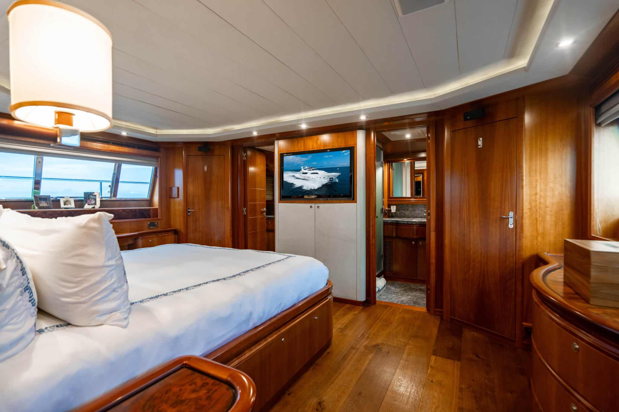 The lower deck includes two identical Guest Staterooms. Each timelessly elegant with their warm wooden design, Queen-sized beds and magnificent marble ensuites with showers. Also featured is the spacious, full-beam VIP Stateroom. This is complete with a king-sized bed and natural stone ensuite with a shower and tub.