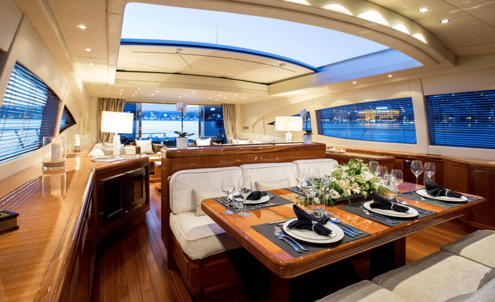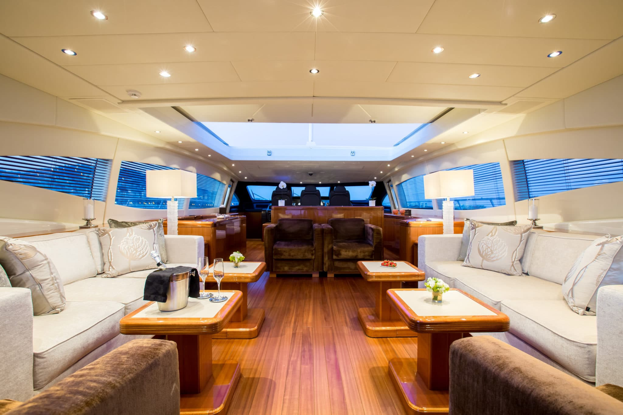 The living spaces on-board this Mangusta for charter are perfect for families or groups of friends. Her salon features an impressive retractable roof, which floods the space with natural light. Forward is a main dining area for formal dining. Her aft deck features a further spacious and shaded dining area, in addition to a heated jacuzzi or 3 sun-beds. Forward is a large sun-lounger, complete with retractable bimini for shade and privacy.