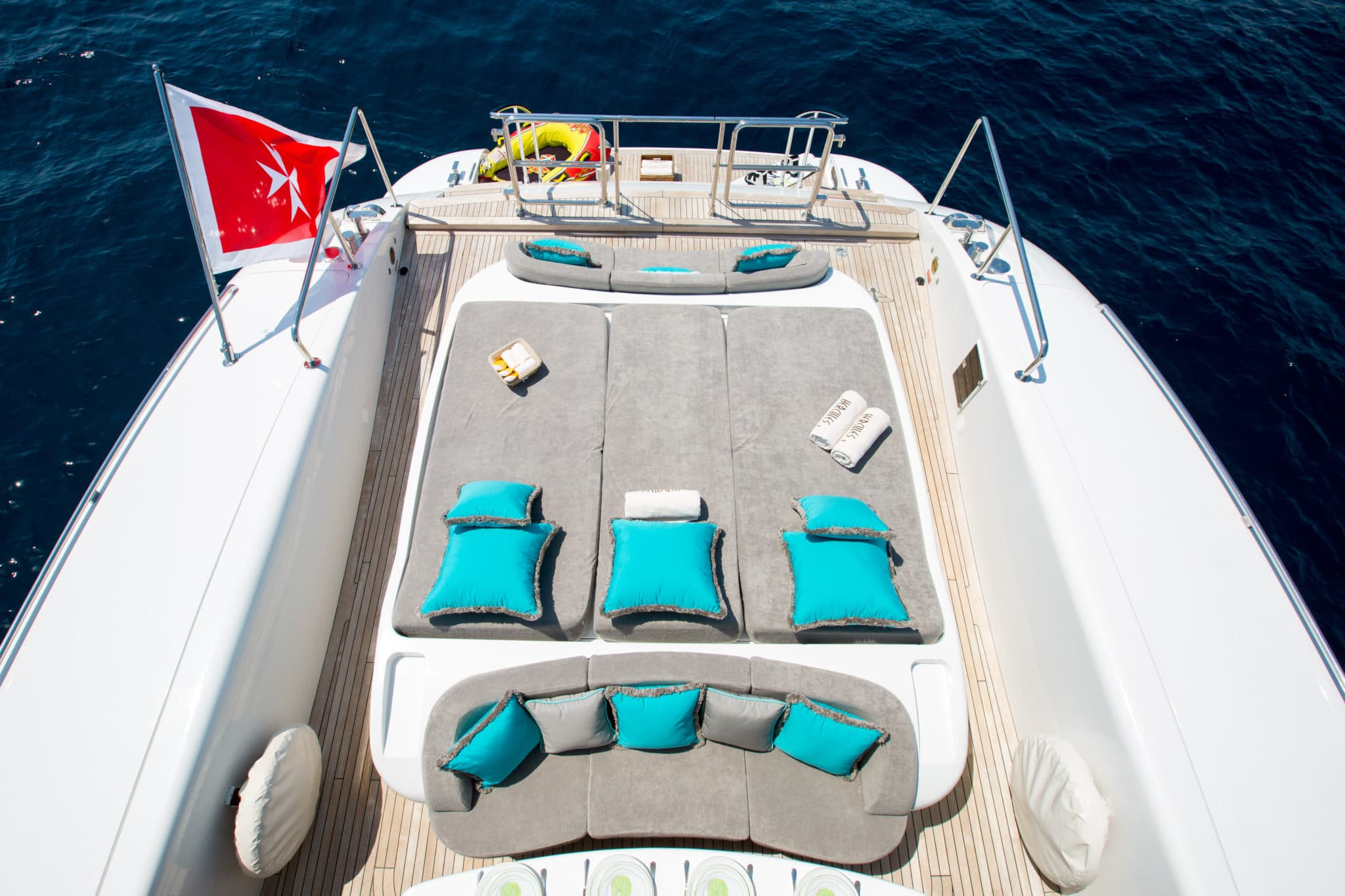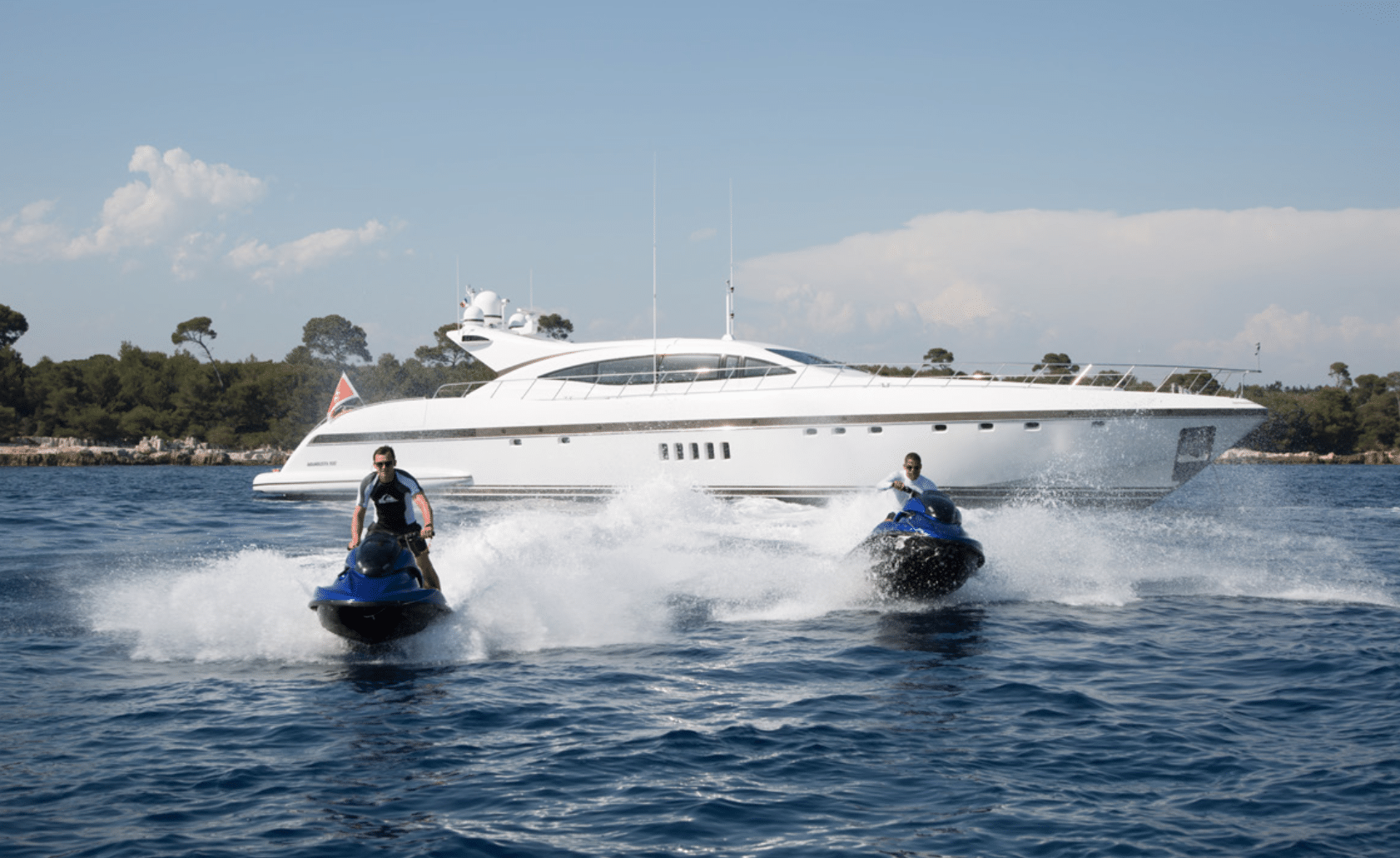 This sporty Mangusta charter yacht carries exciting water toys, including 2 Yamaha jet skis. When guests prefer to relax, enjoy five star service from her fantastic crew of 5.