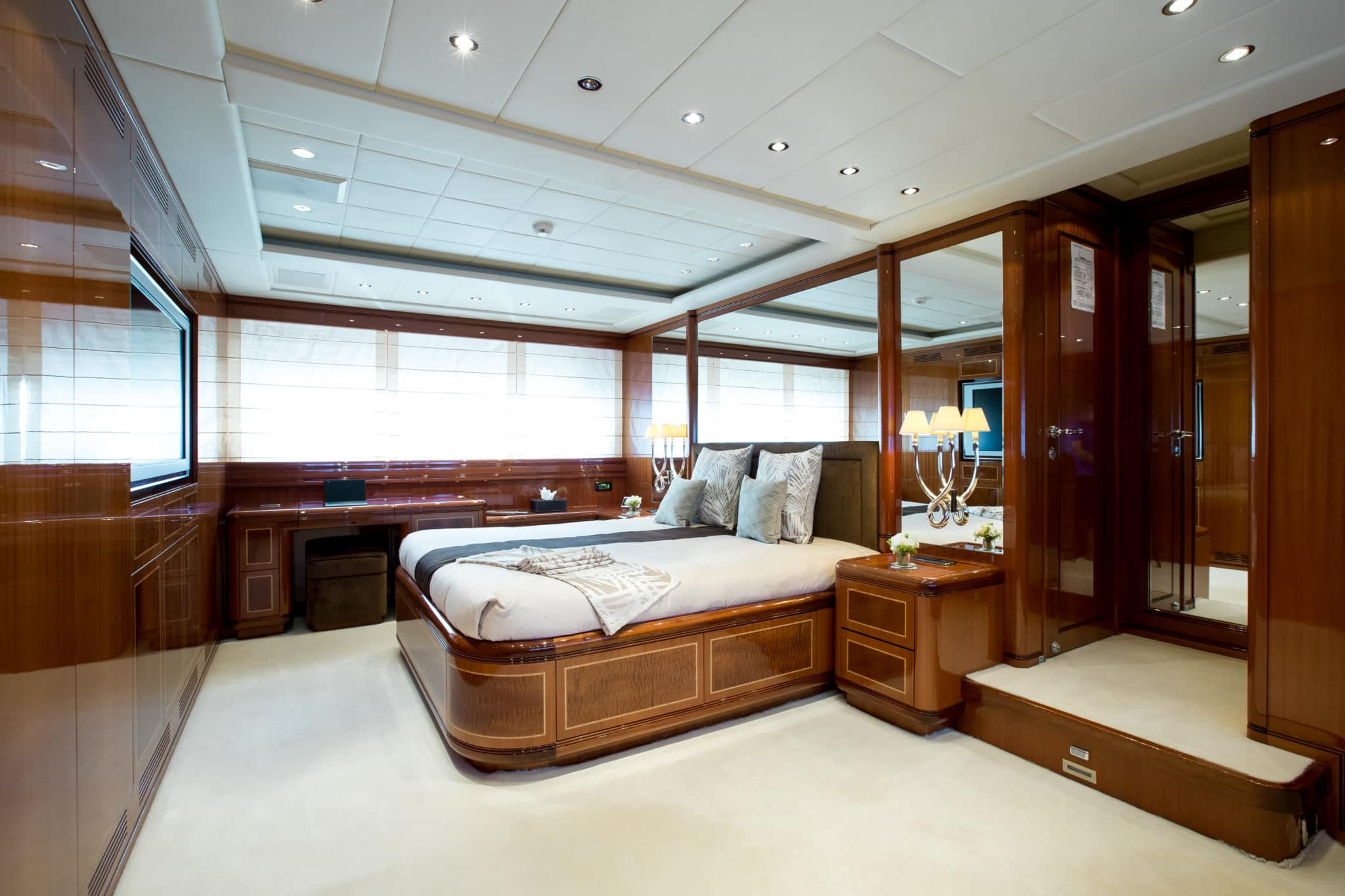 With 8 spacious cabins, this Mangusta 108 yacht for charter sleeps 8 guests. The full-beam master suite has a vanity area and en-suite. Hercules I also has 2 double cabins and a twin cabin with a Pullman. Because of her luxurious and welcoming furnishings, her cabins offer maximum comfort. All cabins have satellite TV, and the internet broadband was upgraded in 2016 for optimal connectivity.