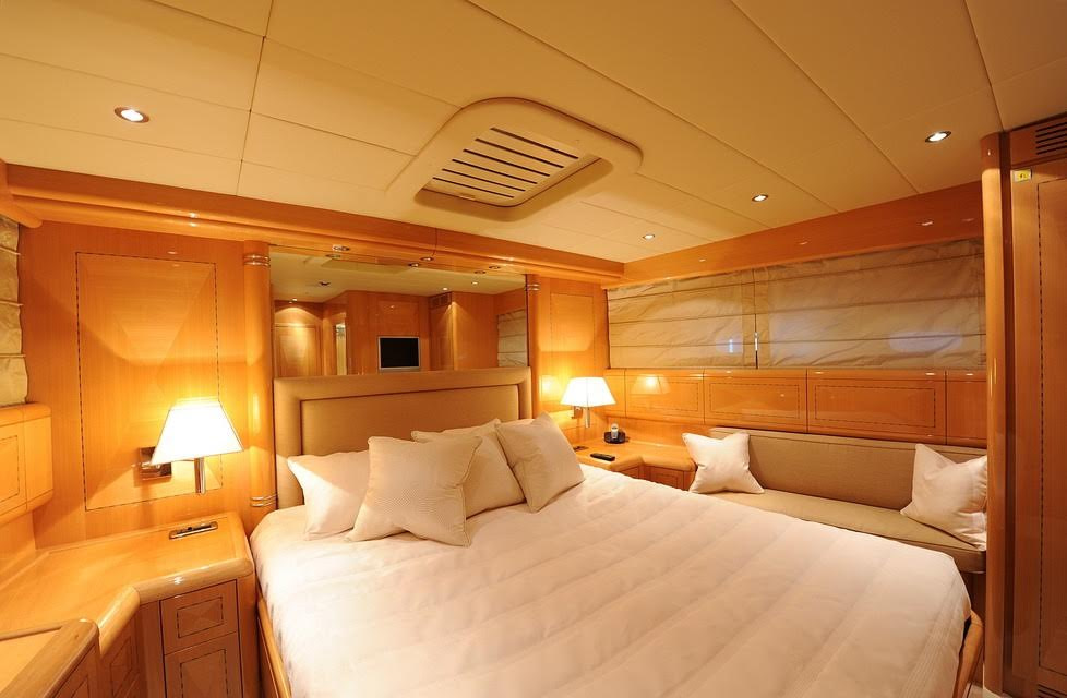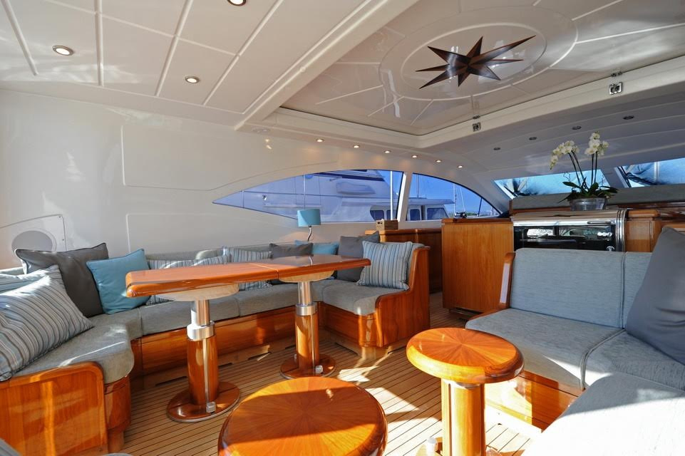 To the aft of the yacht, sun-loungers are perfectly positioning for relaxing in the sun. Towards the bow, another comfortable sun-bathing space can be found, making the Mangusta the ideal yacht for entertaining guests in the warm Mediterranean sun. The main deck also houses the spacious cockpit, where the charming Captain Pascal will guide you on your exciting journey. Also found on the main deck is the gorgeously designed saloon, with a retractable roof to open up the already airy and light room. Comfortable seating and a lavish hard-wood table can be found here, and the plate glass window permits the use of this splendid saloon in all seasons.