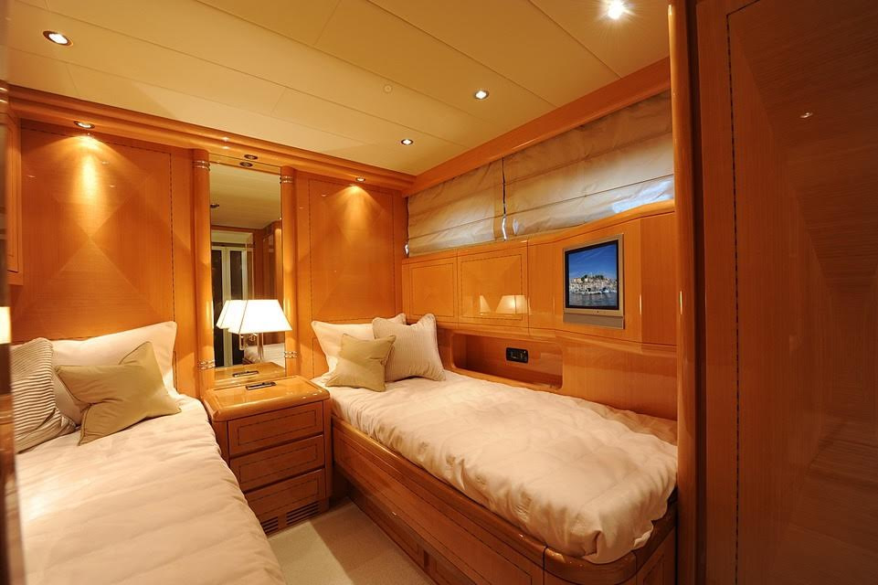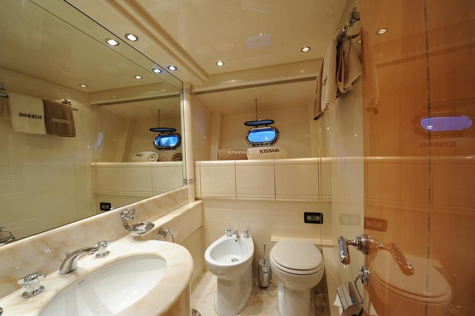 Below deck there is ample living space, with another large saloon found on descent of the gentle stairs. This room is perfect for sinking into the gorgeous couches and enjoying the room’s large flatscreen television. For music lovers, Kissmi features a superb sound-system that allows music to be played throughout the yacht. There are 3 spacious cabins on-board, with the master stateroom boasting an exquisite queen sized bed, another television for your enjoyment, excellent natural lighting and a large en-suite bathroom and shower. The starboard and port side staterooms feature a double bed and twin beds respectively, and each enjoy spacious en-suites. Overall, 8 guests can sleep on-board this beautiful vessel.