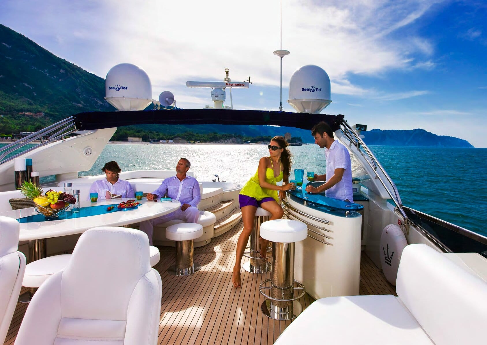 Motor yacht NASEEM makes excellent usage of its abundant flattering outdoor spaces. Nestled on top of her vast fly bridge lies a superb outdoor area for friends and family to enjoy. Why not soak in the Jacuzzi while enjoying unrestricted views of the Mediterranean from this ideal elevated vantage point, a truly once in a lifetime experience! There is also a stunning dining area on the fly bridge, ideal for sampling local cuisines meticulously prepared by the onboard chef or relaxing with a chacuterie board and a glass of wine watching the sun set over the rugged Italian coastline. Beside this there is a refreshment area where a member of crew would be more than happy to prepare a drink of your liking for you upon request. There are also large sun pads to be enjoyed as you bask in the Italian sunshine!