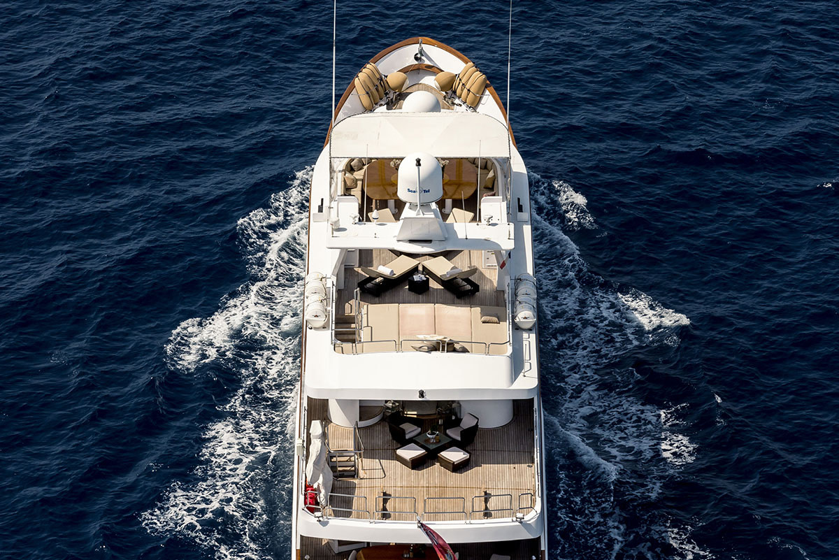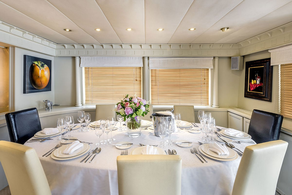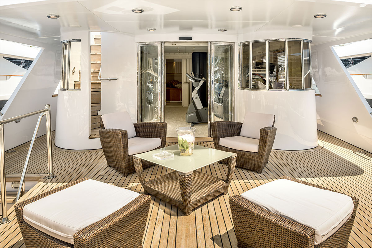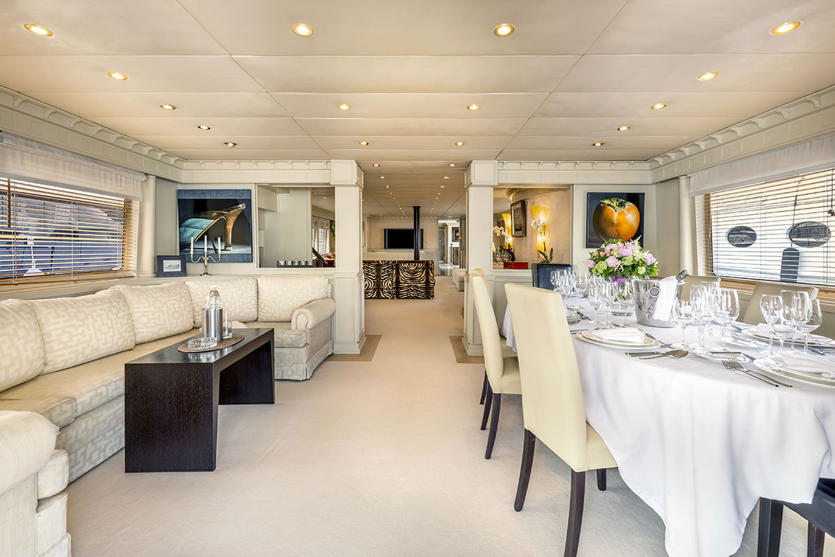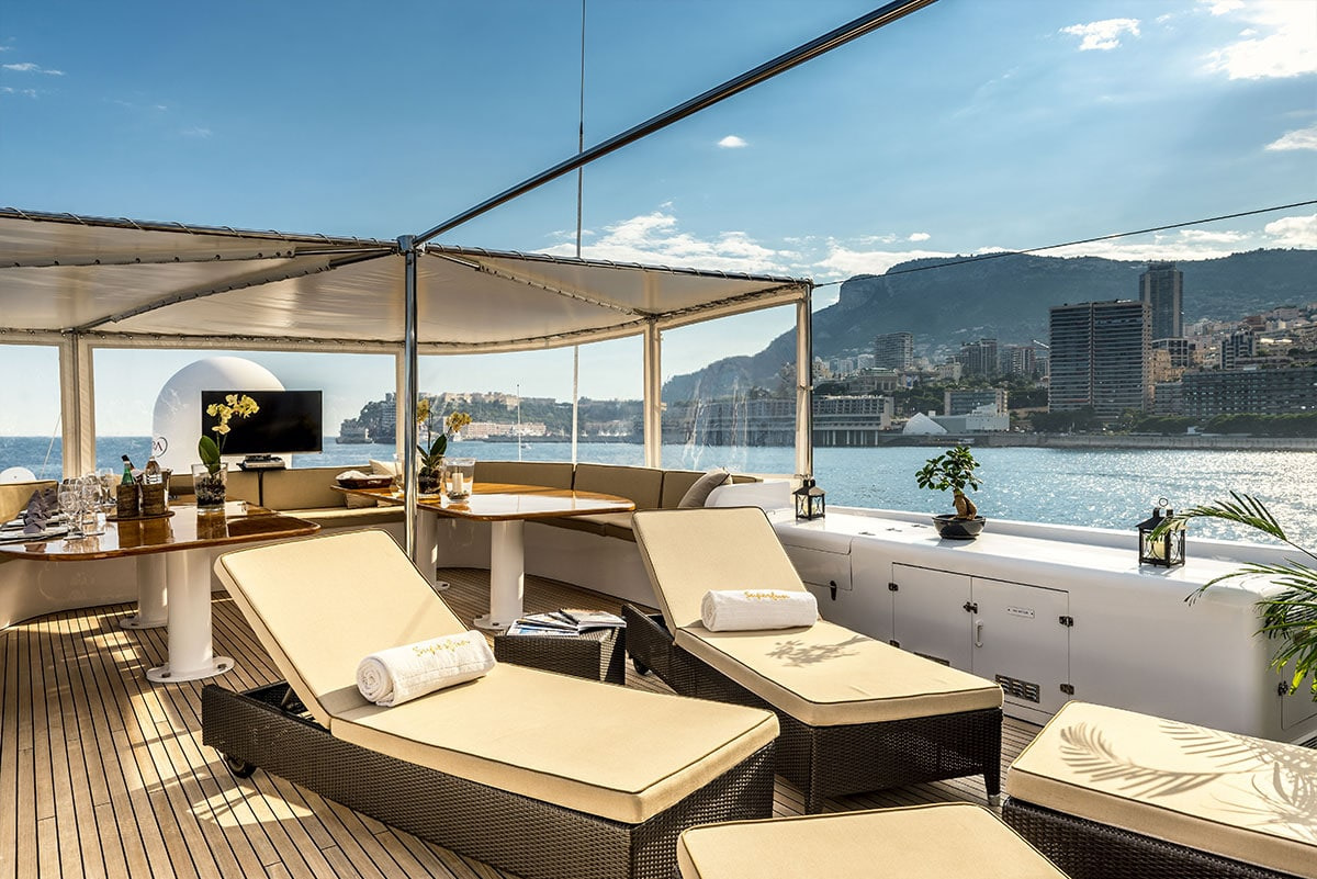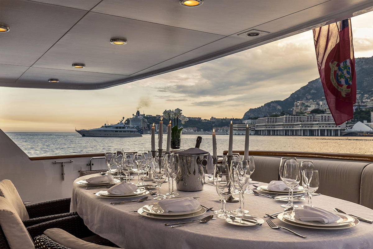 The dining table on the aft of the saloon deck serves as an opportunity for guests to fully take advantage of the tropical temperatures and views of the picturesque Mediterranean coastline over some superb food and drink.