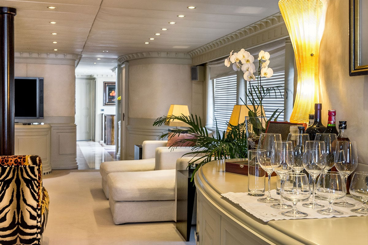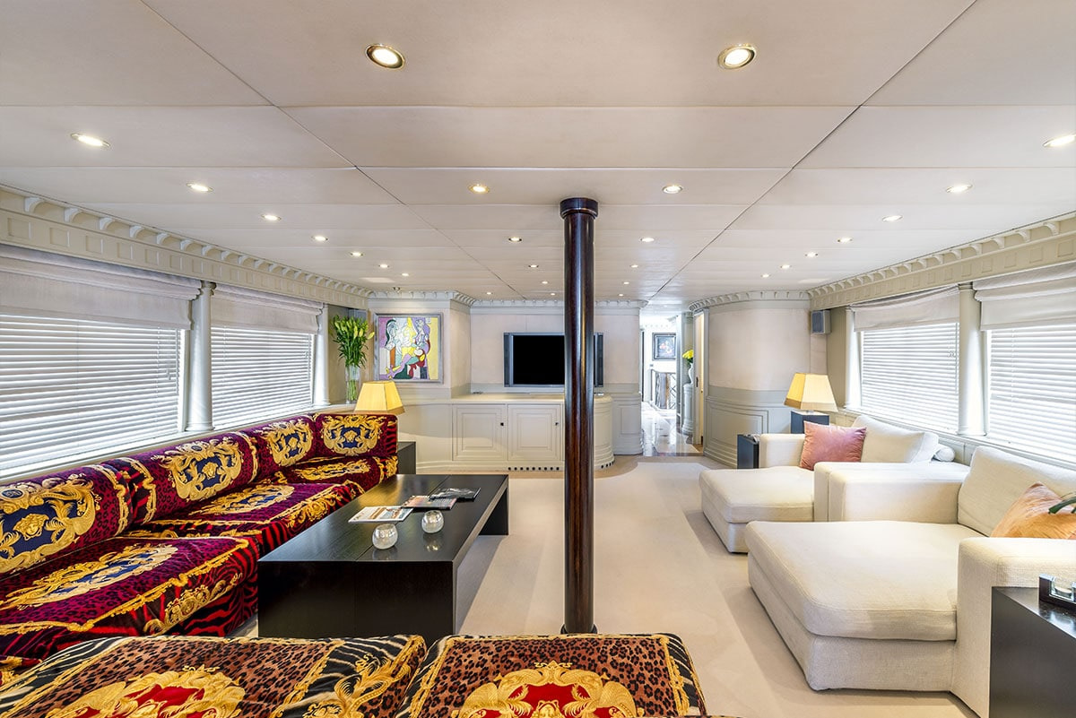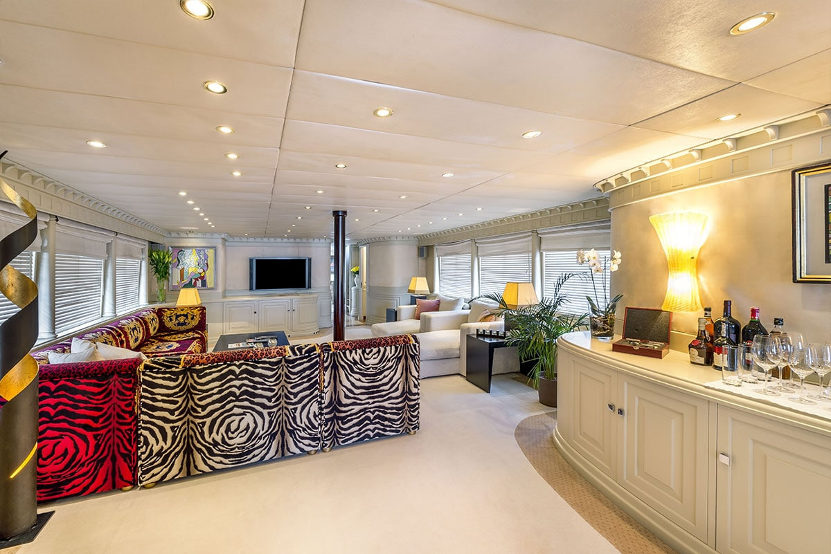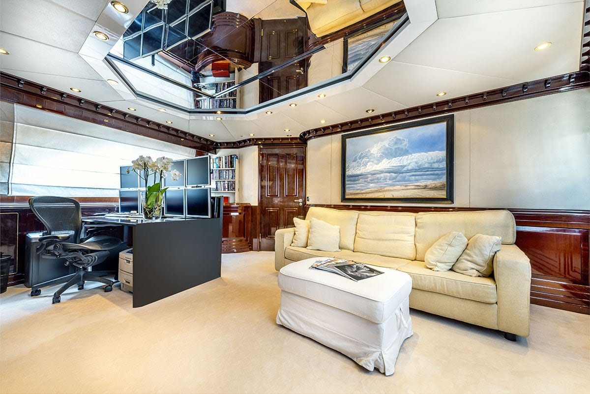 Moving to the interior of the yacht, which was designed by Marquet, the saloon deck is, unsurprisingly, very spacious. It features large seating areas for guests to enjoy whilst escaping the sun, in addition to yet another Satellite TV. Towards the end of the deck is a formal interior dining area, another casual seating area, and a large office, again with a separate seating area! Five luxurious cabins (4 King beds, two singles) are located throughout the yacht.