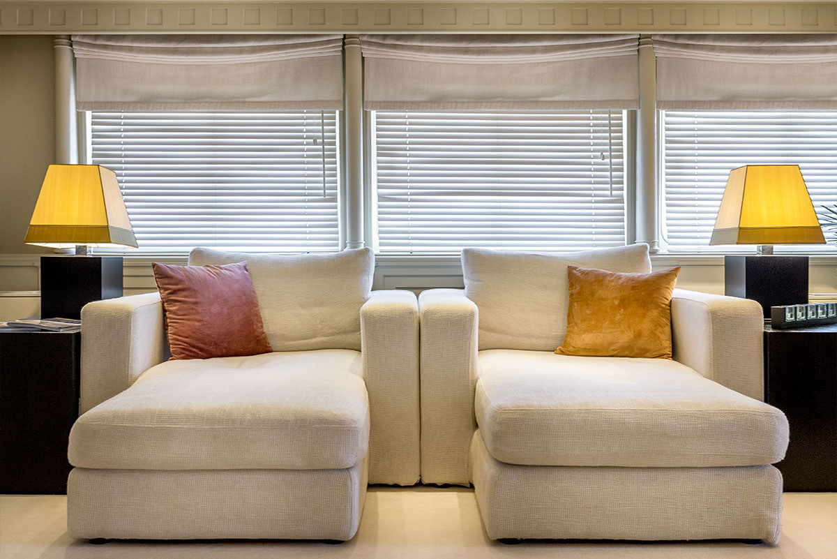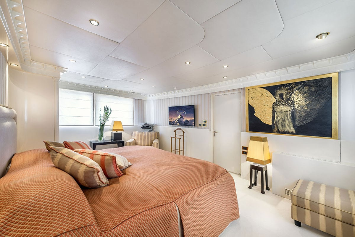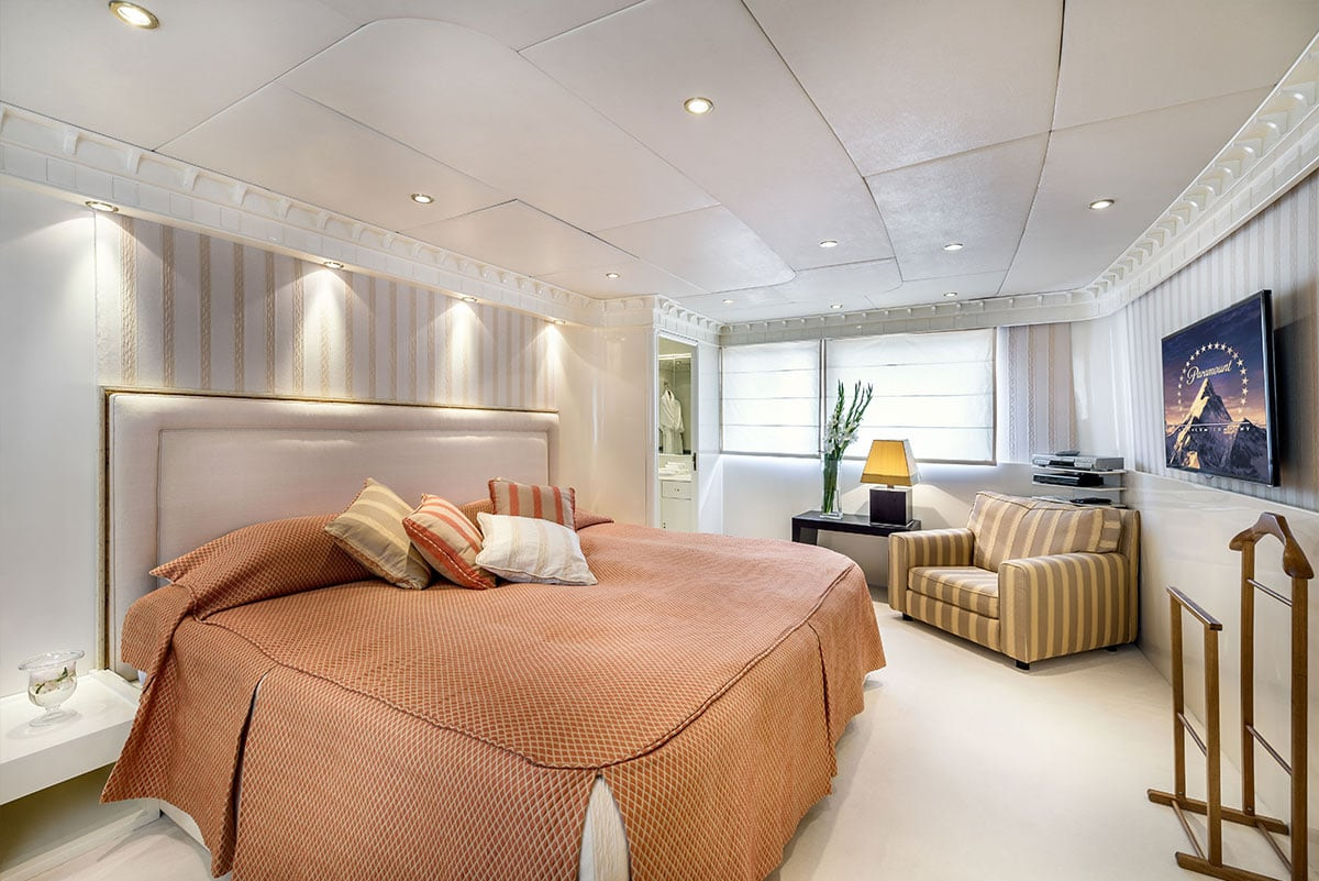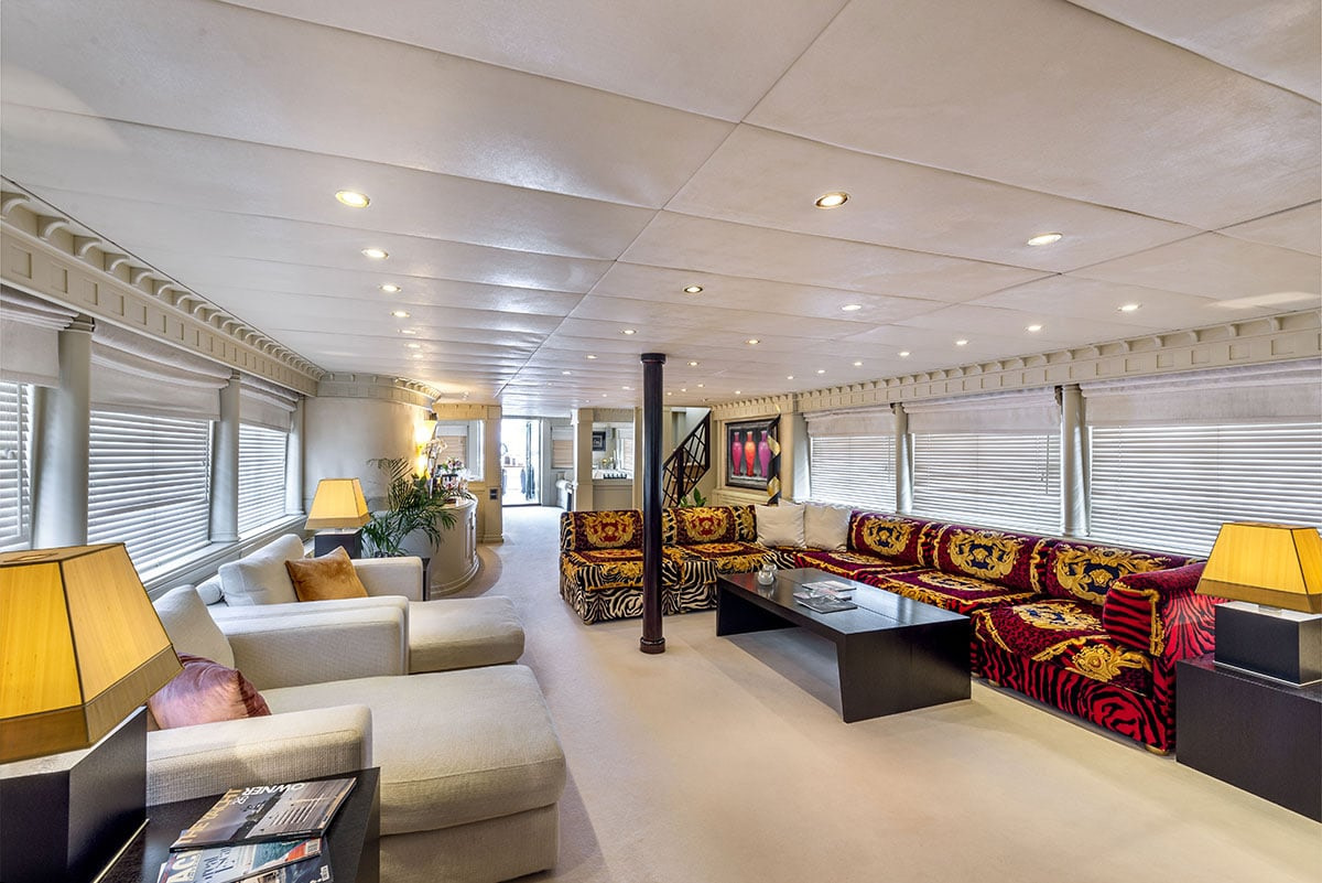 Moving to the interior of the yacht, which was designed by Marquet, the saloon deck is, unsurprisingly, very spacious. It features large seating areas for guests to enjoy whilst escaping the sun, in addition to yet another Satellite TV. Towards the end of the deck is a formal interior dining area, another casual seating area, and a large office, again with a separate seating area! Five luxurious cabins (4 King beds, two singles) are located throughout the yacht.