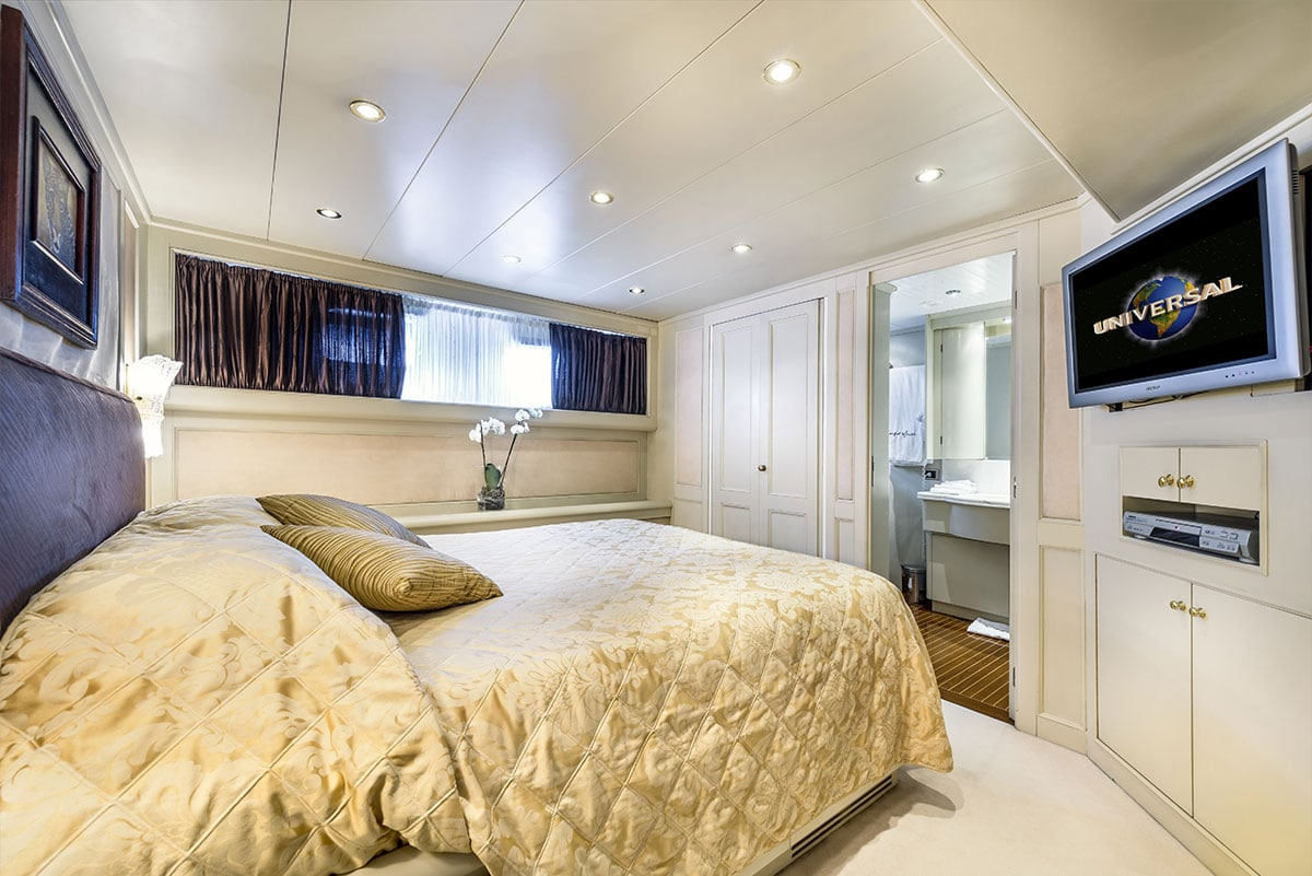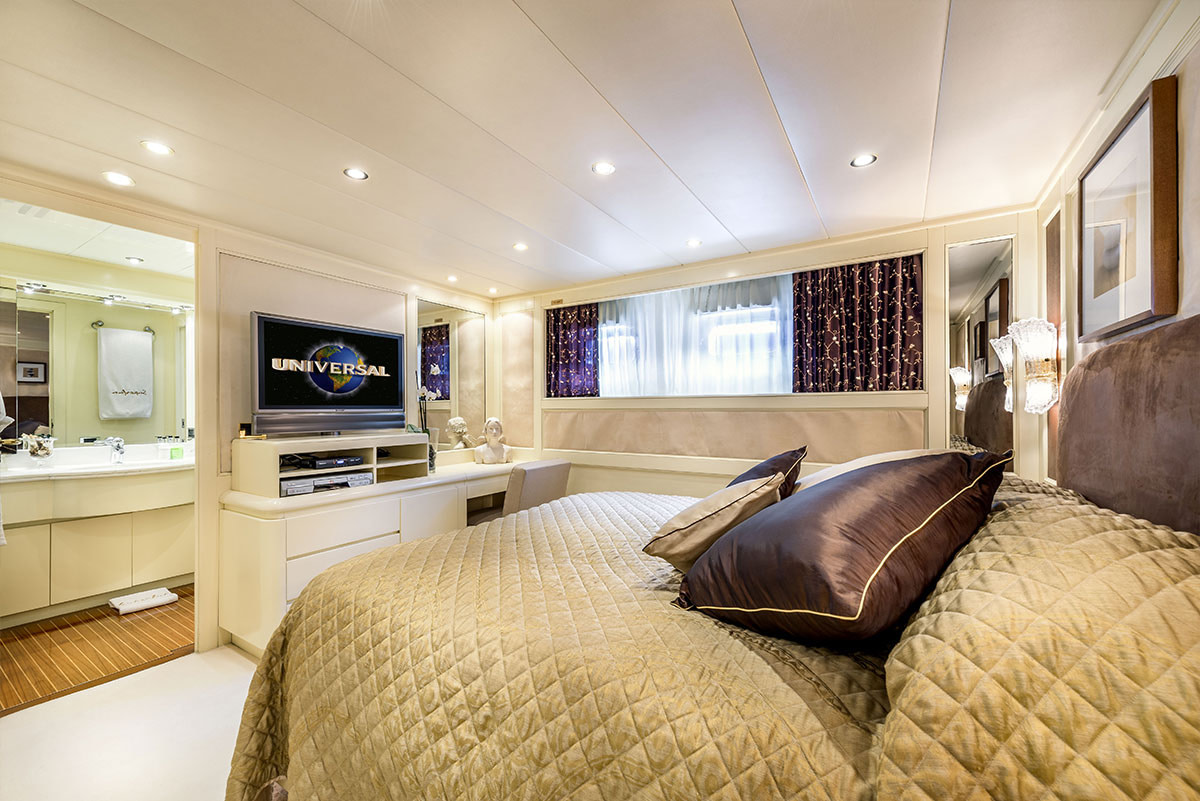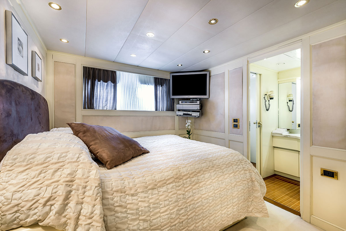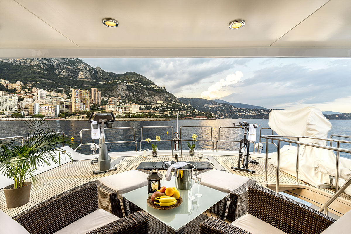 The sky deck features plenty of sunbeds as well as a roomy dining table sheltered from the wind and sun, so that guests can enjoy a beautiful lunch without missing out on the summer warmth! Also included on the sky deck is an inflatable jacuzzi, to make the yacht that little bit more luxurious, and provide guests with yet another way of relaxing. If this wasn’t enough for one deck, the sky deck also has a satellite TV, and gym equipment can be set up on the deck, so that guests can get there exercise in with 360 degree views of paradise.