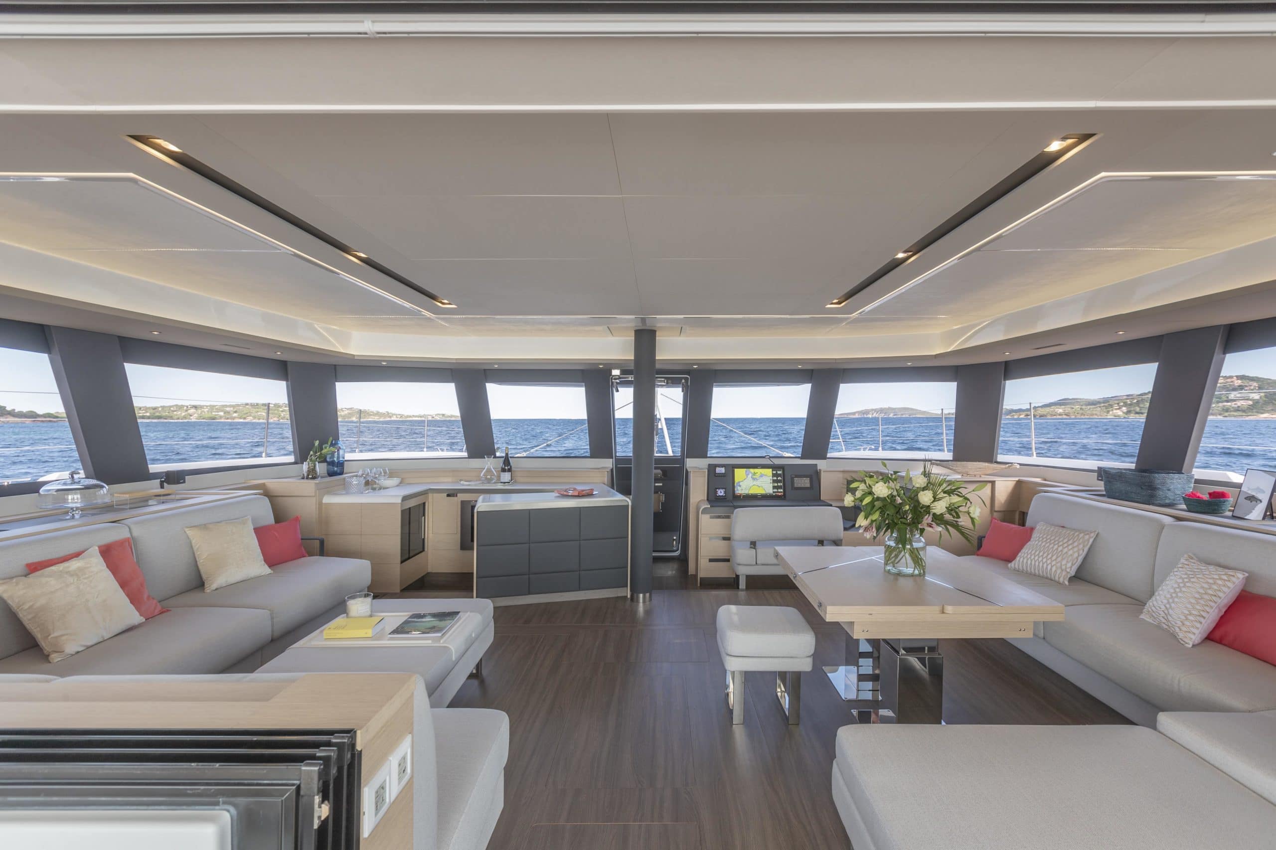 The simple, spacious aft features the yachts very own barbecue alongside sunbeds and a large table for guests to enjoy a fantastic al fresco dining experience with a view. The main saloon on the Number One catamaran Greece offers guests an opportunity to escape the sun and chill on the sofas. It also features an indoor dining table should guests wish to use it.