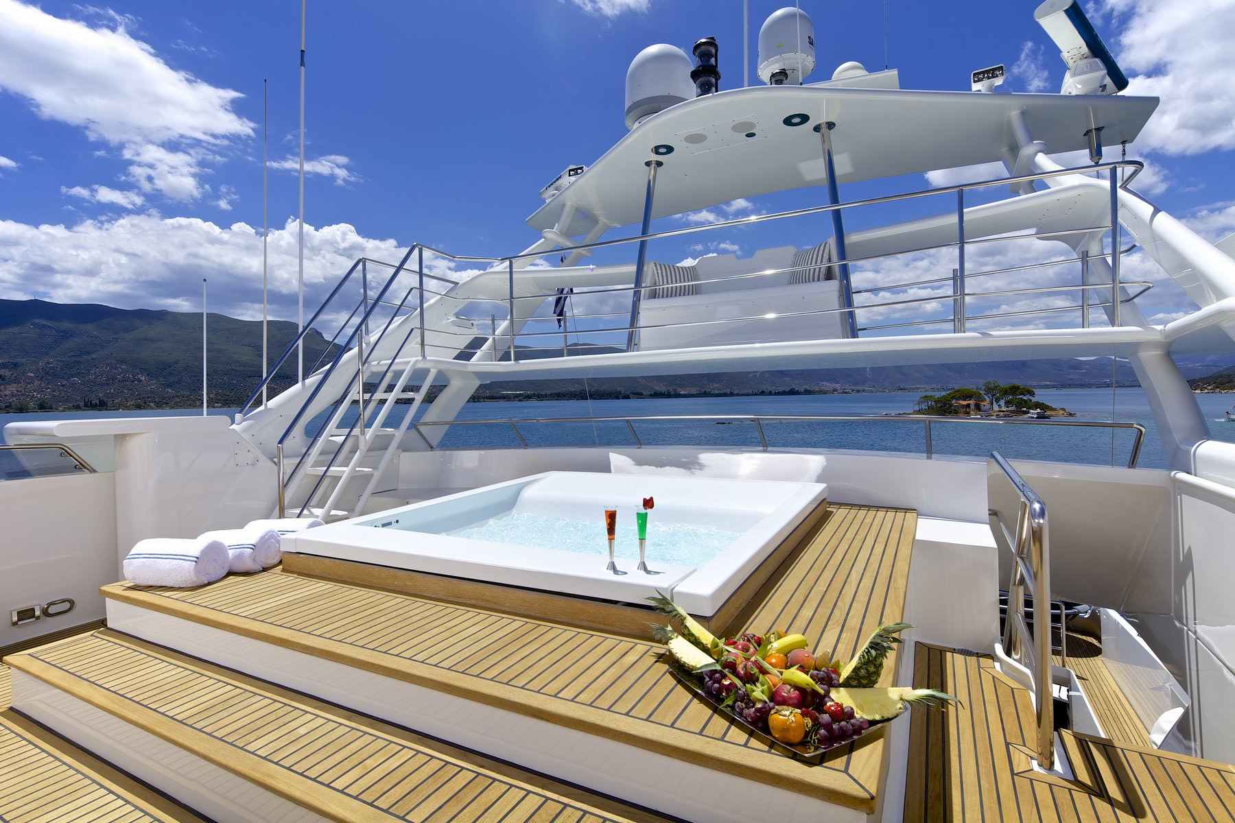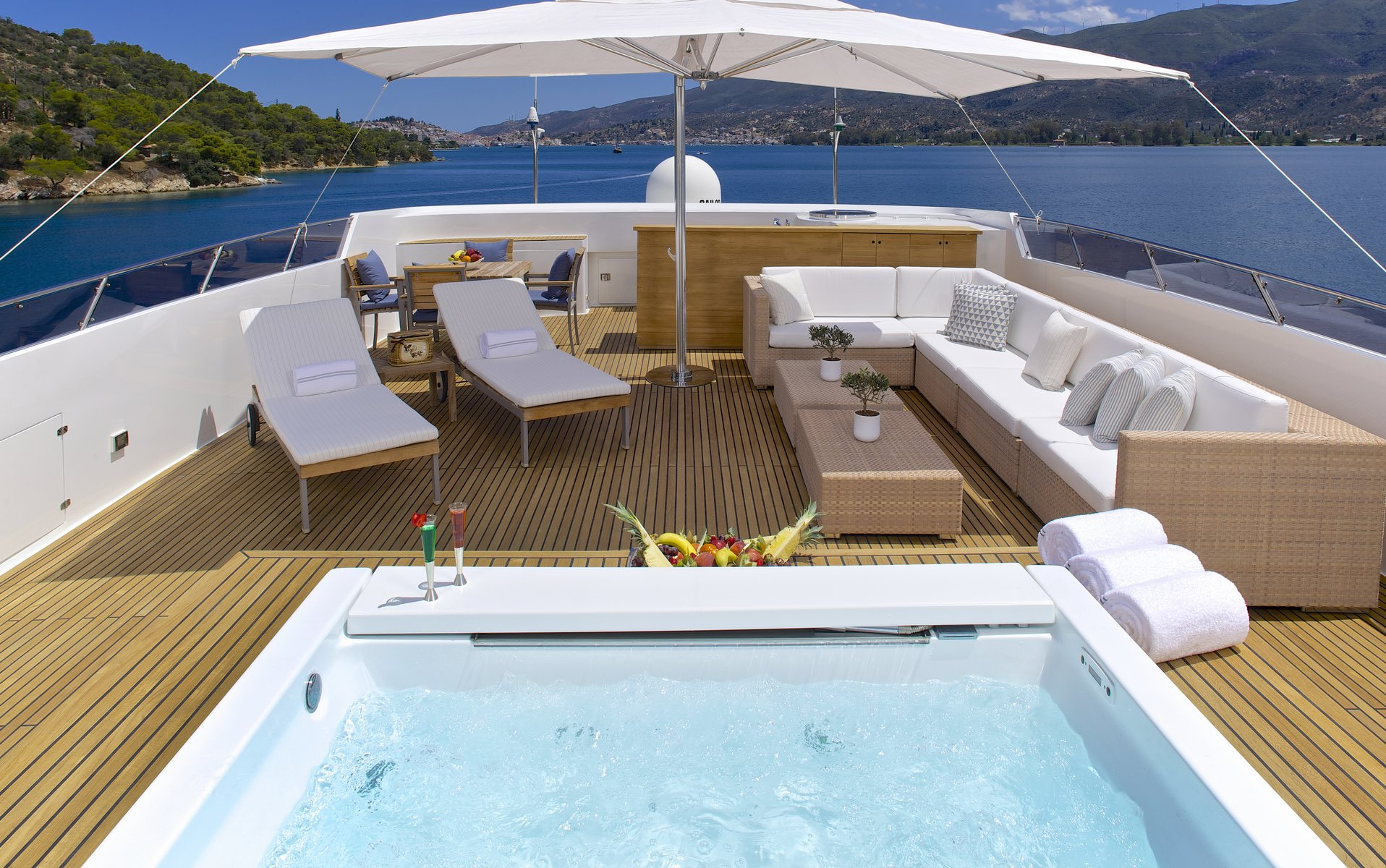 O’Leanna boasts a truly remarkable amount of exterior space. Her upper deck is ideal for entertaining or relaxing in the sun, with a large jacuzzi, sun loungers, comfortable seating and added sun-shade. Deck 2 features more sun-lounging space, and on the lower aft deck you will find a spacious and atmospheric dining space with spectacular, unobstructed views.