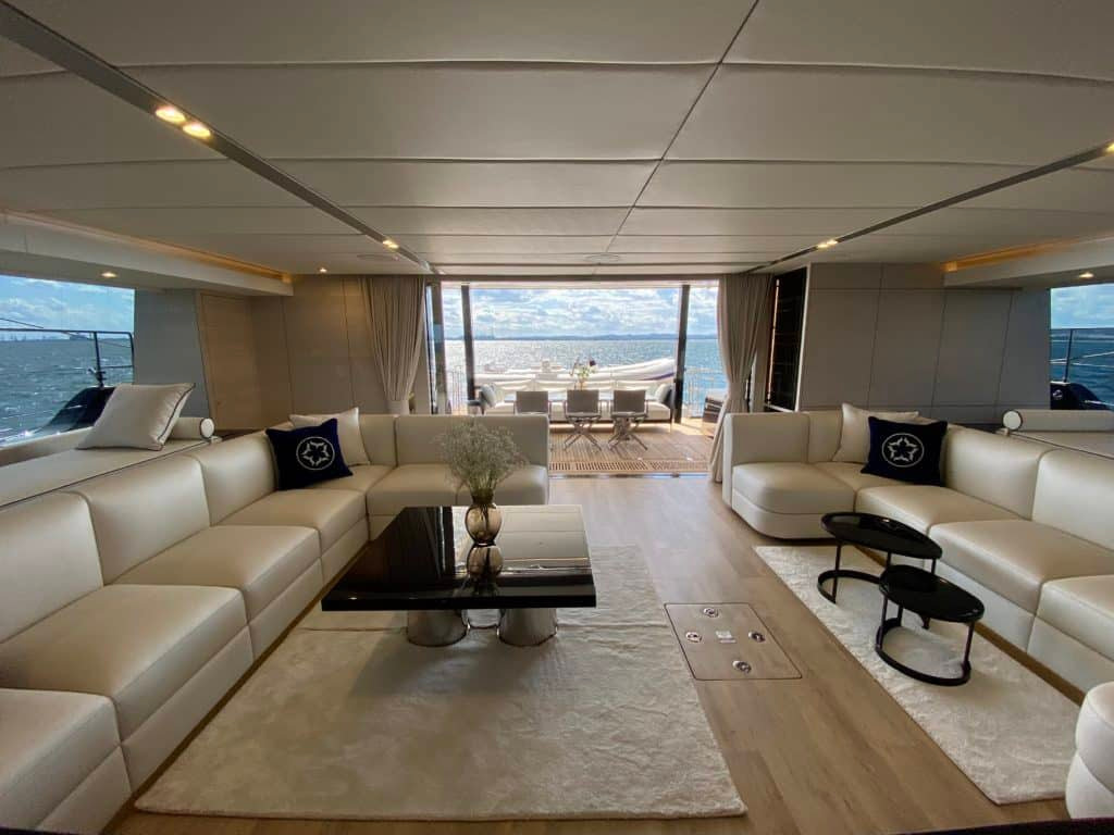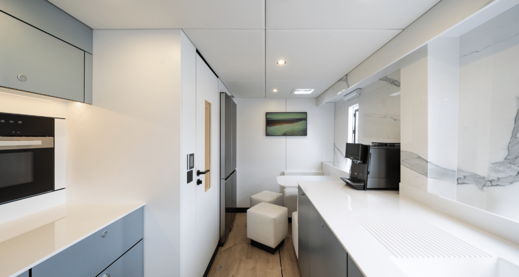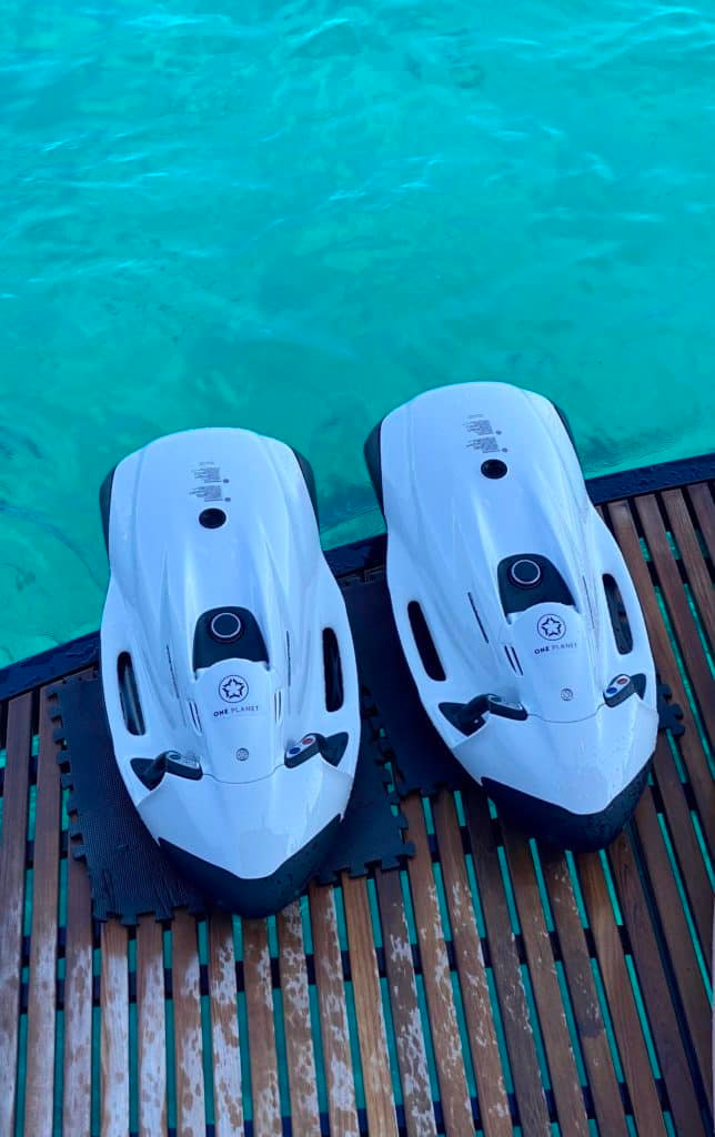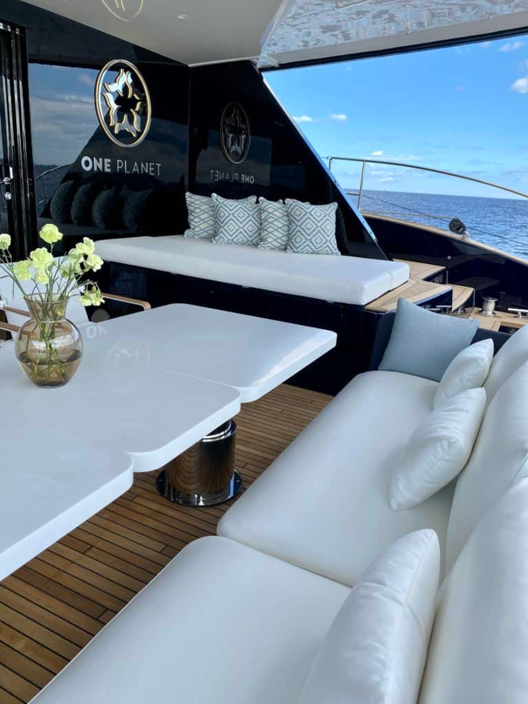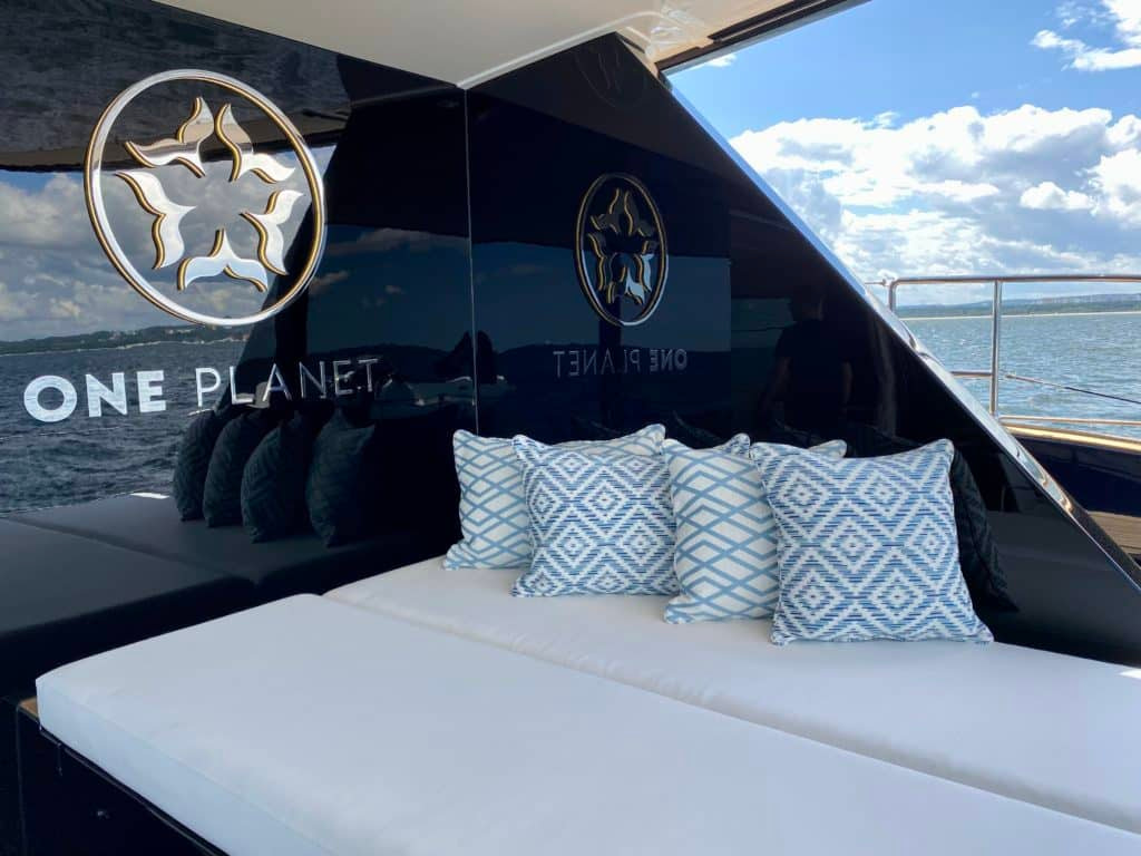 One Planet comes equipped with a selection of water toys and accessories to elevate your charter experience. Glide across the water’s surface with two F5S SEABOBs or showcase your skills with wakeboards. Explore the tranquil seas with two kayaks or effortlessly travel from land to sea with a Williams Jet Tender. The yacht’s special features, including Starlink, a convertible cinema, sunpads, and air conditioning, ensure that every moment on board is filled with luxury and enjoyment.