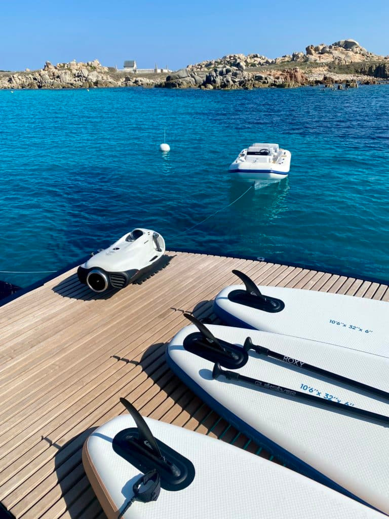 For your relaxation and enjoyment, One Planet boasts a range of facilities, including Starlink, a convertible cinema, Wi-Fi, a swimming platform, sunpads, and air conditioning. Additionally, the yacht offers a variety of recreation facilities, from kayaks and SEABOBs to stand-up paddleboards and wakeboards, ensuring there’s never a dull moment during your charter.