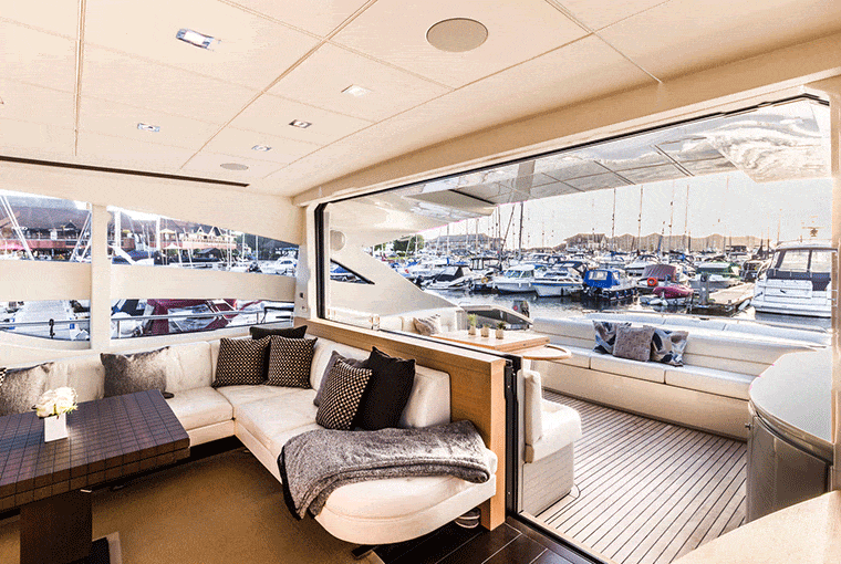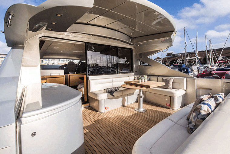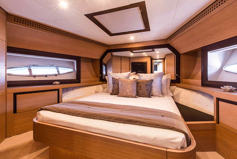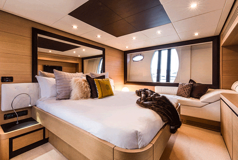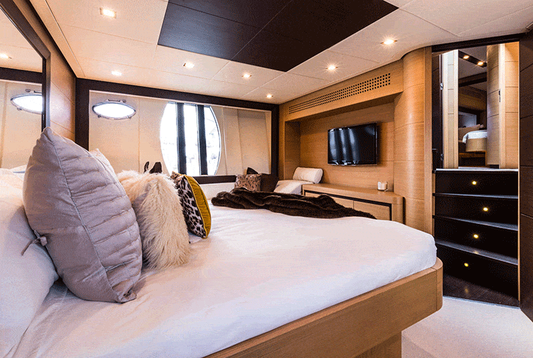 The inside of this trendy Pershing Motor yacht is just as aesthetically pleasing as the exterior. The ultra-modern saloon has a warm and contemporary feel, thanks to the contrasting light and dark furnishings. It again creates the perfect communal area for guests to enjoy one another’s company.