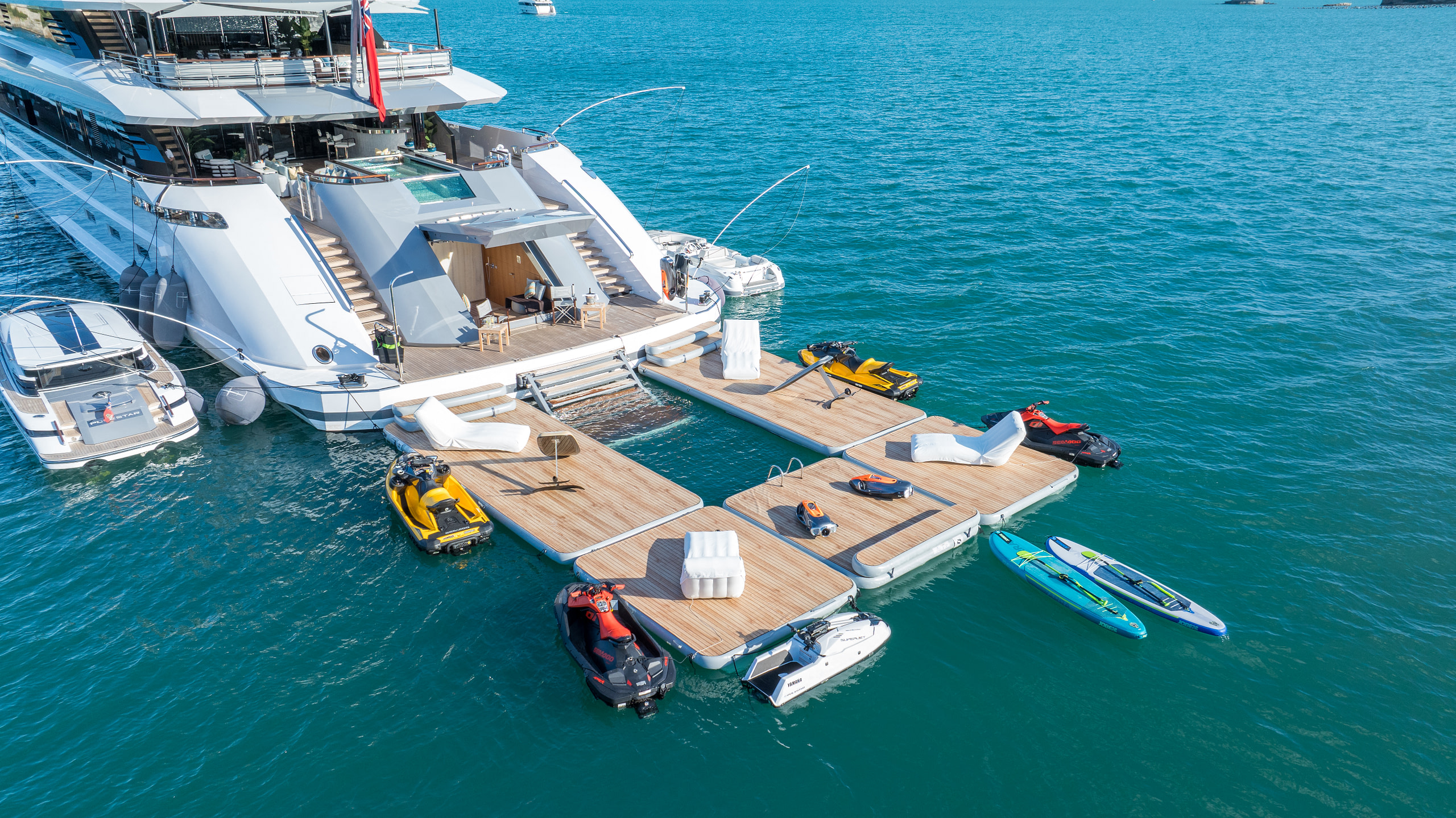 Wellness and fitness are at the heart of a Polestar yacht charter. The yacht boasts a fully equipped gym, a soothing sauna, a hammam, and a custom-designed massage room for a spa-like retreat at sea. For thrill-seekers, the expansive beach club features an impressive collection of water toys, including Flyboards, Jet Skis, towable inflatables, waterskis, Seabobs, wakeboards, spearfishing gear, and scuba diving equipment. Two elegant tenders, including a 10-meter Rossinavi limo tender, allow for seamless exploration of secluded coves and pristine beaches.