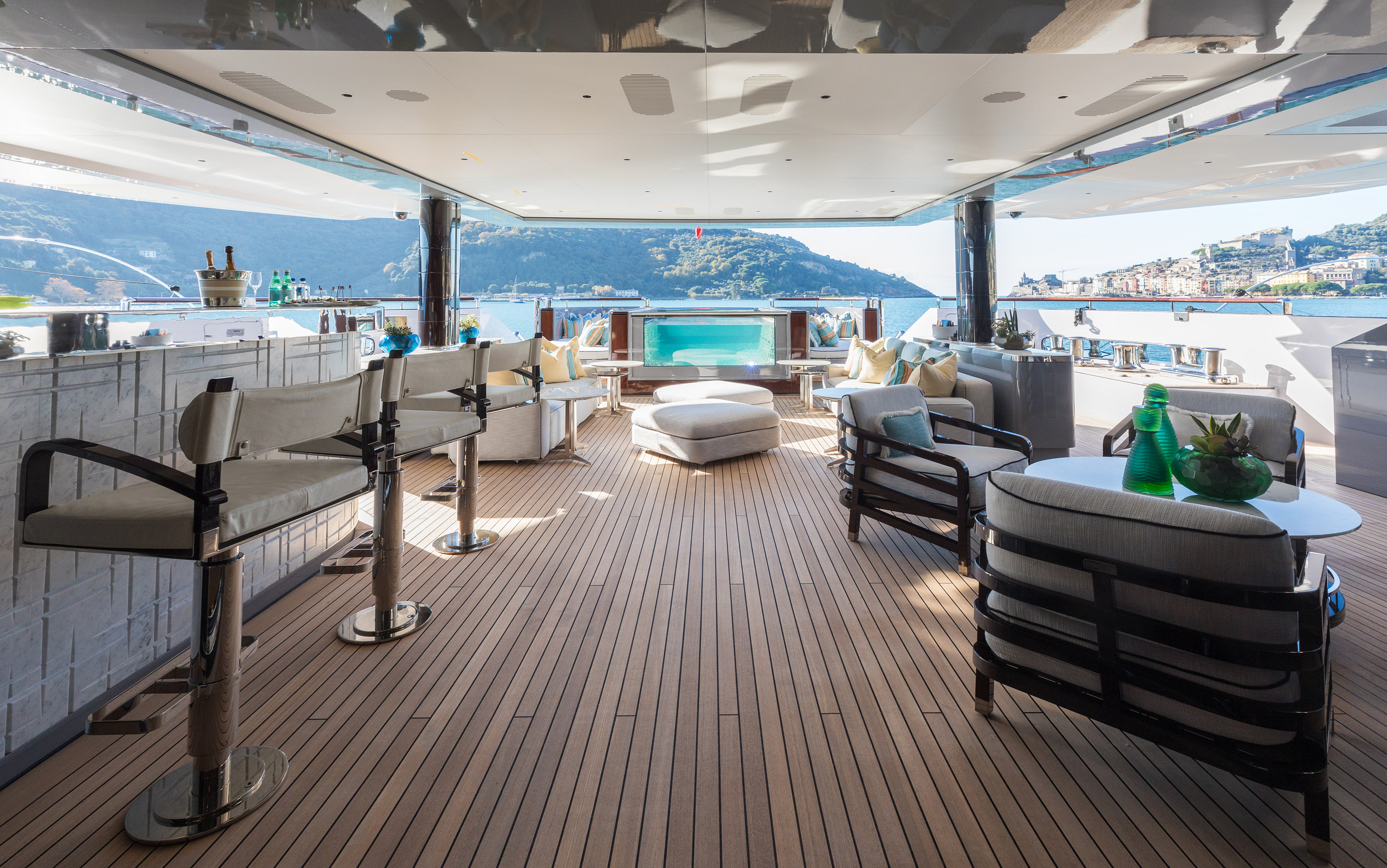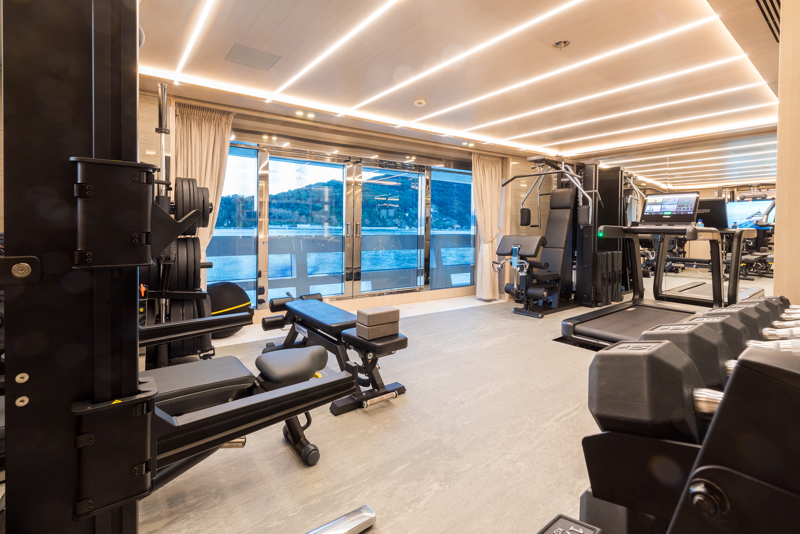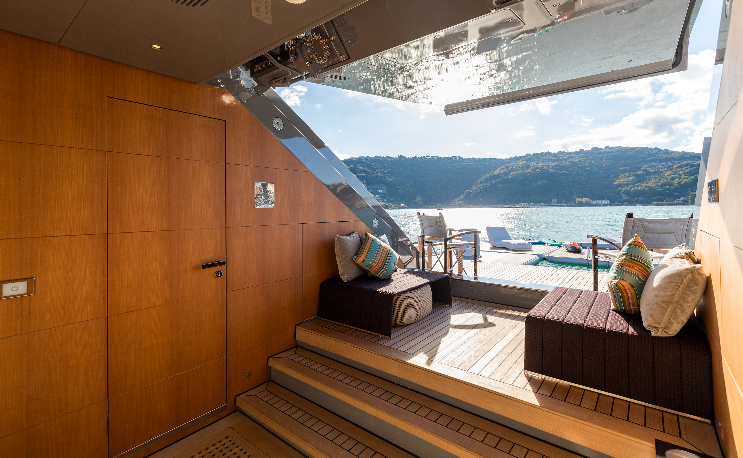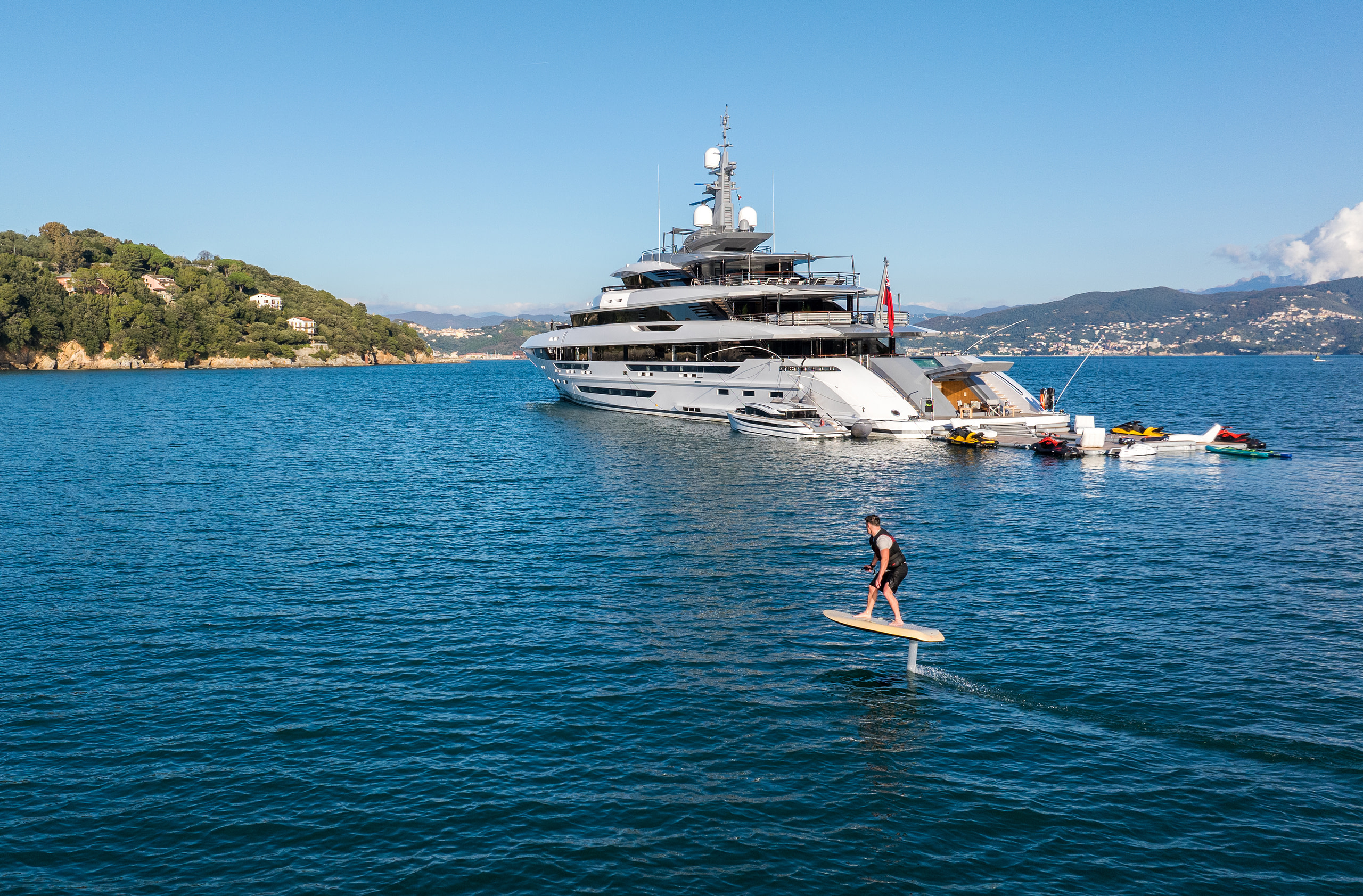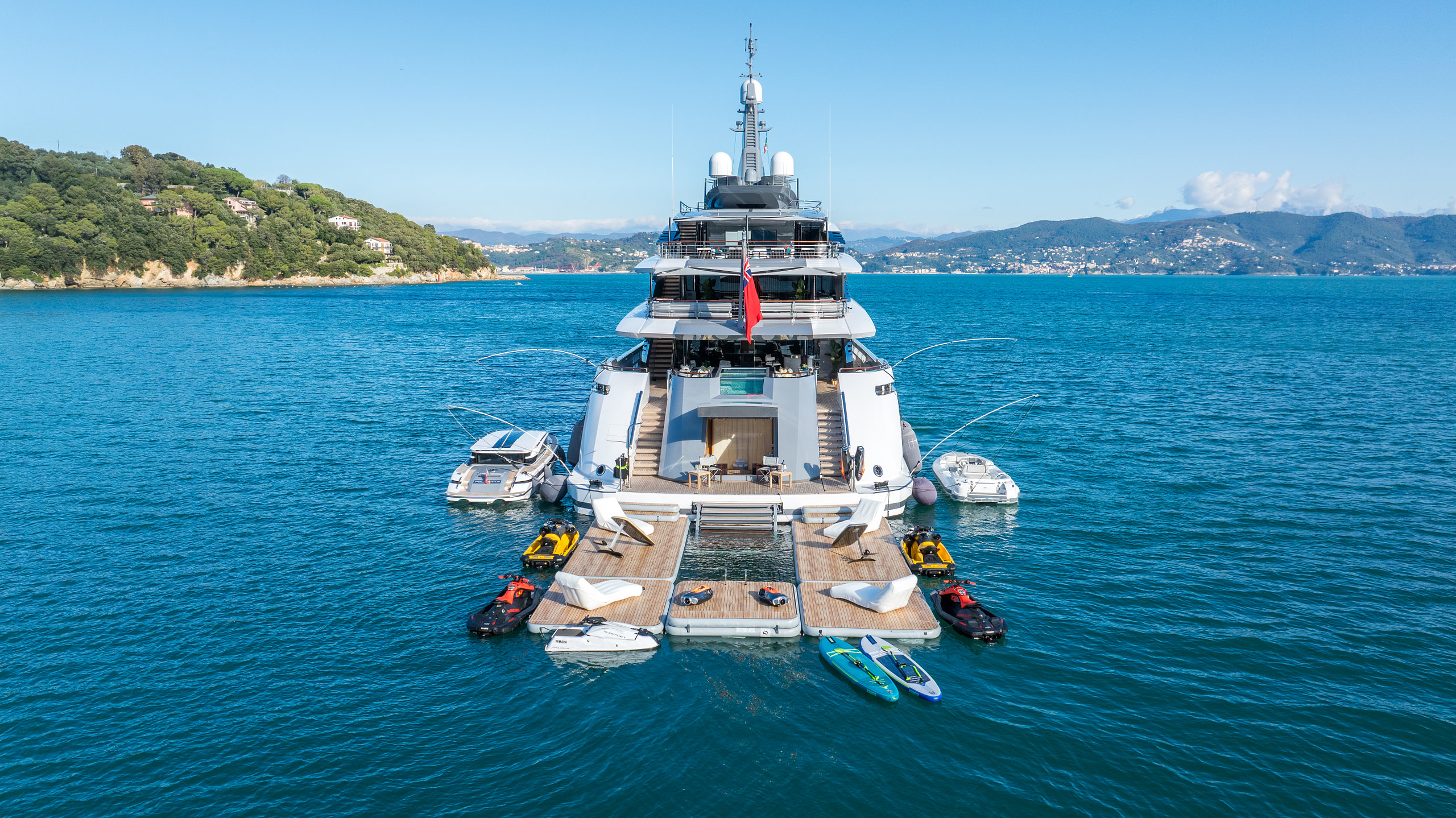 Wellness and fitness are at the heart of a Polestar yacht charter. The yacht boasts a fully equipped gym, a soothing sauna, a hammam, and a custom-designed massage room for a spa-like retreat at sea. For thrill-seekers, the expansive beach club features an impressive collection of water toys, including Flyboards, Jet Skis, towable inflatables, waterskis, Seabobs, wakeboards, spearfishing gear, and scuba diving equipment. Two elegant tenders, including a 10-meter Rossinavi limo tender, allow for seamless exploration of secluded coves and pristine beaches.