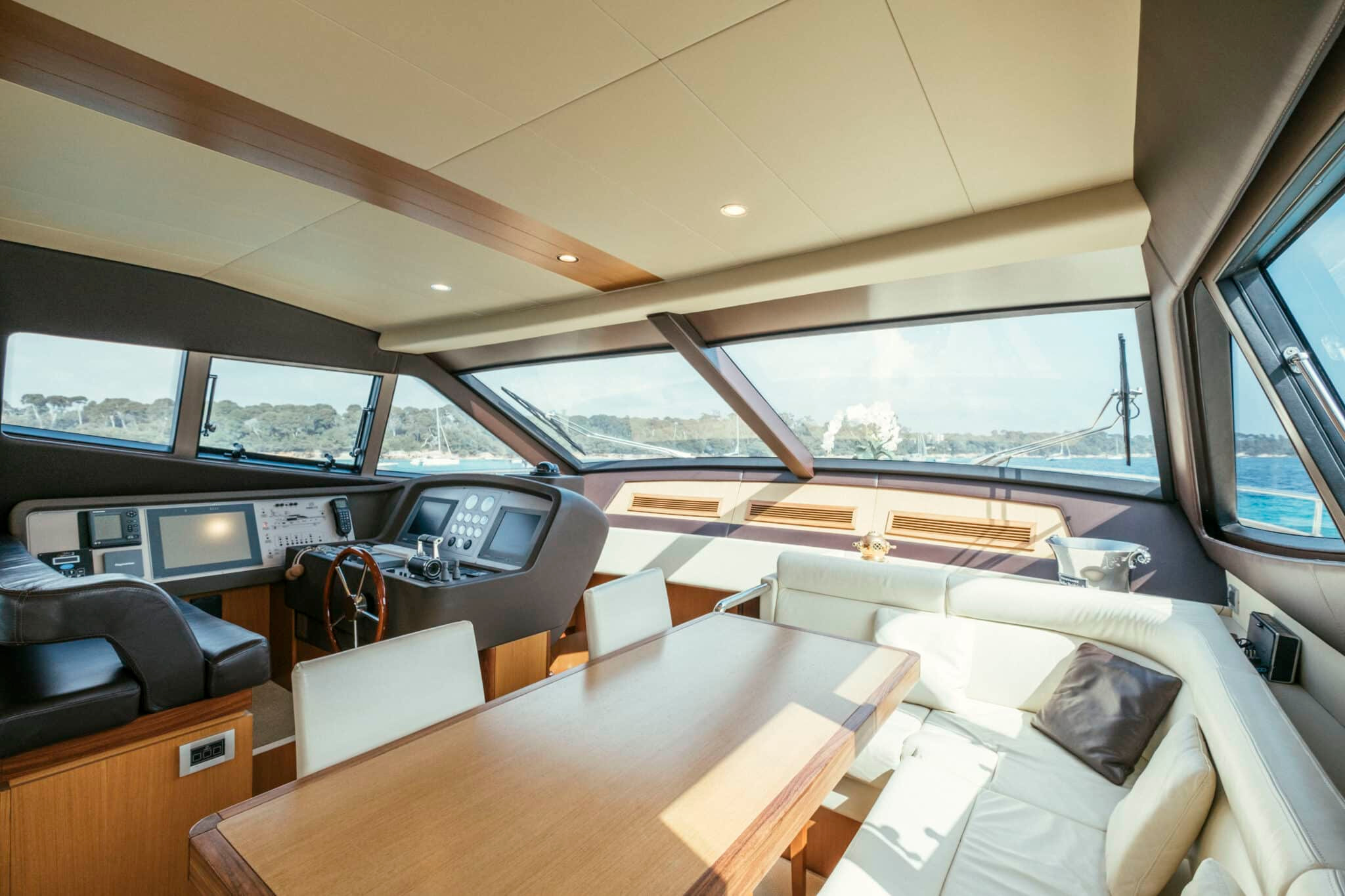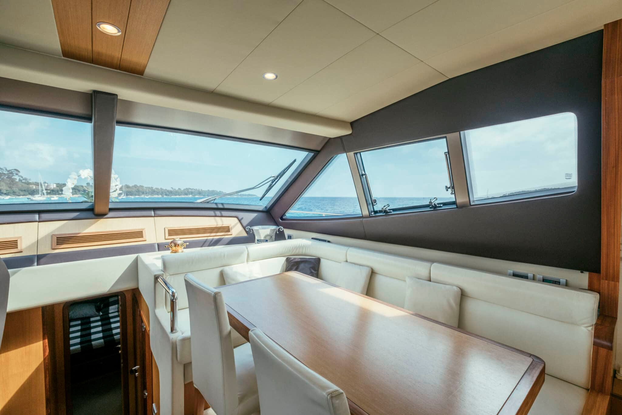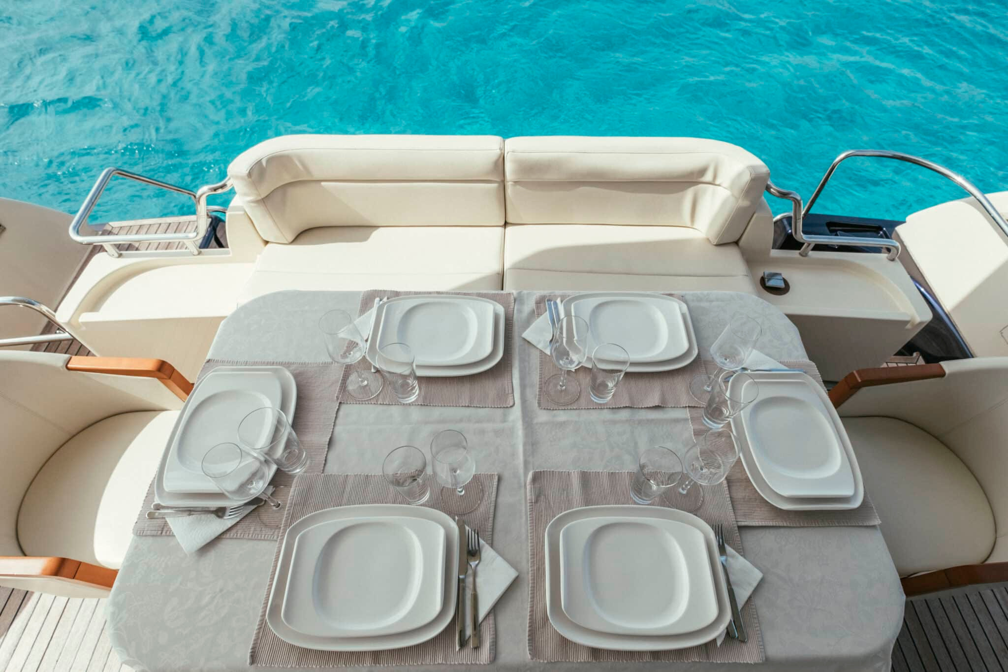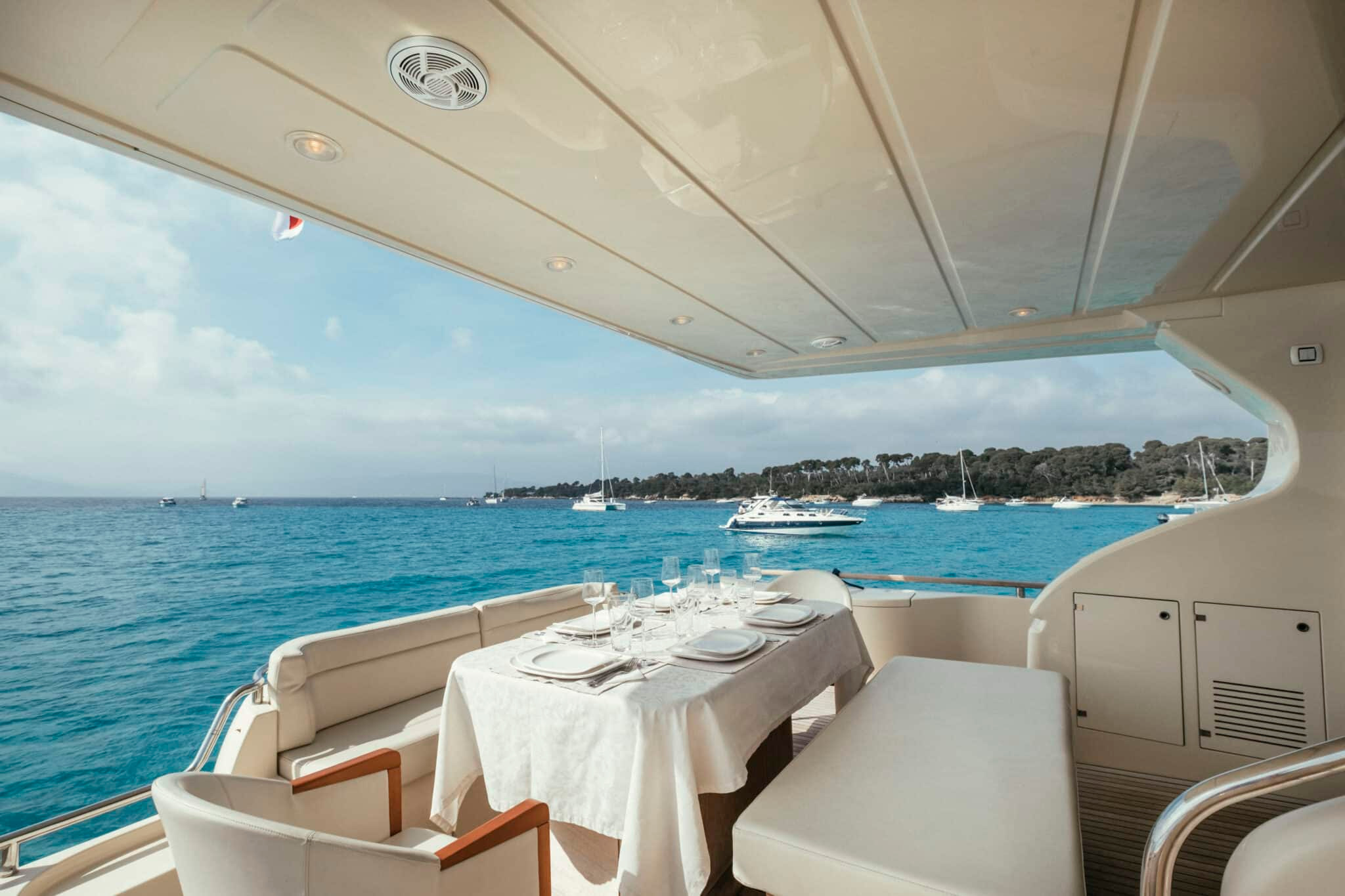 As you make your way to the main salon, you’ll discover a spacious lounge area perfect for entertaining guests or enjoying a peaceful moment alone. The lounge includes full entertainment systems to ensure you have everything you need for the ultimate relaxation experience. The formal dining area is located further forward in a raised position, providing panoramic views through large side windows that bring in ample natural light. Here, you can savor delicious meals while enjoying the stunning Mediterranean scenery. No wonder why so many choose to rent a Ferretti in France!
