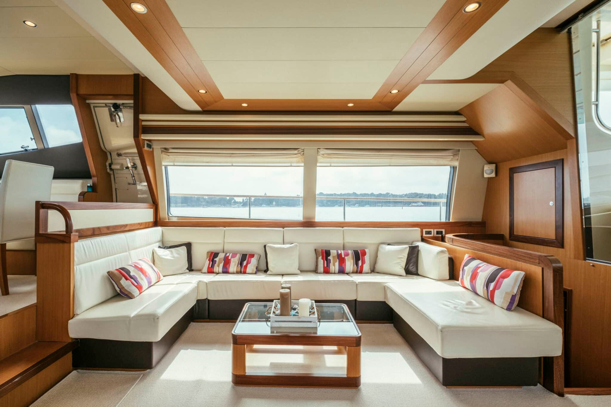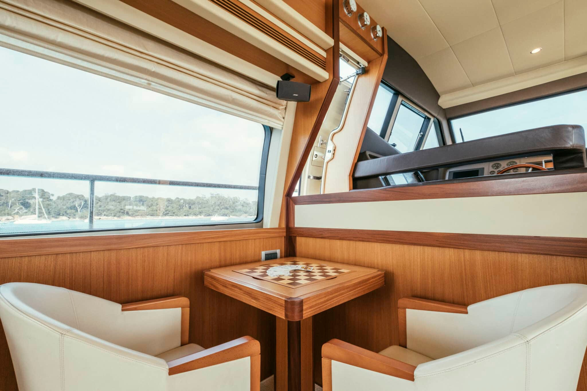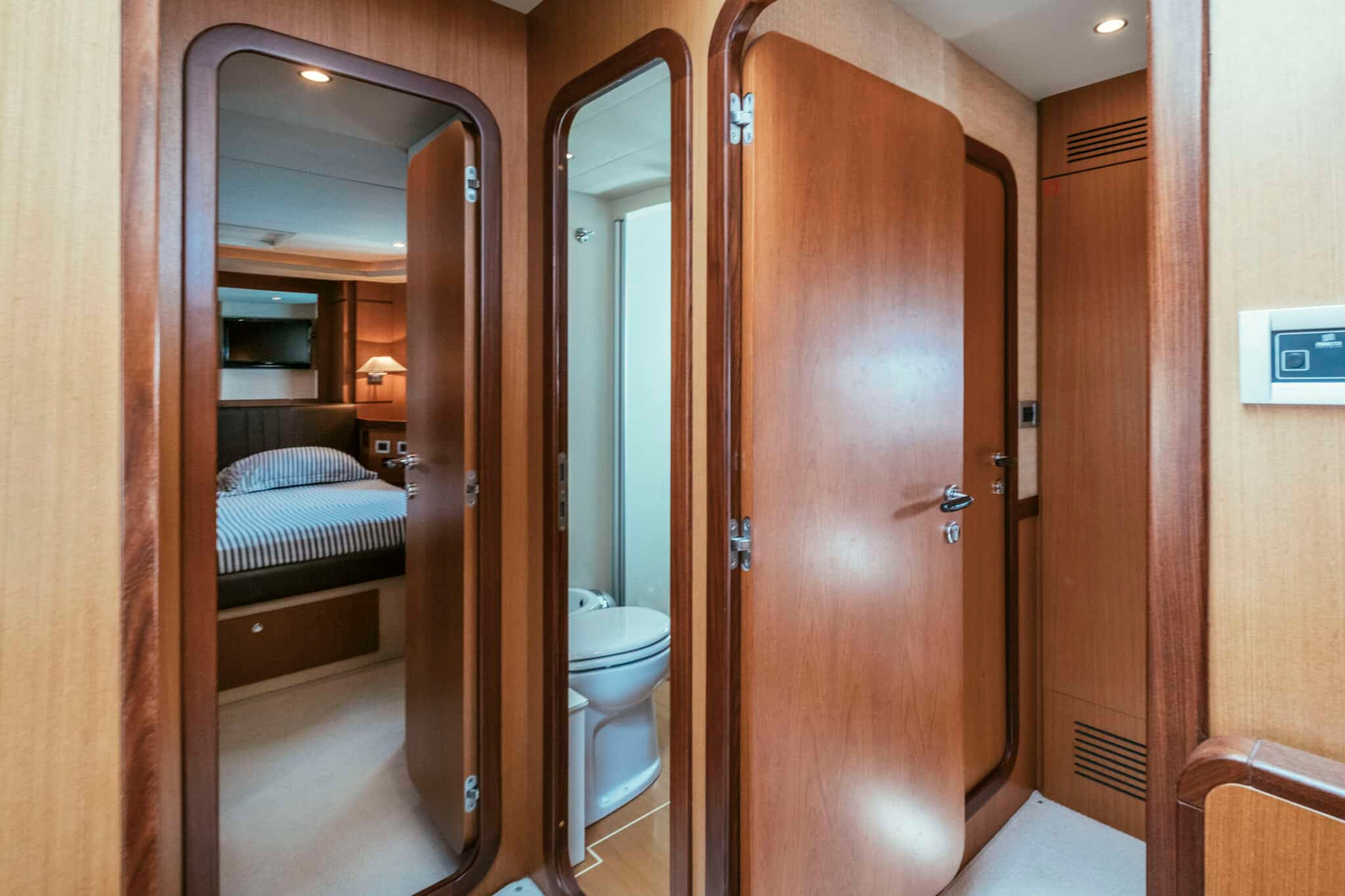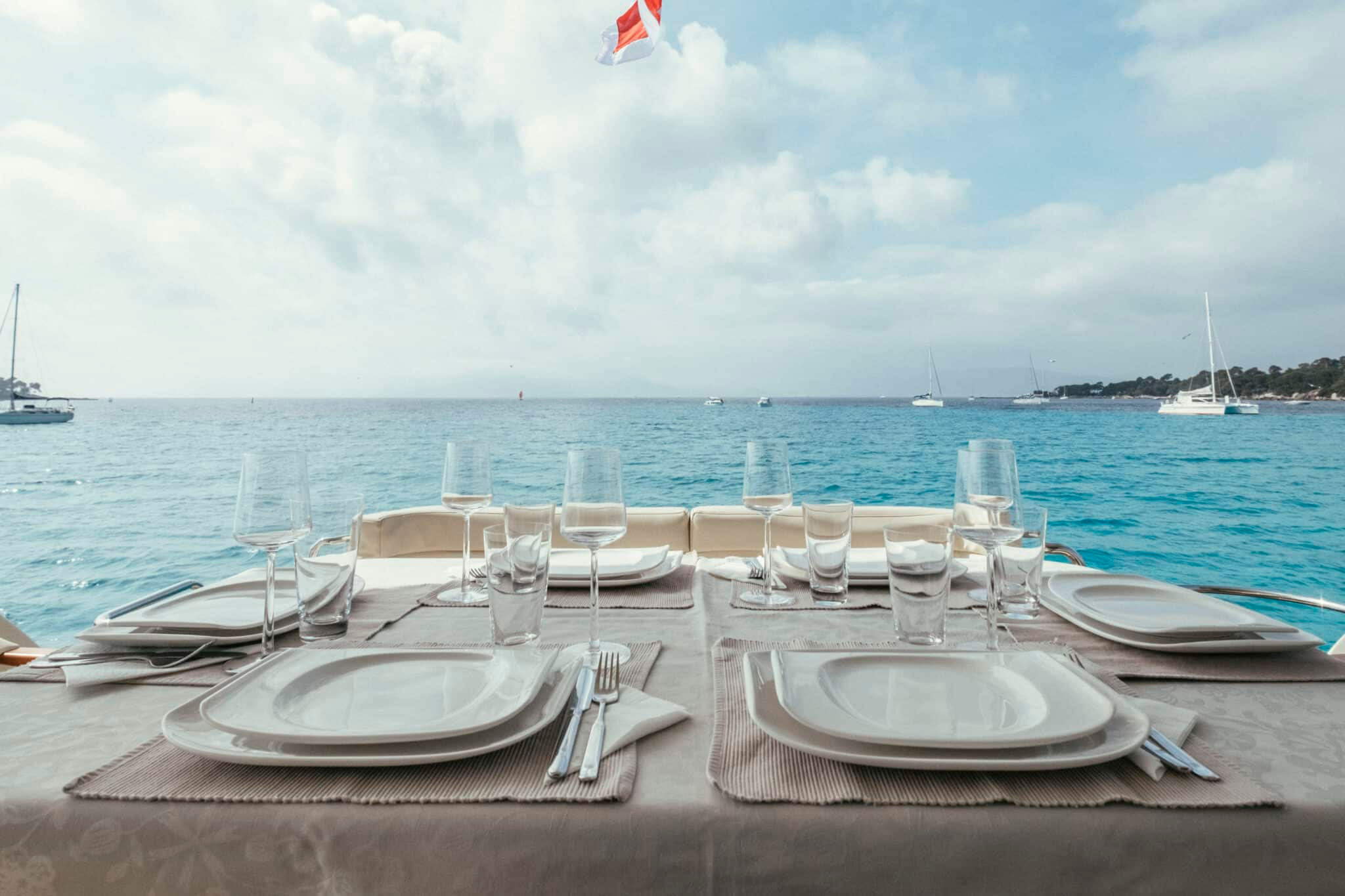 As you make your way to the main salon, you’ll discover a spacious lounge area perfect for entertaining guests or enjoying a peaceful moment alone. The lounge includes full entertainment systems to ensure you have everything you need for the ultimate relaxation experience. The formal dining area is located further forward in a raised position, providing panoramic views through large side windows that bring in ample natural light. Here, you can savor delicious meals while enjoying the stunning Mediterranean scenery. No wonder why so many choose to rent a Ferretti in France!