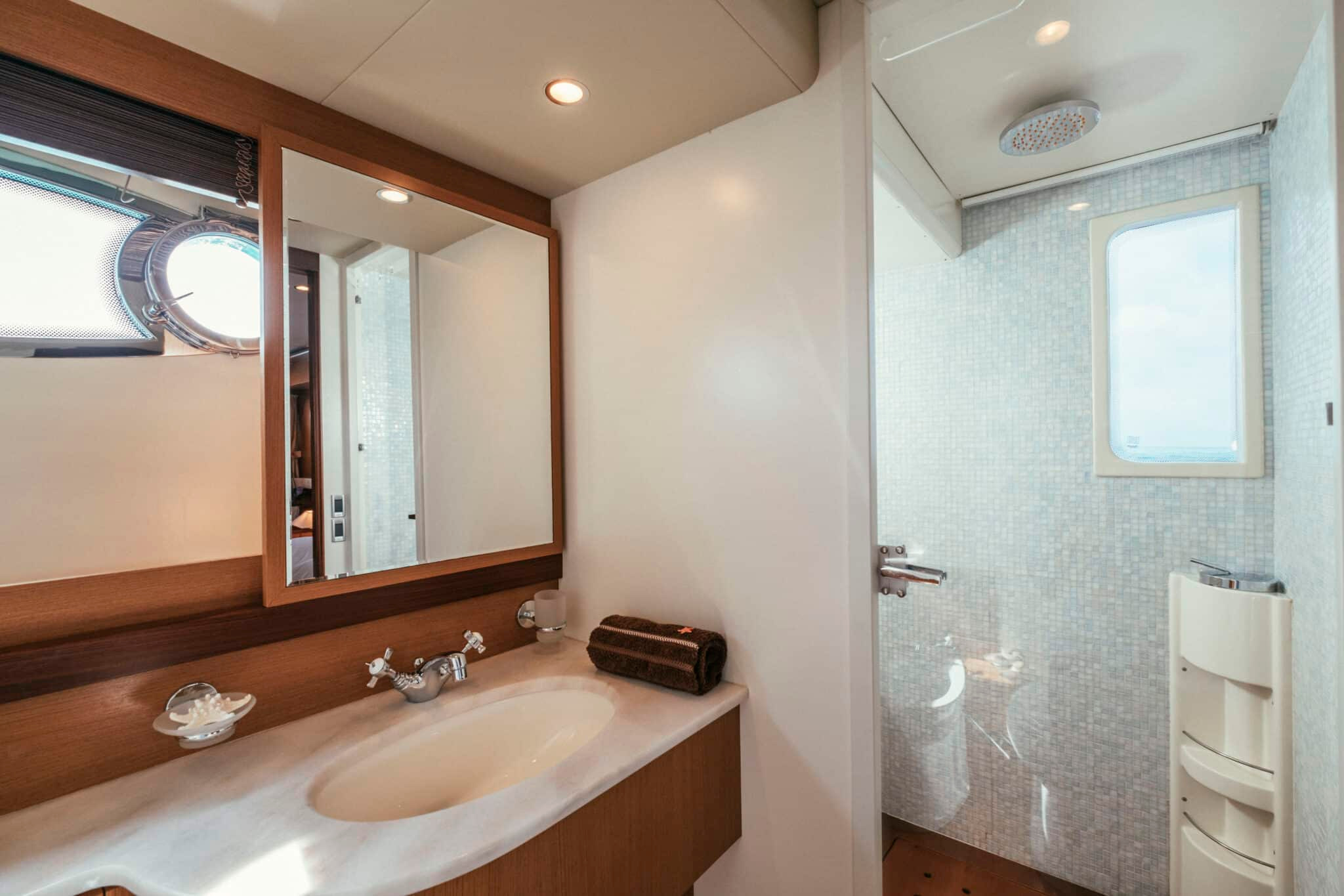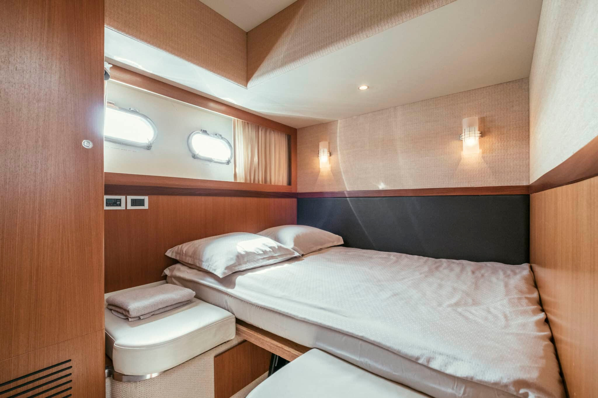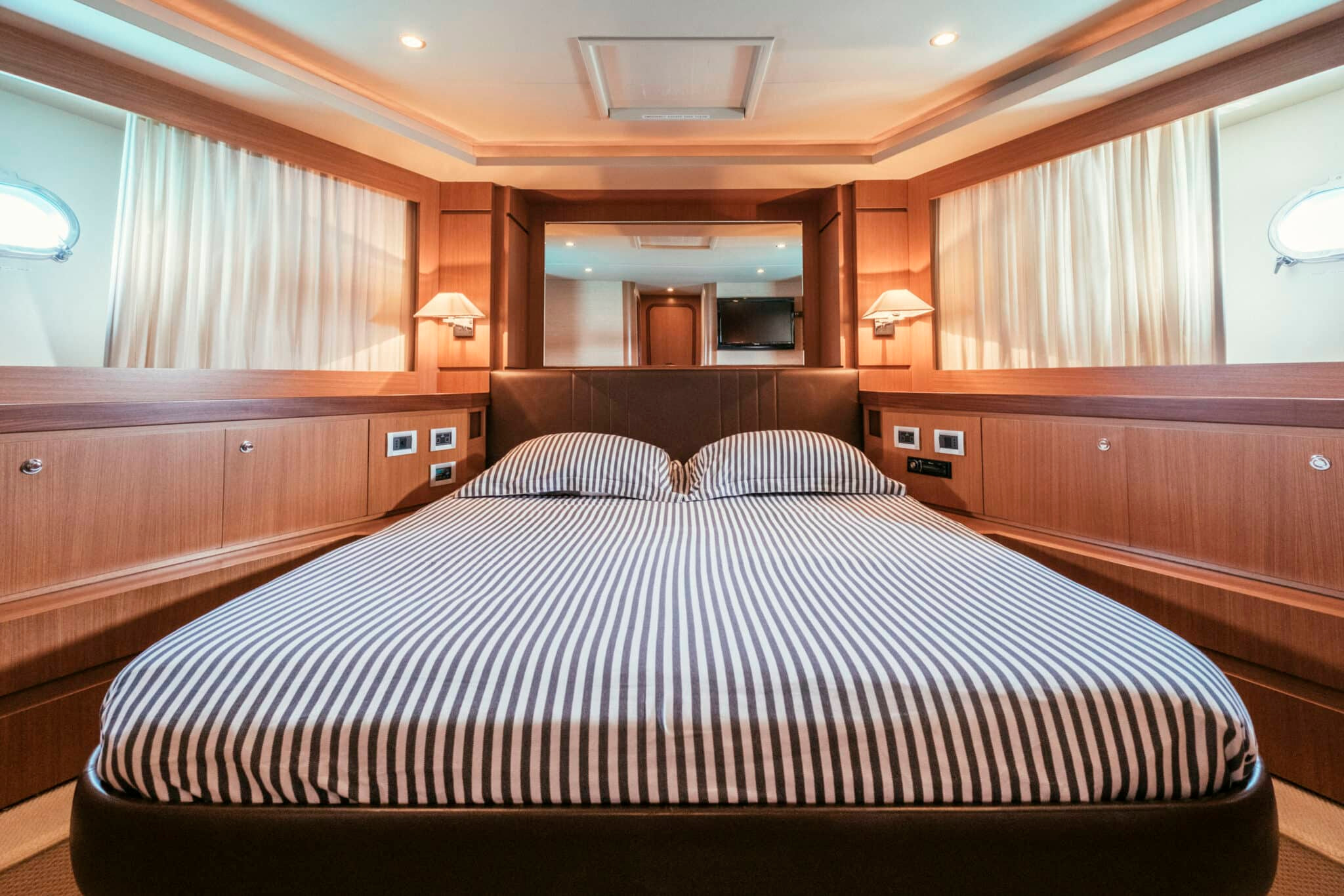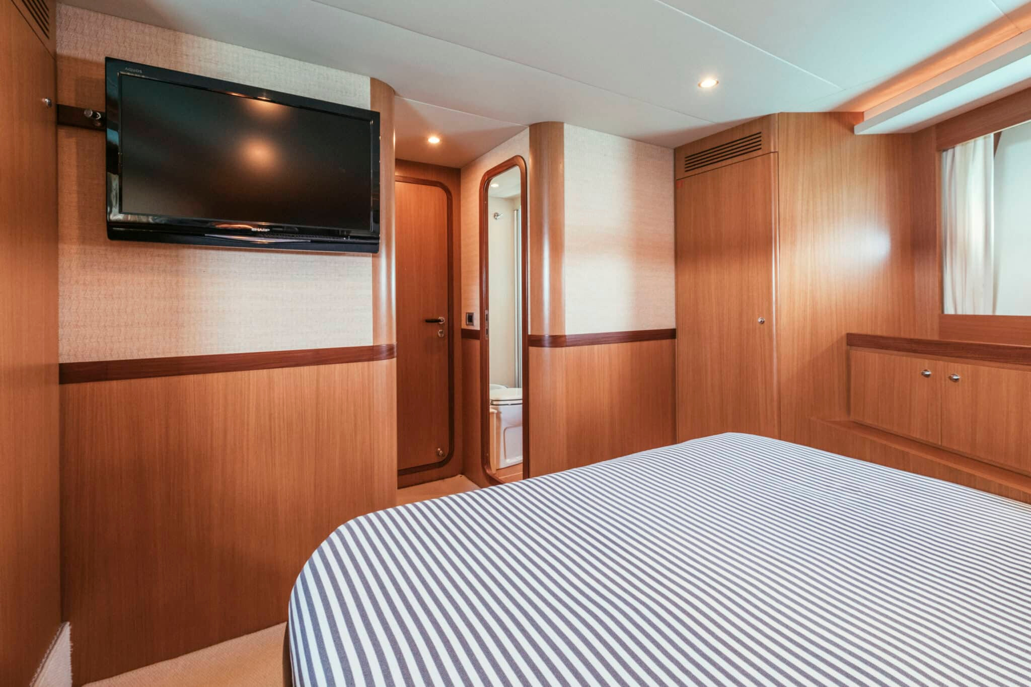 As you make your way to the main salon, you’ll discover a spacious lounge area perfect for entertaining guests or enjoying a peaceful moment alone. The lounge includes full entertainment systems to ensure you have everything you need for the ultimate relaxation experience. The formal dining area is located further forward in a raised position, providing panoramic views through large side windows that bring in ample natural light. Here, you can savor delicious meals while enjoying the stunning Mediterranean scenery. No wonder why so many choose to rent a Ferretti in France!