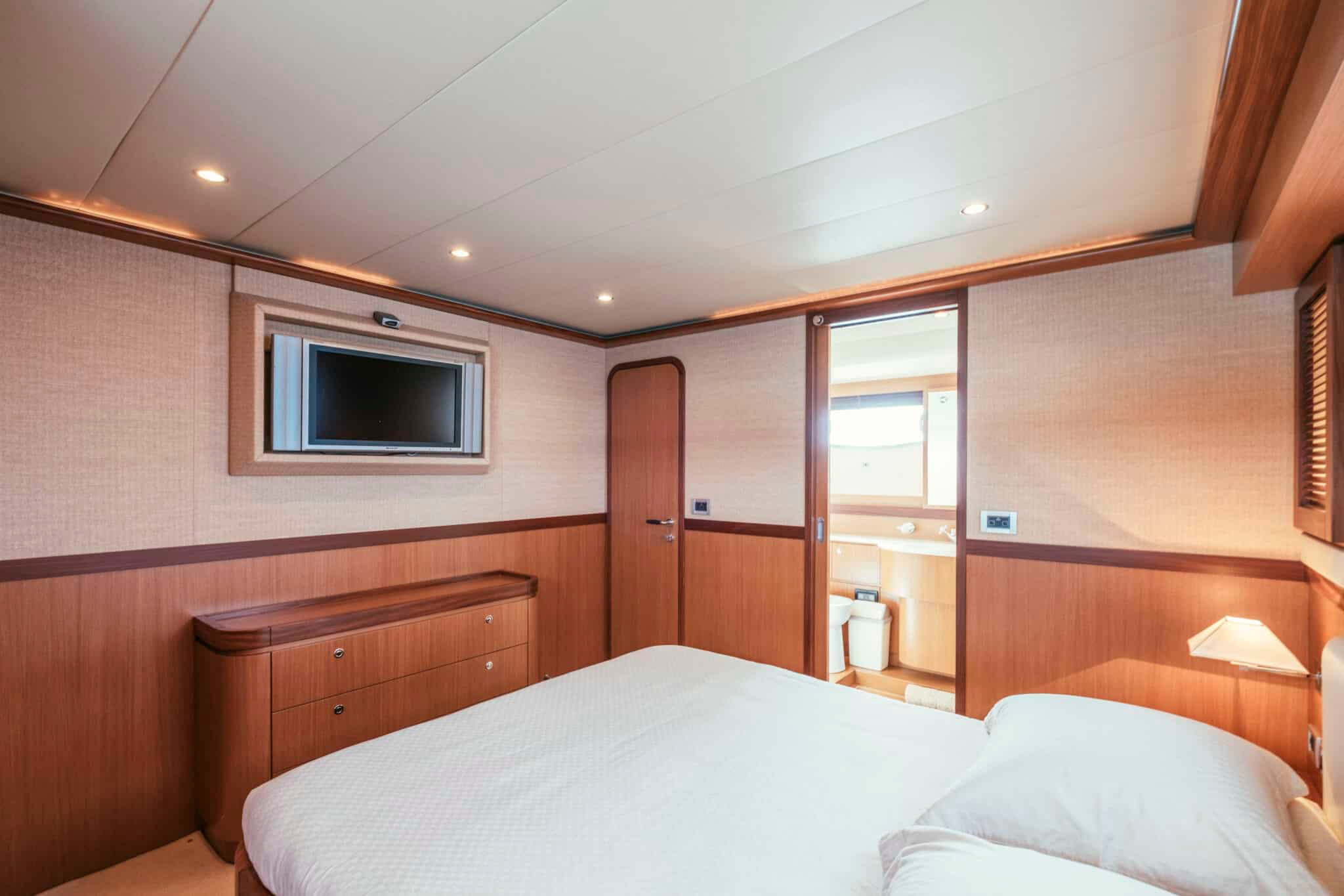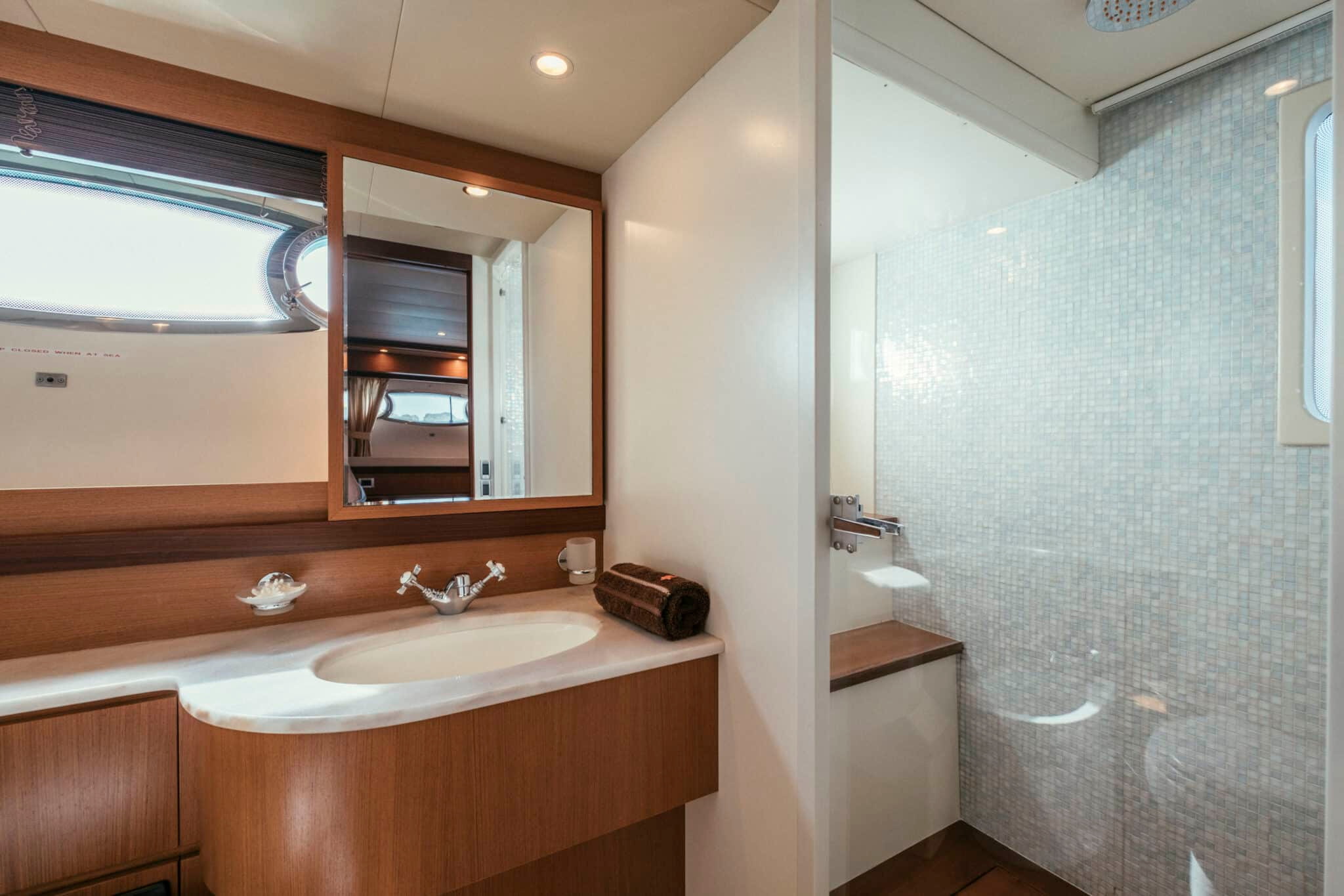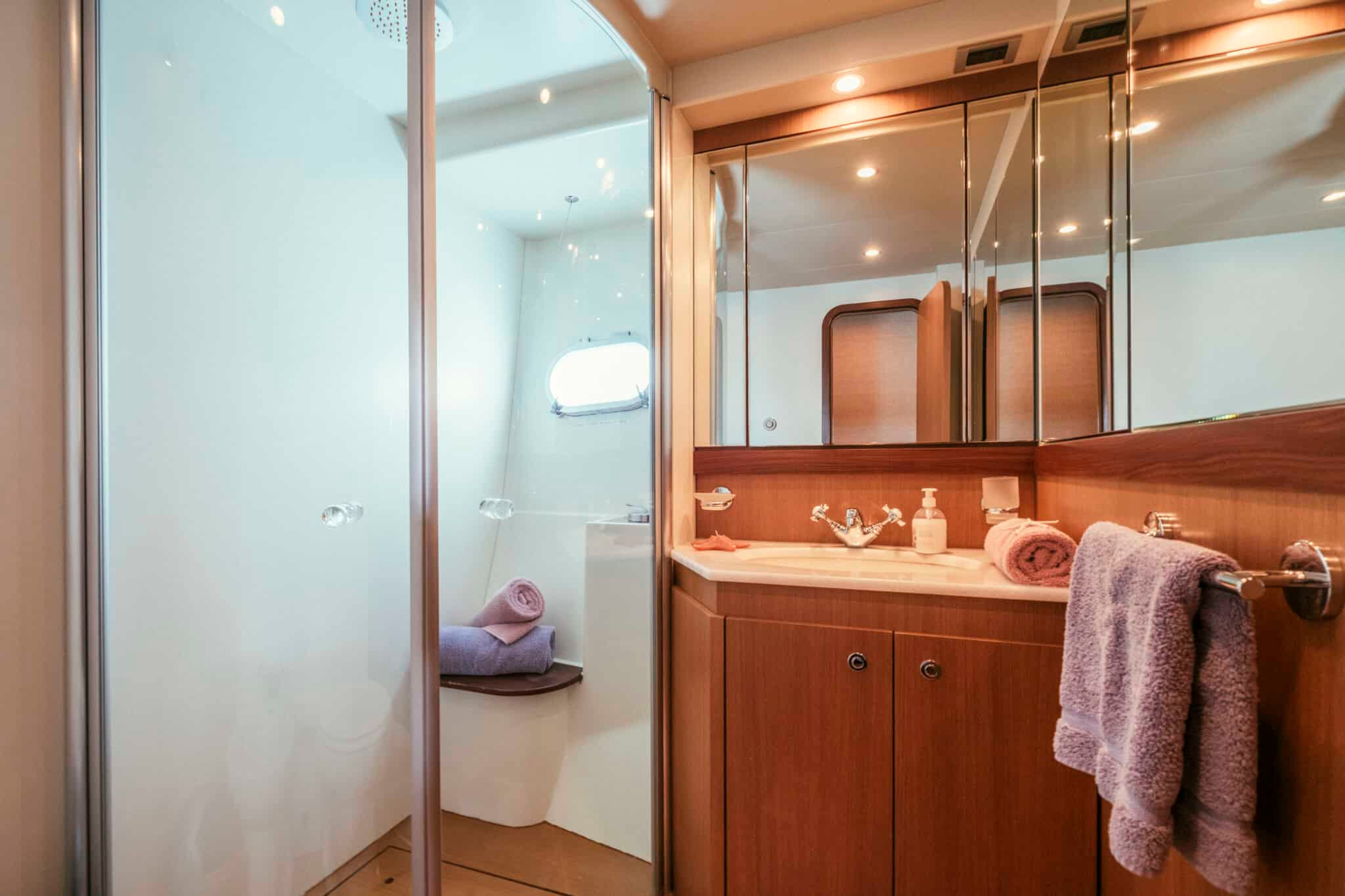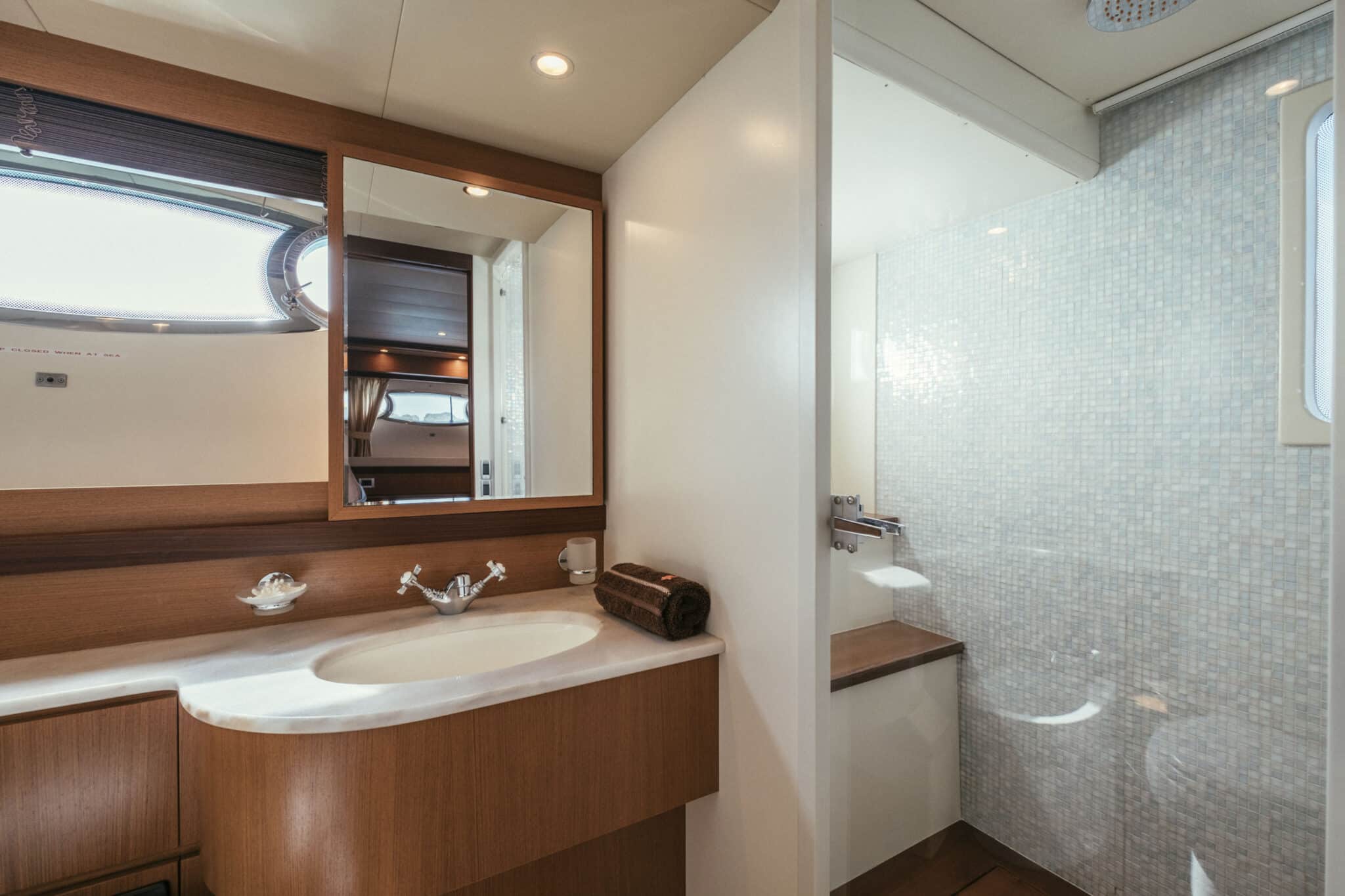 As you make your way to the main salon, you’ll discover a spacious lounge area perfect for entertaining guests or enjoying a peaceful moment alone. The lounge includes full entertainment systems to ensure you have everything you need for the ultimate relaxation experience. The formal dining area is located further forward in a raised position, providing panoramic views through large side windows that bring in ample natural light. Here, you can savor delicious meals while enjoying the stunning Mediterranean scenery. No wonder why so many choose to rent a Ferretti in France!
