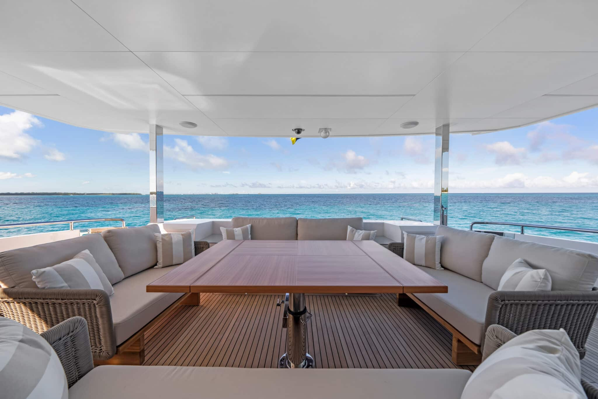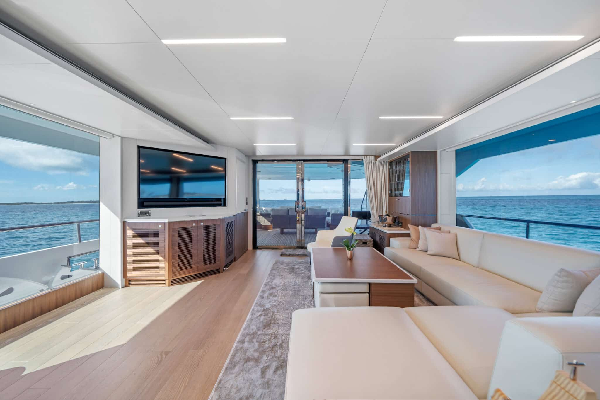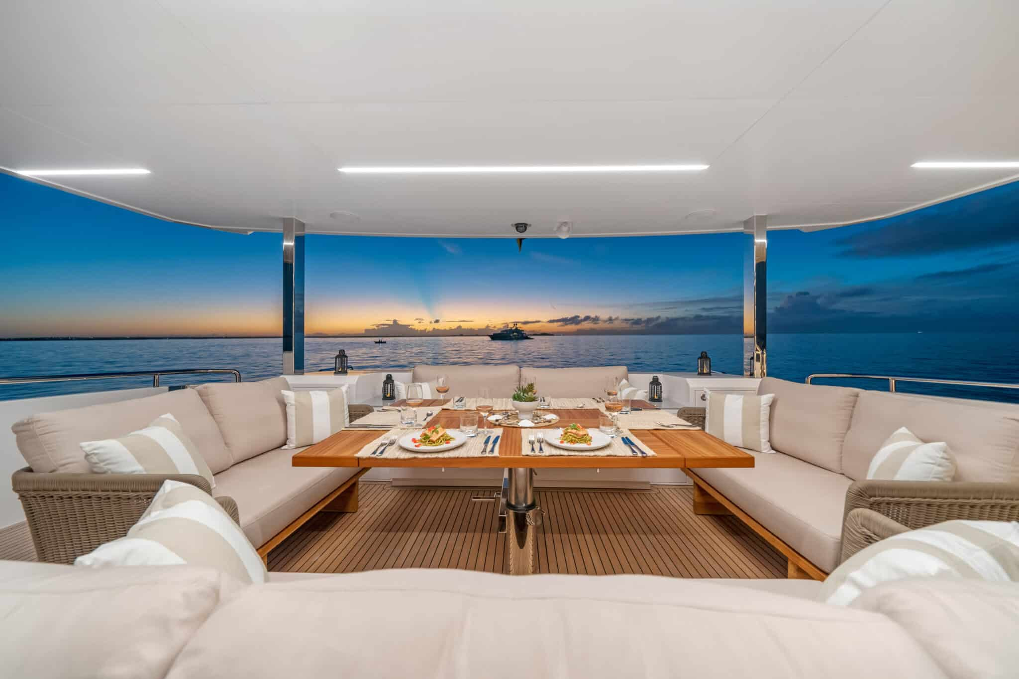 On board Rio Yacht Charter Caribbean, there are expansive interior and exterior spaces ensuring a luxurious and comfortable onboard experience. The interior is truly impressive. Furthermore, there is a living room area with beautiful couches, for moments when you seek respite from the sunlight. The large windows ensure that you do not miss out on any of the beautiful views when indoors. Outdoors, there is a spacious dining table where you and your guests can create unforgettable memories together, sheltered from the sun while taking in the breathtaking Caribbean scenery. Also, the outdoor jacuzzi is another way to take in these spectacular landscapes.