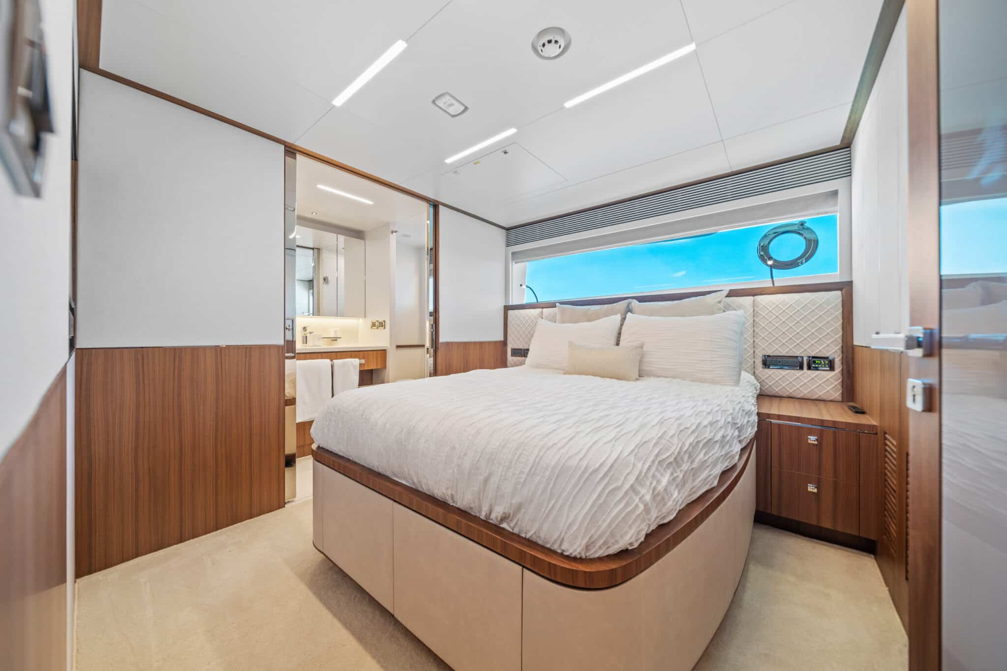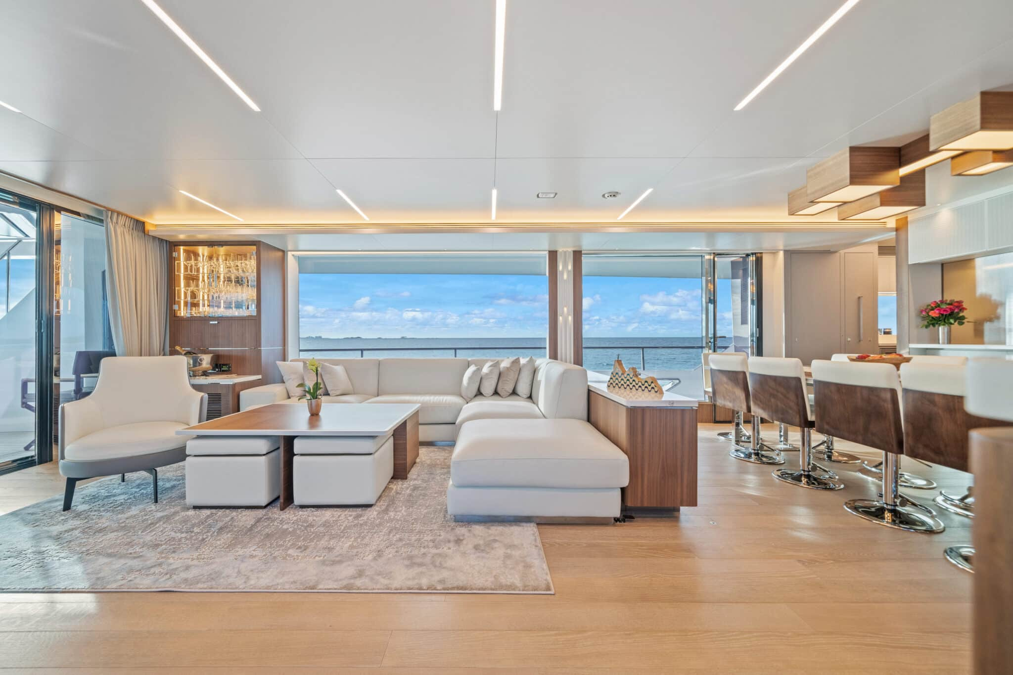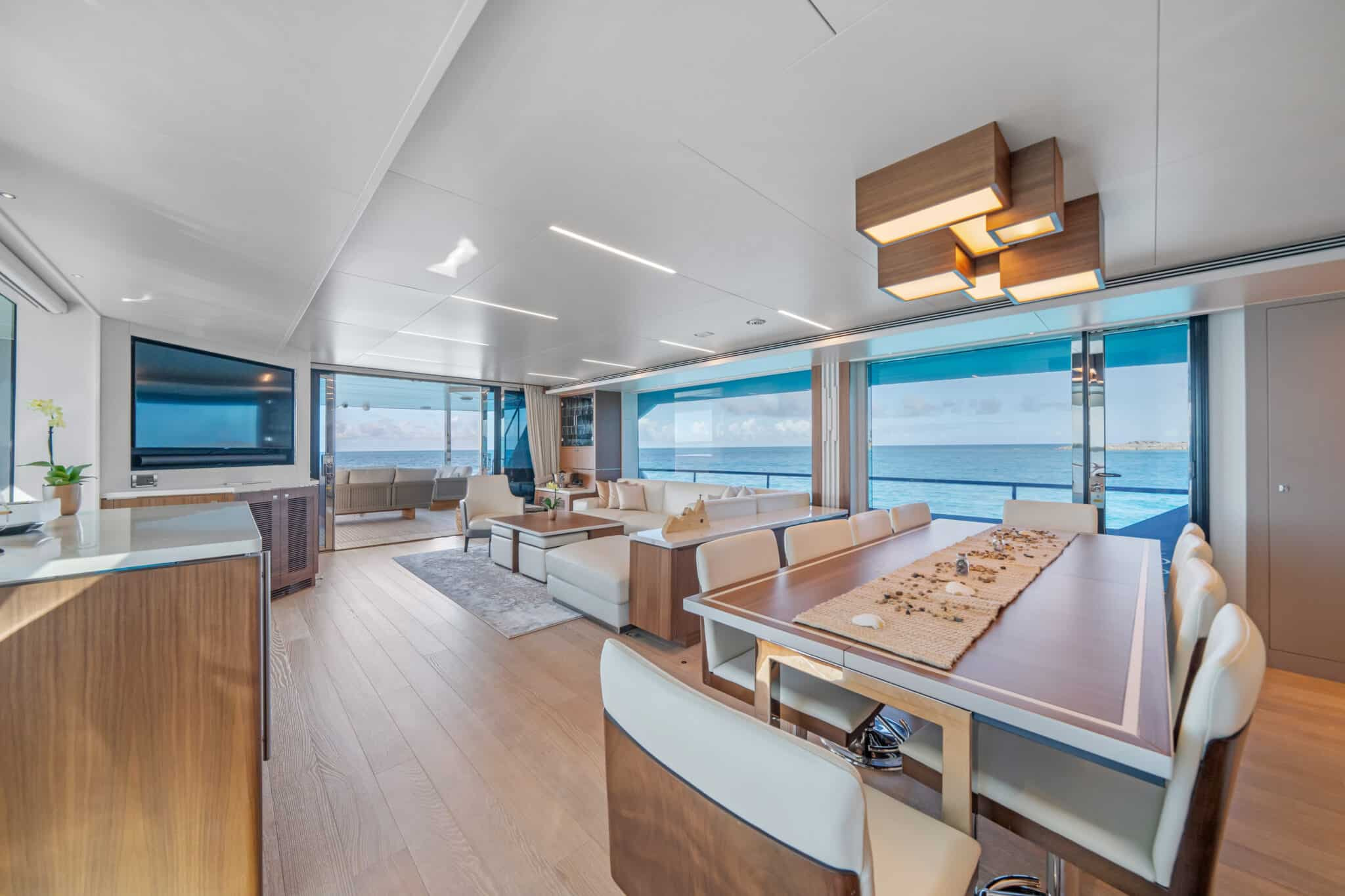 On board Rio Yacht Charter Caribbean, there are expansive interior and exterior spaces ensuring a luxurious and comfortable onboard experience. The interior is truly impressive. Furthermore, there is a living room area with beautiful couches, for moments when you seek respite from the sunlight. The large windows ensure that you do not miss out on any of the beautiful views when indoors. Outdoors, there is a spacious dining table where you and your guests can create unforgettable memories together, sheltered from the sun while taking in the breathtaking Caribbean scenery. Also, the outdoor jacuzzi is another way to take in these spectacular landscapes.