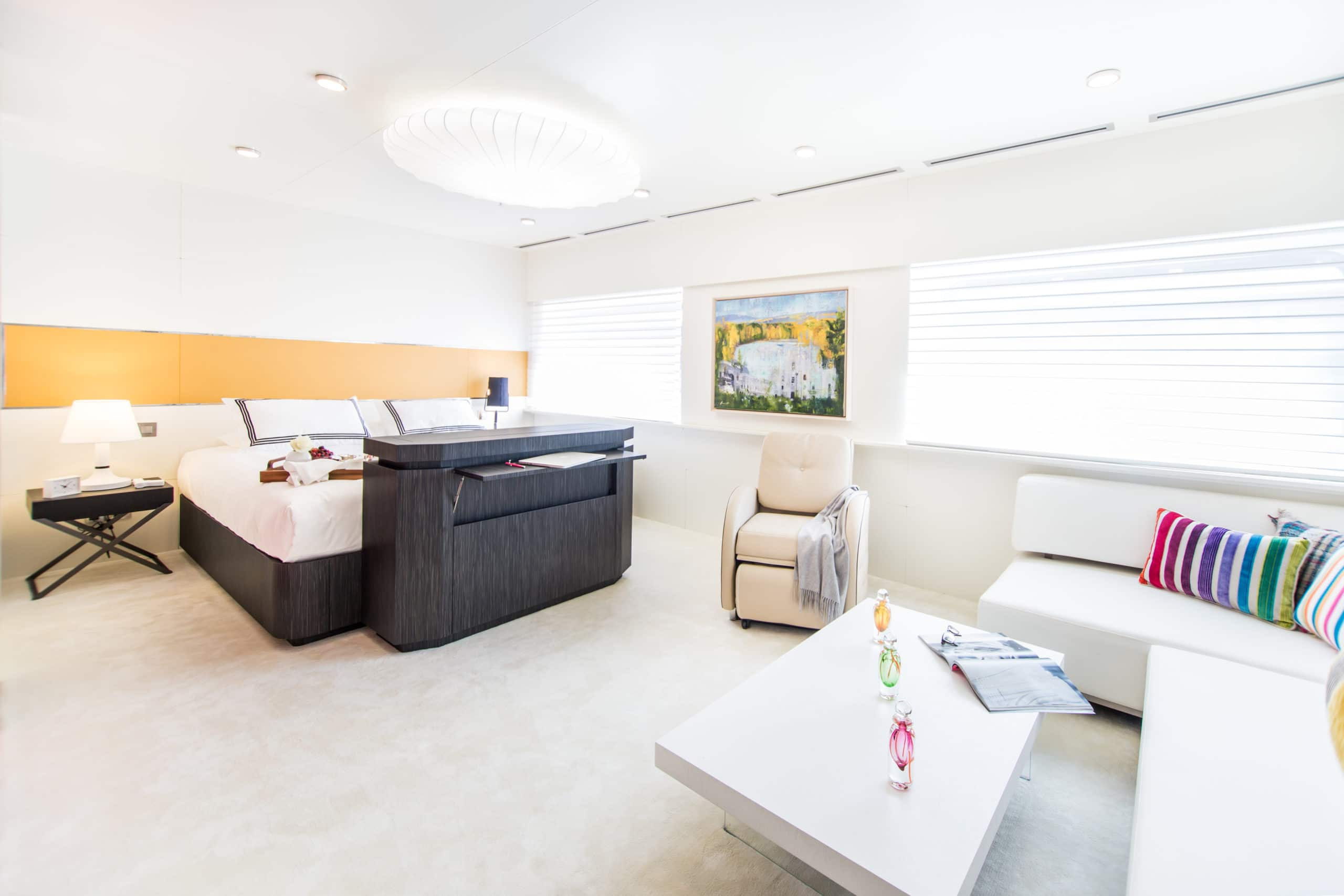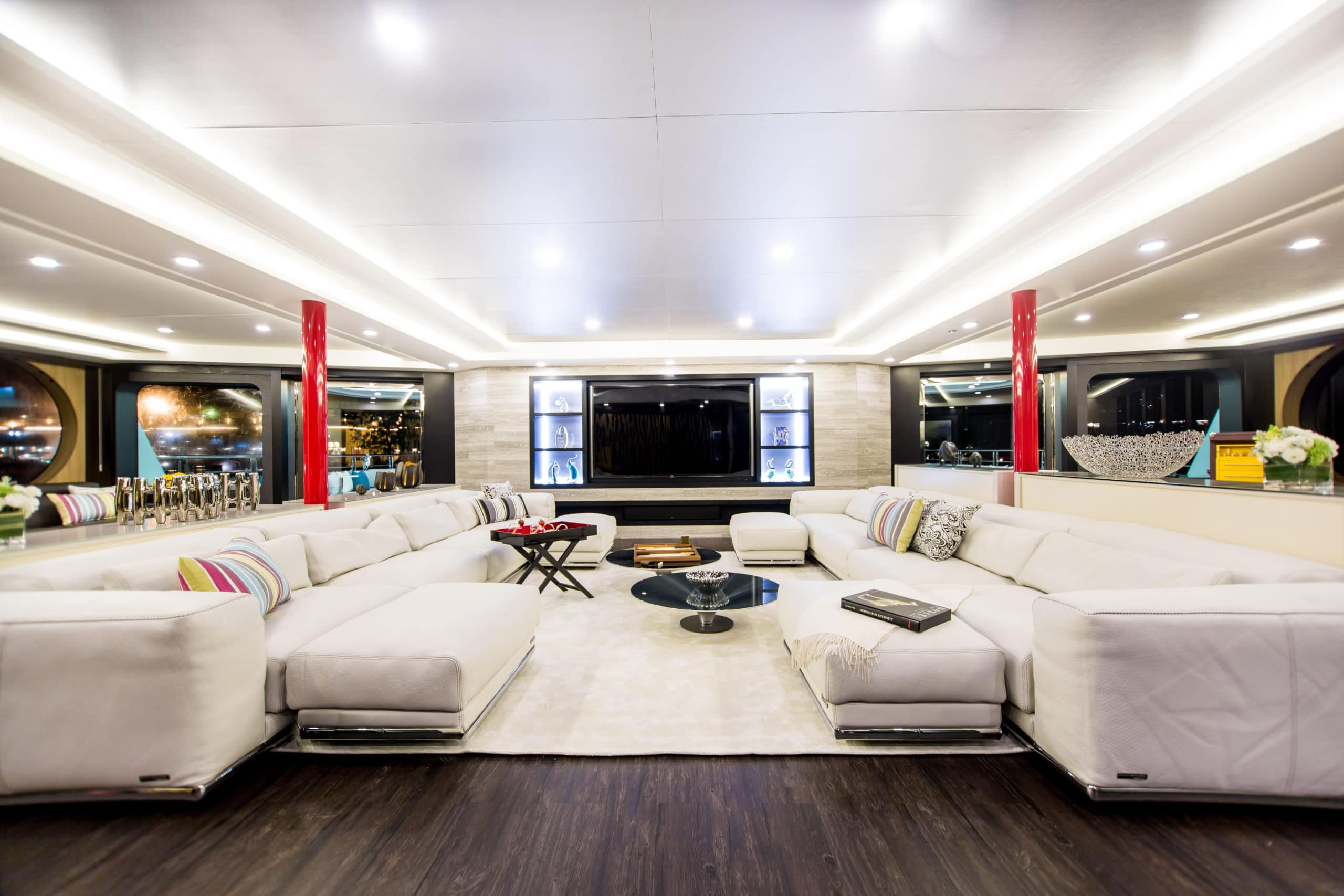 Boasting an aluminium hull and superstructure, this Super Yacht possesses an ultra-modern stabilization system which reduces roll motion effect and results in a smoother and more enjoyable cruising experience. She features ‘at anchor stabilizers’ which increase onboard comfort both while at anchor and at rough seas. With a cruising speed of 11 knots and a maximum speed of 14, Saluzi performs phenomenally well for a yacht of her size. She is also designed to offer privacy when desired or alternatively can encourage a more social arrangement. It’s bright bursts of color only add to its modern feel.