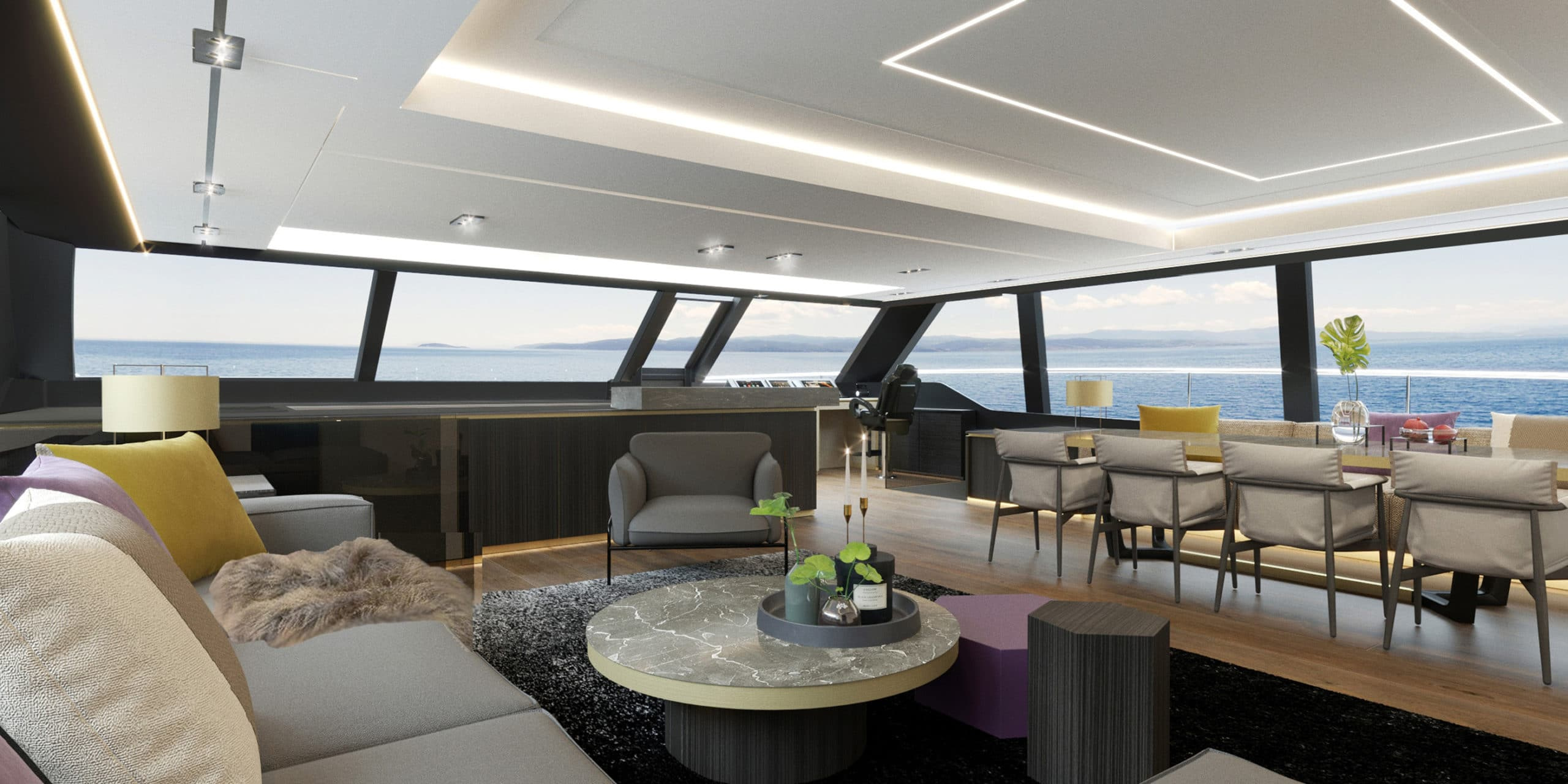 Moving inside of this luxury catamaran, you have a surprisingly spacious interior at your disposal, thanks to the immense volumes available in the hulls. This Sunreef 80 Charter catamaran can comfortably facilitate 8 guests in 4 deluxe en suite cabins and a luxurious master suite fully furnished with a desk, dressing area and opulent sofa. The immaculate cabins are decorated in a soft colour palette sure to provide a calm and relaxing atmosphere. The panoramic window layout allows guests to enjoy the yacht’s charming dining area with a table where up to 8 guests can enjoy gourmet meals while basking in the natural light.