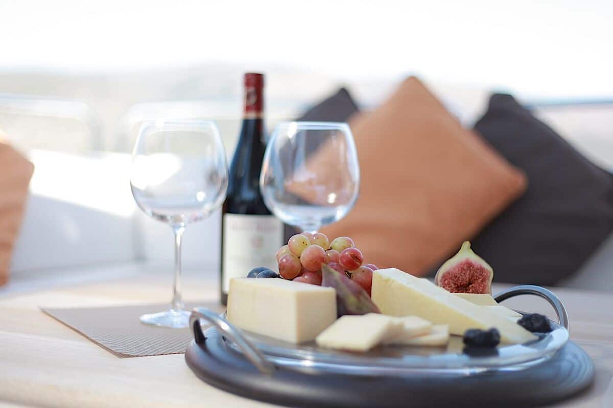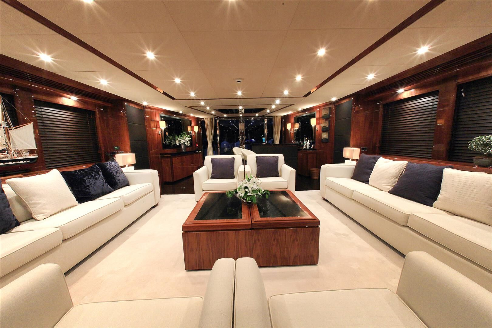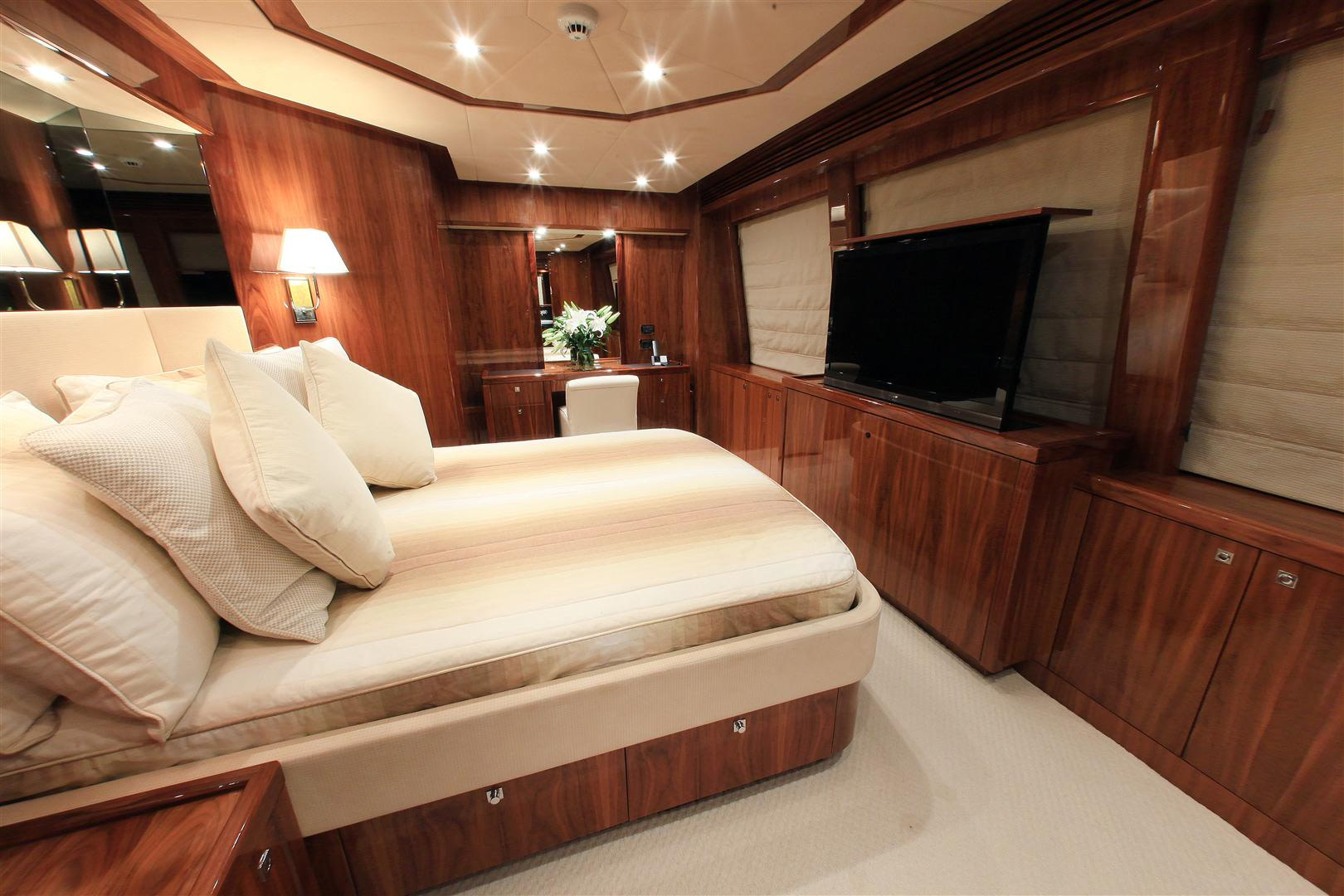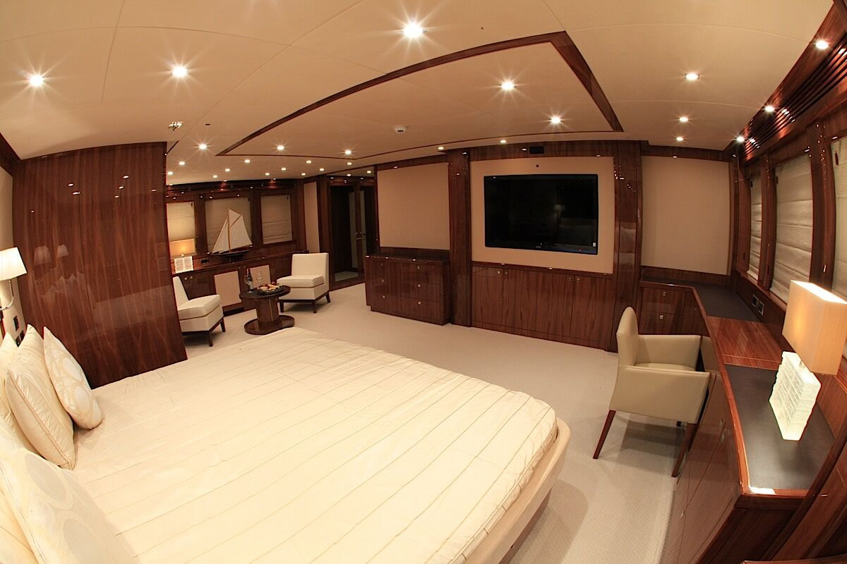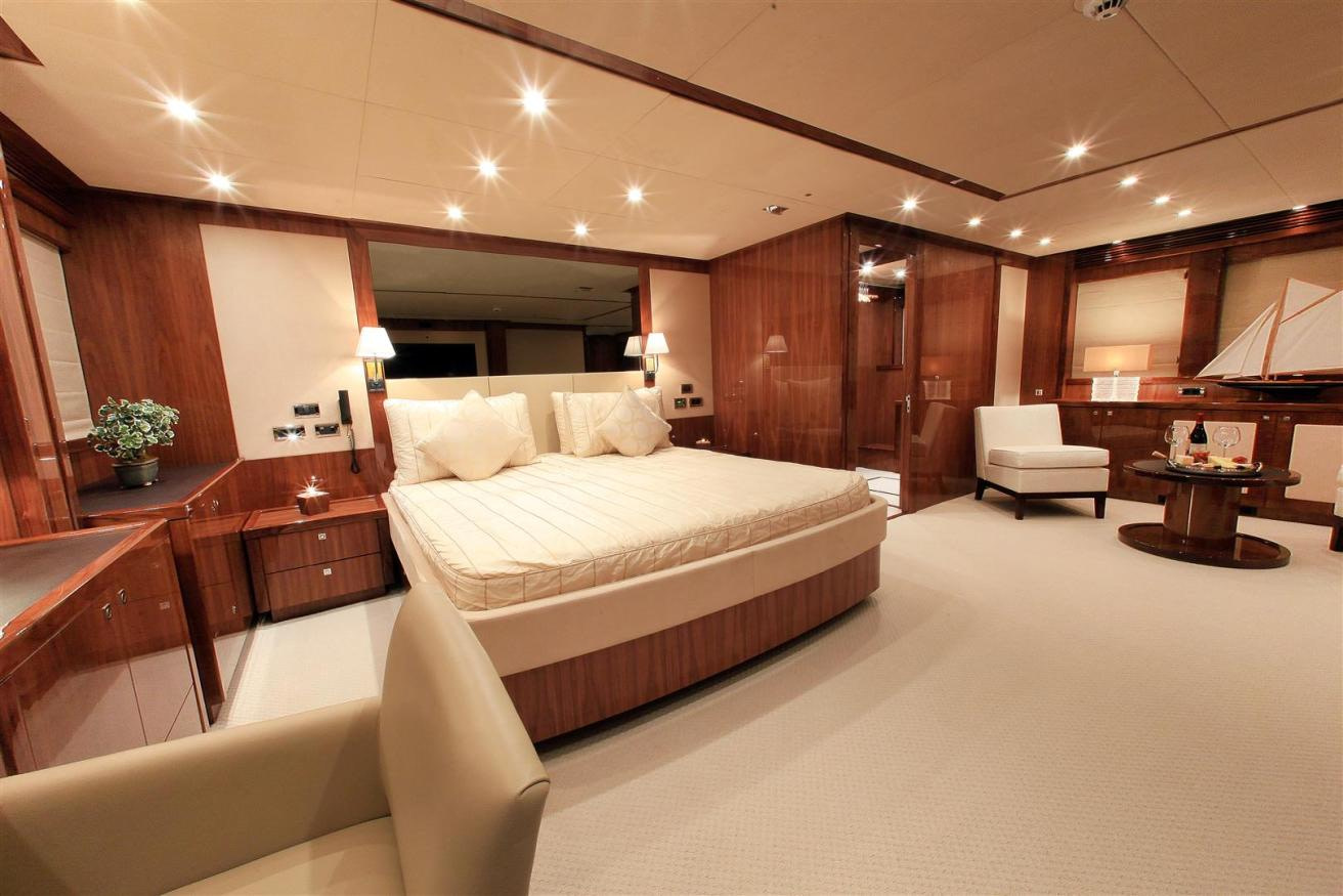 Entertaining space is a-plenty, with two impressive dining spaces on-board. On the upper-deck, an airy table is encircled by comfortable seating, making it the perfect place to enjoy a cocktail or to sample the lavish cuisine that the experienced crew devise. Another, larger dining table is on the main-deck. Also on the main-deck is a large, modern saloon, perfect for entertaining or relaxing. Dining can be enjoyed in luxury at the large, hard-wood table. On the upper deck, another, more cozy saloon can be found, featuring a large corner sofa and a flatscreen television.