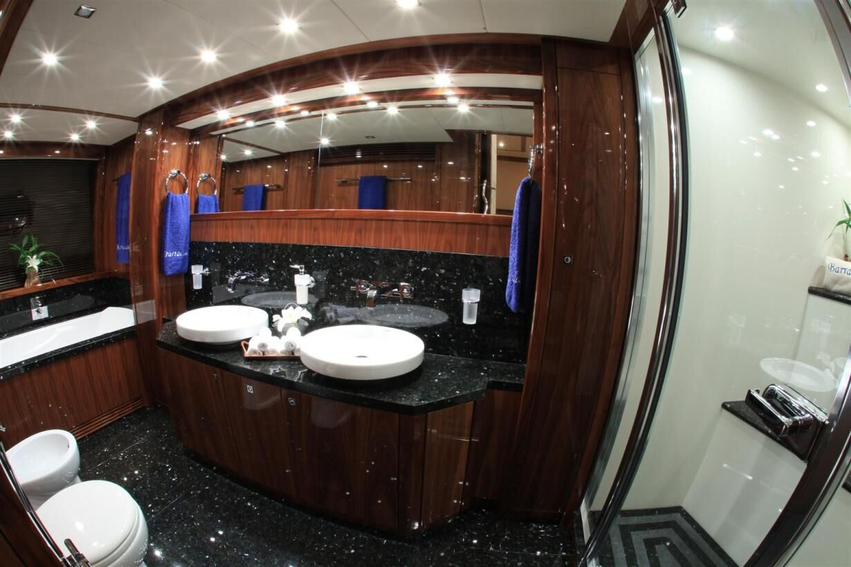 Boasting a total of 6 luxurious cabins, the Sunseeker 37m comfortably sleeps 12 guests, with a pullman (bunk-bed) accommodating one more if needs be. The master stateroom is simply gorgeous, offering staggering space and luscious décor. Her ensuite bathroom is large and fully equipped. A V.I.P. suite also showcases the heights of luxury and comfort, as do the 3 generous double cabins. The twin room is considerably spacious and features another tastefully designed bathroom. The choice of wood paneling that permeates the yacht is extremely handsome. On-board the Barracuda Red Sea, you and your guests will experience divine comfort and are sure to rest easy.