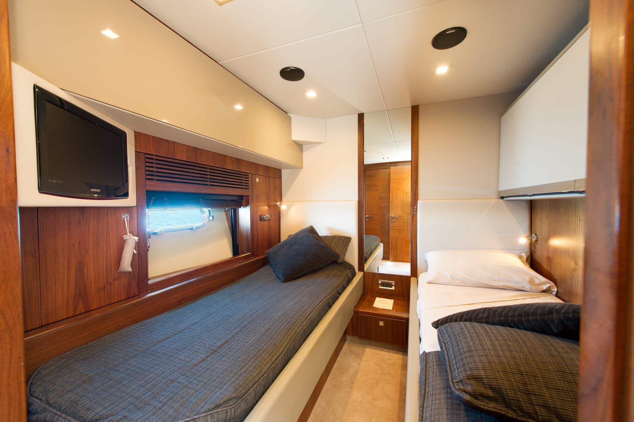 12 guests can cruise on this Sunseeker yacht charter Ibiza. 8 guests can sleep in 4 cabins. There are two double cabins and 2 twin cabins. A pullman can sleep an extra child if required. The master cabin features a TV, Bose lifestyle with Home cinema and surround system.